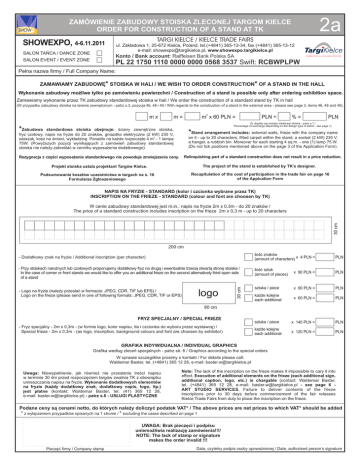 SHOW 2a ZAMÓWIENIE ZABUDOWY STOISKA ZLECONEJ TARGOM KIELCE ORDER FOR CONSTRUCTION OF A STAND AT TK TARGI KIELCE / KIELCE TRADE FAIRS SHOWEXPO, 4-6.11.2011 ul. Zakładowa 1, 25-672 Kielce, Poland, tel.(+4841) 365-13-34, fax (+4841) 365-13-12 e-mail: [email protected], www.showexpo.targikielce.pl SALON TAŃCA / DANCE ZONE Konto / Bank account: Raiffeisen Bank Polska SA SALON EVENT / EVENT ZONE EXHIBITION & CONGRESS CENTRE PL 22 1750 1110 0000 0000 0568 3537 Swift: RCBWPLPW Pełna nazwa firmy / Full Company Name: ZAMAWIAMY ZABUDOWĘ* STOISKA W HALI / WE WISH TO ORDER CONSTRUCTION* OF A STAND IN THE HALL Wykonanie zabudowy możliwe tylko po zamówieniu powierzchni / Construction of a stand is possible only after ordering exhibition space. Zamawiamy wykonanie przez TK zabudowy standardowej stoiska w hali / We order the construction of a standard stand by TK in hall (W przypadku zabudowy stoiska na terenie zewnętrznym - patrz s.3, pozycja 46, 48 i 49 / With regards to the construction of a stand in the external area - please see page 3, items 46, 48 and 49). mx m2 x 60 PLN = m= PLN + %= PLN (% dopłaty wg rodzaju lokalizacji stoiska - patrz s.1 / Percentage of surcharge depending on the design type of stand - see page 1) * Zabudowa standardowa stoiska obejmuje: ściany zewnętrzne stoiska, fryz czołowy, napis na fryzie do 20 znaków, gniazdko elektryczne (2 kW) 230 V, 2 wieszak, kosz na śmieci, wykładzinę. Ponadto na każde rozpoczęte 4 m - 1 lampa 75W. (Powyższych pozycji wynikających z zamówień zabudowy standardowej stoiska nie należy zakreślać w cenniku wyposażenia dodatkowego). * Stand arrangement includes: external walls, frieze with the company name on it - up to 20 characters, fitted carpet within the stand, a socket (2 kW) 230 V, a hanger, a rubbish bin. Moreover for each starting 4 sq.m. - one (1) lamp 75 W. (Do not tick positions mentioned above on the page 3 of the Application Form). Relinquishing part of a standard construction does not result in a price reduction. Rezygnacja z części wyposażenia standardowego nie powoduje zmniejszenia ceny. The project of the stand is established by TK’s designer. Projekt stoiska ustala projektant Targów Kielce. Recapitulation of the cost of participation in the trade fair on page 16 of the Applcation Form Podsumowanie kosztów uczestnictwa w targach na s. 16 Formularza Zgłoszeniowego NAPIS NA FRYZIE - STANDARD (kolor i czcionka wybrane przez TK) INSCRIPTION ON THE FRIEZE - STANDARD (colour and font are choosen by TK) 30 cm W cenie zabudowy standardowej jest m.in.: napis na fryzie 2m x 0,3m - do 20 znaków / The price of a standard construction includes inscription on the frieze 2m x 0,3 m - up to 20 characters 200 cm ilość znaków (amount of characters) x 4 PLN = PLN - Przy stoiskach narożnych lub czołowych proponujemy dodatkowy fryz na drugą i ewentualnie trzecią otwartą stronę stoiska / In the case of corner or front stands we would like to offer you an additional frieze on the second alternatively third open side of a stand ilość sztuk (amount of pieces) x 90 PLN = PLN sztuka / piece x 90 PLN = PLN każde kolejne each additional x 60 PLN = PLN sztuka / piece x 140 PLN = PLN każde kolejne each additional x 120 PLN = PLN logo - Logo na fryzie (należy przesłać w formacie: JPEG, CDR, TIF lub EPS) / Logo on the frieze (please send in one of following formats: JPEG, CDR, TIF or EPS) 30 cm - Dodatkowy znak na fryzie / Additional inscription (per character) 90 cm FRYZ SPECJALNY / SPECIAL FRIEZE - Fryz specjalny - 2m x 0,3m - (w formie logo, kolor napisu, tła i czcionka do wyboru przez wystawcę) / Special frieze - 2m x 0,3m - (as logo, inscription, background colours and font are choosen by exhibitor) GRAFIKA INDYWIDUALNA / INDIVIDUAL GRAPHICS Grafika według zleceń specjalnych - patrz str. 6 / Graphics according to the special orders W sprawie szczegółów prosimy o kontakt / For details please call: Waldemar Baster, tel. (+4841) 365 12 28, e-mail: [email protected] Uwaga: Niewypełnienie, jak również nie przesłanie treści napisu w terminie 30 dni przed rozpoczęciem targów zwalnia TK z obowiązku umieszczania napisu na fryzie. Wykonanie dodatkowych elementów na fryzie (każdy dodatkowy znak, dodatkowy napis, logo, itp.) jest płatne (kontakt: Waldemar Baster, tel. (41) 365 12 28, e-mail: [email protected]) - patrz s.6 - USŁUGI PLASTYCZNE Note: The lack of the inscription on the frieze makes it impossible to cary it into effect. Execution of additional elements on the frieze (each additional sign, additional caption, logo, etc.) is chargable (contact: Waldemar Baster, tel. (+4841) 365 12 28, e-mail: [email protected] - see page 6 ART STUDIO SERVICES. Failure to deliver contents of the frieze inscriptions prior to 30 days before commencement of the fair releases Kielce Trade Fairs from duty to place the inscription on the frieze. Podane ceny są cenami netto, do których należy doliczyć podatek VAT* / The above prices are net prices to which VAT* should be added * z wyłączeniem przypadków opisanych na 1 stronie / * excluding the cases described on page 1 UWAGA: Brak pieczęci i podpisu uniemożliwia realizację zamówienia!!!/ NOTE: The lack of stamp or signature makes the order invalid !!! Pieczęć firmy / Company stamp Data, czytelny podpis osoby upoważnionej / Date, authorised person’s signature