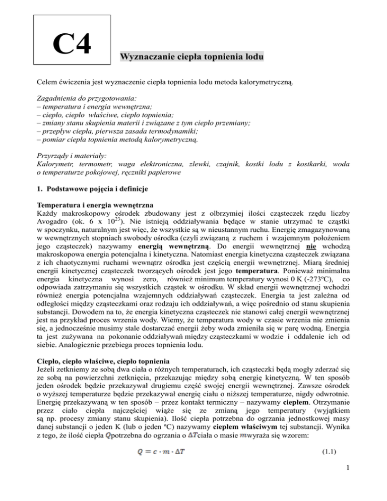 C4 Wyznaczanie ciepła topnienia lodu Celem ćwiczenia jest wyznaczenie ciepła topnienia lodu metoda kalorymetryczną. Zagadnienia do przygotowania: – temperatura i energia wewnętrzna; – ciepło, ciepło właściwe, ciepło topnienia; – zmiany stanu skupienia materii i związane z tym ciepło przemiany; – przepływ ciepła, pierwsza zasada termodynamiki; – pomiar ciepła topnienia metodą kalorymetryczną. Przyrządy i materiały: Kalorymetr, termometr, waga elektroniczna, zlewki, czajnik, kostki lodu z kostkarki, woda o temperaturze pokojowej, ręczniki papierowe 1. Podstawowe pojęcia i definicje Temperatura i energia wewnętrzna Każdy makroskopowy ośrodek zbudowany jest z olbrzymiej ilości cząsteczek rzędu liczby Avogadro (ok. 6 x 1023). Nie istnieją oddziaływania będące w stanie utrzymać te cząstki w spoczynku, naturalnym jest więc, że wszystkie są w nieustannym ruchu. Energię zmagazynowaną w wewnętrznych stopniach swobody ośrodka (czyli związaną z ruchem i wzajemnym położeniem jego cząsteczek) nazywamy energią wewnętrzną. Do energii wewnętrznej nie wchodzą makroskopowa energia potencjalna i kinetyczna. Natomiast energia kinetyczna cząsteczek związana z ich chaotycznymi ruchami wewnątrz ośrodka jest częścią energii wewnętrznej. Miarą średniej energii kinetycznej cząsteczek tworzących ośrodek jest jego temperatura. Ponieważ minimalna energia kinetyczna wynosi zero, również minimum temperatury wynosi 0 K (-273ºC), co odpowiada zatrzymaniu się wszystkich cząstek w ośrodku. W skład energii wewnętrznej wchodzi również energia potencjalna wzajemnych oddziaływań cząsteczek. Energia ta jest zależna od odległości między cząsteczkami oraz rodzaju ich oddziaływań, a więc pośrednio od stanu skupienia substancji. Dowodem na to, że energia kinetyczna cząsteczek nie stanowi całej energii wewnętrznej jest na przykład proces wrzenia wody. Wiemy, że temperatura wody w czasie wrzenia nie zmienia się, a jednocześnie musimy stale dostarczać energii żeby woda zmieniła się w parę wodną. Energia ta jest zużywana na pokonanie oddziaływań między cząsteczkami w wodzie i oddalenie ich od siebie. Analogicznie przebiega proces topnienia lodu. Ciepło, ciepło właściwe, ciepło topnienia Jeżeli zetkniemy ze sobą dwa ciała o różnych temperaturach, ich cząsteczki będą mogły zderzać się ze sobą na powierzchni zetknięcia, przekazując między sobą energię kinetyczną. W ten sposób jeden ośrodek będzie przekazywał drugiemu część swojej energii wewnętrznej. Zawsze ośrodek o wyższej temperaturze będzie przekazywał energię ciału o niższej temperaturze, nigdy odwrotnie. Energię przekazywaną w ten sposób – przez kontakt termiczny – nazywamy ciepłem. Otrzymanie przez ciało ciepła najczęściej wiąże się ze zmianą jego temperatury (wyjątkiem są np. procesy zmiany stanu skupienia). Ilość ciepła potrzebna do ogrzania jednostkowej masy danej substancji o jeden K (lub o jeden ºC) nazywamy ciepłem właściwym tej substancji. Wynika z tego, że ilość ciepła potrzebna do ogrzania o ciała o masie wyraża się wzorem: (1.1) 1 gdzie jest ciepłem właściwym. Jednostką ciepła właściwego jest . W przypadku procesów zmiany stanu skupienia, otrzymanie przez ciało ciepła nie skutkuje zmianą temperatury, a przemianą części lub całości ciała z jednego stanu skupienia do drugiego. Ilość ciepła potrzebna do przemiany jednostkowej masy danej substancji z ciała stałego w ciecz nazywamy ciepłem topnienia tej substancji. Wynika z tego, że ilość ciepła potrzebna do roztopienia ciała stałego o masie wyraża się wzorem: (1.2) gdzie jest ciepłem topnienia. Jednostką ciepła topnienia jest . Zmiany stanu skupienia materii i związane z tym ciepło przemiany Na Ziemi materia występuje w trzech stanach skupienia: jako gazy, ciecze i ciała stałe. Różnice własności fizycznych tych trzech stanów wynikają z odmiennej budowy cząsteczkowej. W stanie gazowym cząsteczki są daleko od siebie i słabo ze sobą oddziałują. W cieczach wzajemne oddziaływania są dużo silniejsze, a odległości między cząsteczkami są dużo mniejsze. Dopiero w ciałach stałych odległości międzycząsteczkowe są na tyle małe, że duże wzajemne oddziaływania wiążą cząsteczki/atomy w konkretnych położeniach. Z tymi rożnymi oddziaływaniami wiąże się energia potencjalna cząstek. Aby zmienić stan skupienia jakiejś substancji, np. stopić lód, trzeba dostarczyć tej substancji energię równą różnicy między energiami potencjalnymi jakie posiadają cząstki w początkowym stanie skupienia i w końcowym (np. w lodzie i w wodzie). Ze zmianą stanu skupienia wiąże się więc ciepło, które musi być dostarczone, aby dokonać przemiany fazowej (topnienie lodu), lub będzie wydzielane w wyniku przemiany (zamarzanie wody). Przepływ ciepła może być zrealizowany przez kontakt termiczny z innym ciałem o wyższej lub niższej temperaturze. W tym przypadku przepływ ciepła nie wiąże się ze zmianą temperatury. Z tego powodu ciepło przemiany jest często nazywane ciepłem utajonym. Po dostarczeniu ciepła do lodu znajdującego się w temperaturze topnienia cała otrzymana energia kinetyczna zostanie zużyta na rozrywanie wiązań pomiędzy cząsteczkami lodu, a więc na zwiększenie energii potencjalnej, a nie kinetycznej cząsteczek. Temperatura lodu pozostanie stała aż do całkowitej przemiany w ciecz. Jeżeli całe ciało przejdzie w stan ciekły, to przy dalszym dostarczaniu ciepła temperatura znowu zaczyna wzrastać. Podobne zachowanie obserwujemy przy dostarczaniu ciepła do cieczy. Początkowo jej temperatura rośnie, aż do osiągnięcia temperatury wrzenia. Dalsze ogrzewanie cieczy nie zmienia temperatury układu, powodując tylko gwałtowne parowanie cieczy (proces wrzenia). Po zamianie całej cieczy w parę, przy dalszym dostarczaniu ciepła temperatura ukł