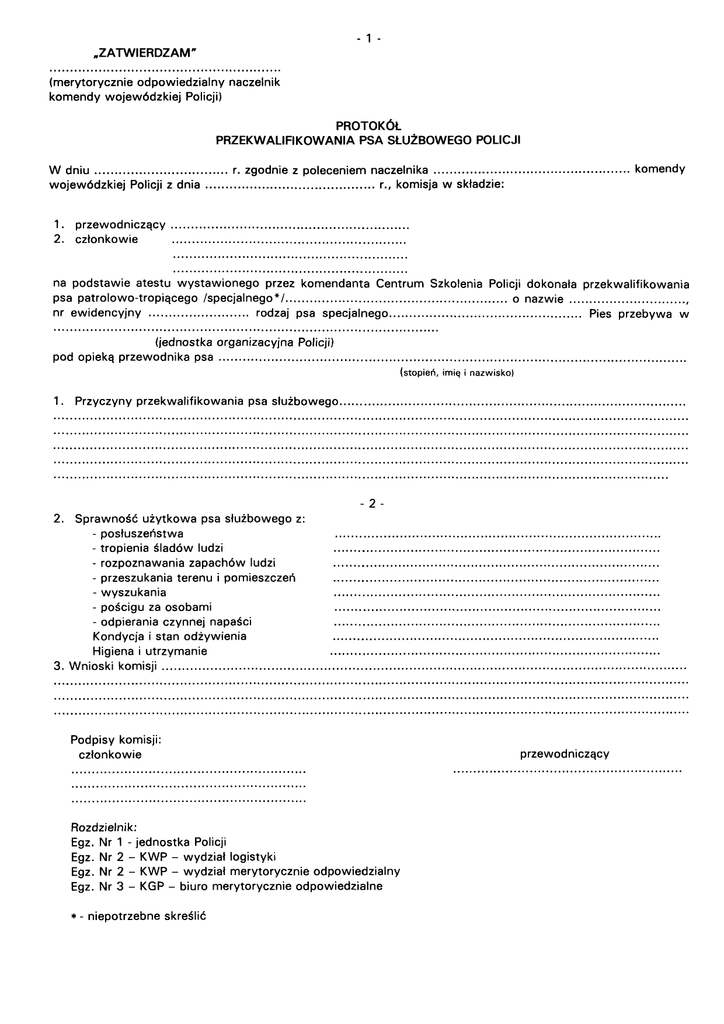 -1 - „ZATWIERDZAM" (merytorycznie odpowiedzialny naczelnik komendy wojewódzkiej Policji) PROTOKÓŁ PRZEKWALIFIKOWANIA PSA SŁUŻBOWEGO POLICJI W dniu ................................. r. zgodnie z poleceniem naczelnika ................................................. komendy wojewódzkiej Policji z dnia .......................................... r., komisja w składzie: 1. przewodniczący 2. członkowie na podstawie atestu wystawionego przez komendanta Centrum Szkolenia Policji dokonała przekwalifikowania psa patrolowo-tropiącego /specjalnego*/....................................................... o nazwie .............................. nr ewidencyjny ......................... rodzaj psa specjalnego................................................ Pies przebywa w (jednostka organizacyjna Policji) pod opieką przewodnika psa .......................................................................... (stopień, imię i nazwisko) 1. Przyczyny przekwalifikowania psa służbowego. - 2 2. Sprawność użytkowa psa służbowego z: - posłuszeństwa ............. - tropienia śladów ludzi .............. - rozpoznawania zapachów ludzi .............. - przeszukania terenu i pomieszczeń .............. - wyszukania .............. - pościgu za osobami ............. - odpierania czynnej napaści .............. Kondycja i stan odżywienia .............. Higiena i utrzymanie ............... 3. Wnioski komisji ........................................................ Podpisy komisji: członkowie Rozdzielnik: Egz. Nr 1 - jednostka Policji Egz. Nr 2 - KWP - wydział logistyki Egz. Nr 2 - KWP - wydział merytorycznie odpowiedzialny Egz. Nr 3 - KGP - biuro merytorycznie odpowiedzialne * - niepotrzebne skreślić przewodniczący