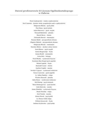 Dawni profesorowie II Liceum Ogólnokształcącego w Zabrzu Paweł Andrzejewski – wiedza o społeczeństwie Józef Antoniak – dyrektor szkoły, propedeutyka nauki o społeczeństwie Małgorzata Balicka – język polski Piotr Baran - język łaciński Antoni Barcewicz – język rosyjski Romuald Bardziński – plastyka Henryk Barow – chemia Aleksandra Berwid – matematyka Henryka Białek – przysposobienie obronne Zbigniew Bielecki – przysposobienie obronne Małgorzata Blaszke – matematyka Stanisław Bobow – dyrektor szkoły, historia Sonia Bohusz – język rosyjski Joanna Borgensztajn – fizyka Joanna Boufał – matematyka Iwona Bróz – biologia Paweł Buchta – wychowanie fizyczne Kazimiera Bury-Kargol język angielski Michał Capiński – fizyka Romuald Cwynar – chemia Joachim Czaplok – muzyka Jarosław Czypczar – wychowanie techniczne Teresa Czyżewska – język angielski ks. Adrian Dambiec – religia Wiesław Darewski – plastyka Adela Derner – wychowanie techniczne Rolf Detting – język niemiecki Maria Drobiazgiewicz – język łaciński Lidia Dylewska – muzyka Janina Dzbańska – wychowanie fizyczne Marek Dziemba – religia Józef Famula – muzyka Jolanta Głowik – język polski ks. Dariusz Gołek religia Elżbieta Grzeszczuk – fizyka Stefania Grzybowska – język polski Agnieszka Habasz-Sobala – biologia Marian Hrynczyszyn – wychowanie fizyczne Barbara Iwańska – język polski Mieczysław Jabłonka – chemia Halina Jagła – biologia Ewa Jałowiec – wychowanie techniczne Karolina Janicka – język rosyjski Czesław Kargol – język angielski Dominika Kempa – język angielski Karol Kirschner – matematyka ks.Stanisław Kołodziej – religia Kazimierz Konieczny – geografia Beata Kopiec – język polski Jolanta Koprowska – język niemiecki Abraham Kotok – fizyka Henryk Kowalski – historia Wacław Kozak – matematyka Waldemar Kramarczyk – język niemiecki Norbert Kroczek – muzyka Danuta Kruczkowska – dyrektor szkoły, historia Zofia Krzemińska – język angielski Kazimiera Krzemińska-Stiefel – język łaciński Aneta Kuhnel – język niemiecki Barbara Kupczak – język polski Ewa Kupik – język niemiecki Juliusz Kwiatek – przysposobienie obronne Henryka Kwiatek – fizyka Henryk Lasończyk – matematyka Wacława Łączna – fizyka Józef Ługowo – wychowanie fizyczne Bogumiła Maj – matematyka Janusz Markowski – matematyka ks. Robert Maszczyk – religia Marianna Mazur – język rosyjski Alicja Mazurek – wychowanie fizyczne Bogusław Mazurkiewicz – język angielski Grzegorz Mazurkiewicz – wiedza o społeczeństwie Maciej Mąderek – matematyka Beata Michałek – język łaciński Michał Molendowski – język angielski Ewa Mołdawa – chemia Romana Moralewicz – fizyka Irena Motykiewicz-Napierała – język rosyjski Janina Motylewicz – matematyka Krzysztof Możdżeń – geografia Józef Nawara – historia Józef Olejniczak – język polski Elżbieta Olszańska – historia Bożena Owczarzak – doradca zawodowy Jakub Padewski – język polski, wiedza o kulturze Ryszard Paluch – religia Maria Partyka – chemia Romana Pawlińska – biologia Teresa Pawłowska – język angielski Mieczysław Pilecki – przysposobienie obronne Piotr Pilot – język rosyjski Natalia Pilot język – rosyjski Janina Pirożek – biologia Anna Piszczelok – wychowanie fizyczne Zofia Poduszyńska-Michalska – biologia Aniela Prenzena – matematyka Maciej Prus – informatyka Jolanta Ratajczak – wychowanie fizyczne Adam Regiewicz – język polski Urszula Ritau – fizyka Jolanta Ryczko – chemia Stanisław Rymarowicz – fizyka Ewa Rytt-Cupiał – język polski Stefan Siedlecki – język polski Elżbieta Siemaszkiewicz – dyrektor szkoły, geografia Anna Skiendziel – wiedza o społeczeństwie Marta Sklorz – język niemiecki Danuta Sośnierz-Imielska – wychowanie techniczne Jacek Stefaniszyn – historia Józef Stetkiewicz – biologia Janina Stojak – wiedza o społeczeństwie Bronisława Studnicka – historia Małgorzata Studzińska – język niemiecki Joanna Szałasta – biologia Jacek Szarek – język angielski Grażyna Szelejewska – muzyka Ks. Tomasz Szumlas – religia Ewa Szmidt – muzyka Adam Szwedka – religia Barbara Śledzińska – matematyka Zbigniew Tabisz – język polski Jacek Tarka – język angielski Renata Teliszewska – język polski Janina Trociuk-Wiśniewska – geografia Wanda Urbańczyk – język francuski Maria Walczak – język rosyjski Stanisław Walków – przysposobienie obronne Joanna Warchoł – język polski, biblioteka Elżbieta Wesołek – historia Eugeniusz Wędrychowicz – geografia, przysposobienie obronne Zofia Wilska – język polski Justyna Wojciechowska – chemia Apolinary Wojnarowski – wychowanie fizyczne Aniela Woryna – język francuski Janina Ziarko – wychowanie techniczne Joanna Żurek-Gałka – religia