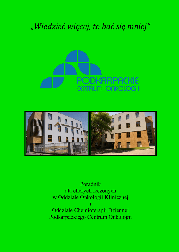 „Wiedzieć więcej, to bać się mniej” Poradnik dla chorych leczonych w Oddziale Onkologii Klinicznej i Oddziale Chemioterapii Dziennej Podkarpackiego Centrum Onkologii ODDZIAŁ ONKOLOGII KLINICZNEJ (017) 86-66-452 – gabinet lekarski (017) 86-66-463 – gabinet lekarski (017) 86-66-455 – lekarz dyżurny (017) 86-66-456 – pielęgniarka oddziałowa (017) 86-66-453 – dyżurka pielęgniarek (017) 86-66-454 – gabinet zabiegowy pielęgniarski (017) 86-66-451 – sekretariat medyczny (017) 86-66-467 – sekretariat medyczny (017) 86-66-490 – psycholog SALE CHORYCH (017) 86-66-553 – sala chorych nr 1 (017) 86-66-554 – sala chorych nr 2 (017) 86-66-585 – sala chorych nr 3 (017) 86-66-586 – sala chorych nr 4 (017) 86-66-587 – sala chorych nr 5 (017) 86-66-588 – sala chorych nr 6 (017) 86-66-589 – sala chorych nr 7 (017) 86-66-590 – sala chorych nr 8 (017) 86-66-582 – sala chorych nr 9 (017) 86-66-581 – sala chorych nr 10 (017) 86-66-583 – sala chorych nr 11 ODDZIAŁ DZIENNY CHEMIOTERAPII (017) 86-66-461 – gabinet pielęgniarski (017) 86-66-462 – sala podań chemioterapii 2 Drogi Pacjencie Zdiagnozowano u Ciebie chorobę nowotworową. Po szeregu badań zakwalifikowano Cię do rozpoczęcia chemioterapii. Znalazłeś się na Oddziale. Być może sporo już wiesz o swojej chorobie. Być może nie potrafisz się jeszcze pogodzić z jej istnieniem. Być może masz szereg pytań i wątpliwości dotyczących swojego dalszego leczenia, ale boisz się zapytać. Może wiele Ci wytłumaczono, ale nie dałeś rady zapamiętać wszystkich informacji. Może czegoś nie zrozumiałeś? Ten Poradnik został stworzony właśnie z myślą o Tobie. Napisaliśmy go po to, aby pomóc Ci zrozumieć na czym polega leczenie onkologiczne. Pamiętaj jednak, że zawsze możesz porozmawiać ze swoim lekarzem prowadzącym, który udzieli Ci wszelkich informacji dotyczących chemioterapii. Na początek kilka definicji… Co to jest nowotwór? Nowotwór jest złożonym procesem chorobowym, ściśle związanym z komórkami organizmu człowieka, najczęściej wyrażający się rozwojem guza, nacieku, owrzodzenia. W pewnym momencie Twoje komórki zaczynają się dzielić i rozmnażać w sposób niekontrolowany. Te zmienione komórki, czerpiąc z Twojego ustroju substancje odżywcze, doprowadzają do upośledzenia prawidłowej funkcji Twojego organizmu. 3 Mogą np. - tworzyć guz, który rozrastając się uciska ważne narządy, - powodować powiększenie węzłów chłonnych, - przedostawać się do innych części ciała drogą krwi lub chłonki, dzielić się tam, dając początek przerzutom. Nowotworem złośliwym nazywamy taki nowotwór, który nieleczony zawsze doprowadza do śmierci chorego. Większość nowotworów złośliwych nacieka sąsiednie tkanki i może dawać przerzuty do wątroby, płuc, kości, mózgu lub innych narządów. W przypadku nowotworów złośliwych istnieje także ryzyko wznowy czyli ponownego pojawienia się nowotworu nawet po kilku latach od wyleczenia. Co to jest rak? W słownictwie medycznym jest to nowotwór złośliwy wywodzący się z tkanki nabłonkowej. Nabłonki występują w każdej części organizmu. Wyścielają między innymi jamę ustną, drogi oddechowe, pokarmowe, moczowe, stąd tak duża jest różnorodność nowotworów pochodzenia nabłonkowego. Potocznie rakiem nazywamy wszystkie nowotwory złośliwe. Co to jest chłoniak? To złośliwy nowotwór układu chłonnego. Najczęściej objawia się powiększeniem węzłów chłonnych, wątroby lub śledziony. Co to jest czerniak? 4 To nowotwór złośliwy komórek barwnikowych skóry. Może występować też na błonach śluzowych lub w gałce ocznej. Co to jest mięsak? To nowotwór złośliwy wywodzący się z tkanek miękkich (tkanki łącznej, mięśniowej) oraz z układu szkieletowego (chrząstki, kości). * Przejdźmy teraz do głównego zagadnienia tego poradnika czyli odpowiedzi na pytania dotyczące chemioterapii. Jak działa chemioterapia? Cytostatyki działają wielokierunkowo. Generalnie mają za zadanie zakłócić zdolność mnożenia się i podziału komórek nowotworowych i doprowadzić do ich uszkodzenia i śmierci. Leki te działają ogólnoustrojowo i dzięki temu możemy leczyć również rozsiane nowotwory, czyli takie, kiedy stwierdza się przerzuty. Jakie są rodzaje chemioterapii? Metoda radykalna – mająca na celu całkowite wyleczenie chorego. Metoda uzupełniająca (adiuwantowa) - stosowana po radykalnym leczeniu operacyjnym czyli całkowitym usunięciu guza nowotworowego. Celem tego leczenia jest zmniejszenie prawdopodobieństwa nawrotu nowotworu. 5 Metoda wstępna ( indukcyjna, neoadiuwantowa) - stosowana u chorych, którzy mają miejscowo zaawansowany nowotwór. Jej celem jest umożliwienie przeprowadzenia radykalnego leczenia operacyjnego lub radioterapii poprzez zmniejszenie masy guza. Stosowana jest przed zabiegiem operacyjnym lub radioterapią. Metoda regionalna – podawanie chemioterapii do jamy opłucnej, jamy otrzewnej lub rdzenia kręgowego. Metoda paliatywna- dotyczy tych chorych, u których niemożliwe jest całkowite wyleczenie. Ma ona na celu zmniejszenie ilości i wielkości przerzutów lub guza nowotworowego, a także poprawę jakości życia chorego przez zmniejszenie dolegliwości związanych z nowotworem. Czy istnieje „chemia słaba i mocna” ? Drogi Pacjencie, lecząc Ciebie działamy według zaleceń obowiązujących w Europie. Mamy cały arsenał leków cytostatycznych, które są wykorzystywane w walce z chorobą nowotworową. Musisz wiedzieć, że leczenie jest dostosowywane konkretnie do Ciebie, do Twojej choroby, do wyników Twoich badań , do Twojego stanu ogólnego. Większość dawek leków cytostatycznych jest dobierana na podstawie współczynnika wyliczanego wg wzrostu i wagi, dlatego przed każdym kursem musimy Cię zważyć i zmierzyć. Błędem jest porównywanie dawek swoich leków do dawek innego pacjenta i przekonanie, że d