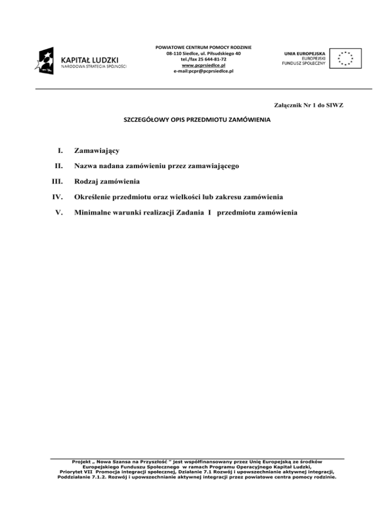 POWIATOWE CENTRUM POMOCY RODZINIE 08-110 Siedlce, ul. Piłsudskiego 40 tel./fax 25 644-81-72 www.pcprsiedlce.pl e-mail:[email protected] Załącznik Nr 1 do SIWZ SZCZEGÓŁOWY OPIS PRZEDMIOTU ZAMÓWIENIA I. II. Zamawiający Nazwa nadana zamówieniu przez zamawiającego III. Rodzaj zamówienia IV. Określenie przedmiotu oraz wielkości lub zakresu zamówienia V. Minimalne warunki realizacji Zadania I przedmiotu zamówienia Projekt „ Nowa Szansa na Przyszłość ” jest współfinansowany przez Unię Europejską ze środków Europejskiego Funduszu Społecznego w ramach Programu Operacyjnego Kapitał Ludzki, Priorytet VII Promocja integracji społecznej, Działanie 7.1 Rozwój i upowszechnianie aktywnej integracji, Poddziałanie 7.1.2. Rozwój i upowszechnianie aktywnej integracji przez powiatowe centra pomocy rodzinie. Przedmiot zamówienia: I. Zamawiający: Powiatowe Centrum Pomocy Rodzinie w Siedlcach, ul. Piłsudskiego 40, 08-110 Siedlce II. Nazwa nadana zamówieniu przez zamawiającego: Działania z zakresu aktywnej integracji i działania środowiskowe - II III.Rodzaj zamówienia: Usługi. Kody CPV 1). Kod CPV – 63511000-4 – organizacja wycieczek 2). Kod CPV – 55000000-0 – usługi hotelarskie, restauracyjne i handlu detalicznego IV. Określenie przedmiotu oraz wielkości lub zakresu zamówienia: Przeprowadzenie działań z zakresu aktywnej integracji dla uczestników projektu systemowego „Nowa Szansa na Przyszłość” w 2013 roku oraz działań środowiskowych realizowanych przez Powiatowe Centrum Pomocy Rodzinie w Siedlcach – w ramach Priorytetu VII Programu Operacyjnego Kapitał Ludzki, współfinansowanego przez Unię Europejską ze środków Europejskiego Funduszu Społecznego: Przedmiot zamówienia obejmuje: Zadanie I. Zorganizowanie Wyjazdu integracyjnego dla łącznie 59 osób - uczestników grupy wsparcia i otoczenia tj. środowiska rodzin zastępczych i dzieci wspólnie z nimi zamieszkujących wskazanych przez Powiatowe Centrum Pomocy Rodzinie w Siedlcach ( w dwóch grupach). Terminy realizacji zamówienia: 5 – 8 września 2013 r. - dla 30 osób 12-15 września 2013 r. – dla 29 osób Wyjazd integracyjny ma na celu zwiększenie integracji społecznej poprzez uczestnictwo w życiu społecznym środowiska rodzin zastępczych i dzieci wspólnie z nimi zamieszkujących. V. Minimalne wymagania realizacji Zadania I przedmiotu zamówienia. 1). Wykonawca przedstawi do składanej oferty szczegółowy program i zorganizuje wyjazd integracyjny z uwzględnieniem m.in.: Projekt „ Nowa Szansa na Przyszłość ” jest współfinansowany przez Unię Europejską ze środków Europejskiego Funduszu Społecznego w ramach Programu Operacyjnego Kapitał Ludzki, Priorytet VII Promocja integracji społecznej, Działanie 7.1 Rozwój i upowszechnianie aktywnej integracji, Poddziałanie 7.1.2. Rozwój i upowszechnianie aktywnej integracji przez powiatowe centra pomocy rodzinie. a) zwiedzania ciekawych miejsc i obiektów zabytkowych w odległości do 200 km od Siedlec – min 8 godzin w ciągu wyjazdu, b) wejście do parku rozrywki, aquaparku – minimum 2 wejścia po 3 godziny podczas wyjazdu, c) wieczór muzyki połączony z ogniskiem i grami zespołowymi dostosowanymi dla rodzin z dziećmi, d) gry i zabawy dla rodzin z dziećmi prowadzone przez animatora zabaw. 2). Miejsce szkolenia i zakwaterowania: Hotel/pensjonat/ośrodek: kategorii min. 2 gwiazdkowy w odległości do 200 km od Siedlec ( z wyłączeniem miasta Siedlce); pokoje maksymalnie 2-5 osobowe z pełnym węzłem sanitarnym, wyposażone w jednoosobowe łóżka wraz kompletem pościeli oraz szafę ubraniową; posiadający miejsce spożywania posiłków. Zapewnienie całodziennego wyżywienia składającego się z co najmniej trzech posiłków. Śniadania i kolacje uczestnicy będą przygotowywać samodzielnie. Bufet szwedzki powinien zawierać: wędliny, warzywa do kanapek (pomidor, ogórek, sałata, sałatki itp.), sery żółte, ser biały, dżemy, jogurty, mleko oraz płatki kukurydziane, pieczywo, masło, herbata). Obiady powinny składać się z 2 dań oraz soku lub kompotu i deseru. 3) Wykonawca zobowiązuje się do przewozu uczestników wyjazdu integracyjnego na miejsce wyjazdu z Siedziby Zamawiającego w uzgodnionym terminie oraz powrotnego przewozu uczestników po zakończonym wyjeździe, zgodnie z obowiązującymi przepisami dotyczącymi przewozu osób. Pojazd musi posiadać klimatyzację. Wykonawca zapewnia sprawdzenie stanu technicznego pojazdu przez policję w dniu wyjazdu. Kierowca musi posiadać wymagane przepisami dokumenty m.in. licencję przewoźnika. 4). Wykonawca zobowiązuje się do zapewnienia koordynatora wyjazdu oraz animatora zabaw, a także pilota lub przewodników lokalnych podczas zwiedzania miejsc zabytkowych. 5). Wykonawca zobowiązany jest do ubezpieczenia uczestników podczas trwania wyjazdu od następstw nieszczęśliwych wypadków powstałych w związku z udziałem w wyjeździe integracyjnym i w trakcie przejazdu według imiennej listy uczestników dostarczonej przez Zamawiającego. 6). Wykonawca udokumentuje przebieg wyjazdu integracyjnego w formie zdjęć- min. 30 sztuk i materiału audiowizualnego min. 30 minut. Projekt „ Nowa Szansa na Przyszłość ” jest współfinansowany przez Unię Europejską ze środków Europejskiego Funduszu Społecznego w ramach Programu Operacyjnego Kapitał Ludzki, Priorytet VII Promocja integracji społecznej, Działanie 7.1 Rozwój i upowszechnianie aktywnej integracji, Poddziałanie 7.1.2. Rozwój i upowszechnianie aktywnej integracji przez powiatowe centra pomocy rodzinie. Zadanie I.1. Zorganizowanie Wyjazdu integracyjnego dla 4 uczestników projektu z WTZ oraz otoczenia tj. 21 uczestników WTZ i 8 opiekunów osób wymagających całkowicie lub częściowo stałej lub długotrwałej opieki lub pomocy innej osoby w związku ze znacznie ograniczoną możliwością samodzielnej egzystencji, wskazanych przez Powiatowe Centrum Pomocy Rodzinie w Siedl