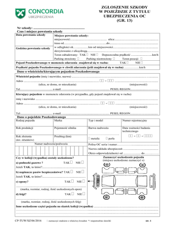 ZGŁOSZENIE SZKODY W POJEŹDZIE Z TYTUŁU UBEZPIECZENIA OC (GR. 13) Nr szkody: .............................................................. Czas i miejsce powstania szkody Data powstania szkody Miejsce powstania szkody: miejscowość:................................................ ulica:.......................................................... trasa od.........................................................do................................................................. Godzina powstania szkody w odległości ok…................km od miejscowości............................................................ skrzyżowanie z ulicą/drogą............................................................................................... Teren zabudowany: TAK NIE Dopuszczalna prędkość ............................km/h Parking strzeżony Parking niestrzeżony Teren posesji Pojazd Poszkodowanego w momencie zdarzenia znajdował się w ruchu: TAK NIE Prędkość pojazdu Poszkodowanego w chwili zdarzenia (jeśli znajdował się w ruchu) ……………km/h Dane o właścicielu/kierującym pojazdem Poszkodowanego Właściciel pojazdu (imię i nazwisko, nazwa) .................................................................................................... ............... Adres .................................................................................................... (ulica, nr domu, nr mieszkania) - .......................................................... (miejscowość) Tel…………………………... e-mail…............................................................. PESEL/REGON..................................... Kierujący pojazdem w momencie zdarzenia (w przypadku, gdy pojazd znajdował się w ruchu) imię i nazwisko ............................................................................................................. ...................................................... Adres ..................................................................................................... (ulica, nr domu, nr mieszkania) - ......................................................... (miejscowość) Tel:.......................................... e-mail…............................................................. PESEL/REGON..................................... Dane o pojeździe Poszkodowanego Rodzaj pojazdu Marka Typ i model Numer rejestracyjny Rok produkcji Pojemność silnika Barwa nadwozia Data ważności badania technicznego Rok złożenia Przebieg (km) …………………………. metalic (dot. składaków) Numer nadwozia/podwozia perła - - Polisa OC seria i numer……………................................... …………… Nazwa zakładu ubezpieczeń ............................................... . Czy w kolizji (wypadku) zostały uszkodzone? a) poduszki gazowe ? TAK NIE Okres odpowiedzialności od ....................... do……..……. Zaznaczyć uszkodzenie pojazdu (miejsce uszkodzone zaznaczyć x) Jeżeli TAK, to które?.......................................................... b) napinacze pasów bezpieczeństwa? TAK NIE Jeżeli TAK, to które?.......................................................... c) opony? TAK NIE ............................................................................................. (marka, rozmiar, rodzaj, ilość uszkodzonych opon) d) felgi? TAK NIE ............................................................................................. (marka, rozmiar, rodzaj, ilość uszkodzonych felg) Inne uszkodzone części pojazdu na skutek kolizji (wypadku) ...................................................................................... ……………………………………………………………….............................................................................................. ……………………………………………………………….............................................................................................. CP-TUW/SZ/06/2016 zaznaczyć znakiem x właściwy kwadrat */ niepotrzebne skreślić str. 1 Miejsce, gdzie znajduje się uszkodzony pojazd Adres (miejscowość, ulica, nr domu) ................................................................................................................................. Przeznaczenie pojazdu Poszkodowanego Pojazd służy do prowadzenia działalności gospodarczej, działalności rolniczej lub innej zawodowej działalności zarobkowej. TAK NIE Czy pojazd jest przedmiotem: a) zastawu */ cesji */ przeniesienia własności na bank*? TAK TAK Rodzaj działalności: ………………….………………... NIE NIE ………………………………………………………….. b) leasingu? Czy Poszkodowany jest pierwszym właścicielem Nazwa banku / leasingodawcy …………………………... pojazdu? TAK NIE ……………………………………………………………. ……………………………………………………………. NIE Oddział ………………………………………….……….. Czy pojazd został sprowadzony z zagranicy? TAK Adres……………………………………………………… Czy pojazd przed zgłoszoną szkodą miał nienaprawione uszkodzenia? TAK NIE Jeżeli TAK, to jakie? ………………………………….. …………………………………………………………. ……………………………………………………………. (ulica, nr domu, nr lokalu) ……………………………………………………………. (miejscowość) Czy Poszkodowany posiada ważną umowę ubezpieczenia dobrowolnego AC: TAK NIE Seria i nr polisy AC ........................................... wystawiona przez (nazwa zakładu ubezpieczeń).................................... ……………………………………………….. Okres odpowiedzialności ………………………………….………….. Czy powyższa szkoda została zg