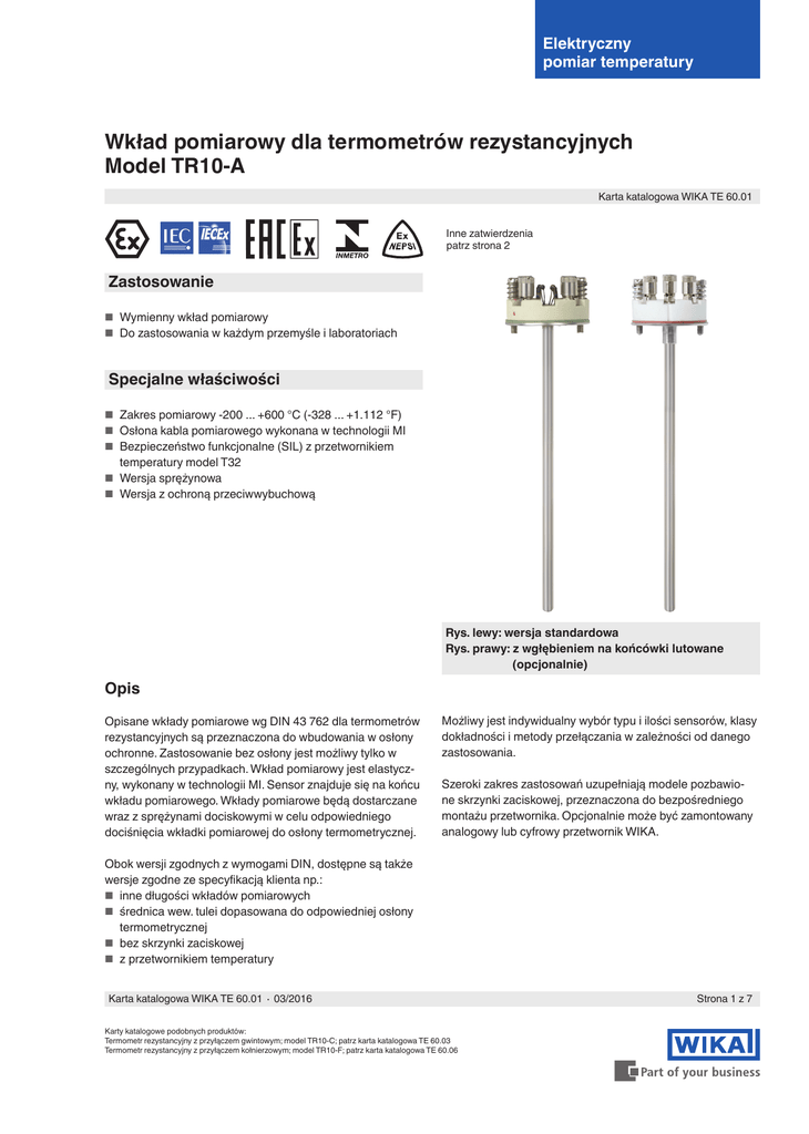 Elektryczny pomiar temperatury Wkład pomiarowy dla termometrów rezystancyjnych Model TR10-A Karta katalogowa WIKA TE 60.01 Inne zatwierdzenia patrz strona 2 Zastosowanie ■■ Wymienny wkład pomiarowy ■■ Do zastosowania w każdym przemyśle i laboratoriach Specjalne właściwości ■■ Zakres pomiarowy -200 ... +600 °C (-328 ... +1.112 °F) ■■ Osłona kabla pomiarowego wykonana w technologii MI ■■ Bezpieczeństwo funkcjonalne (SIL) z przetwornikiem temperatury model T32 ■■ Wersja sprężynowa ■■ Wersja z ochroną przeciwwybuchową Opis Opisane wkłady pomiarowe wg DIN 43 762 dla termometrów rezystancyjnych są przeznaczona do wbudowania w osłony ochronne. Zastosowanie bez osłony jest możliwy tylko w szczególnych przypadkach. Wkład pomiarowy jest elastyczny, wykonany w technologii MI. Sensor znajduje się na końcu wkładu pomiarowego. Wkłady pomiarowe będą dostarczane wraz z sprężynami dociskowymi w celu odpowiedniego dociśnięcia wkładki pomiarowej do osłony termometrycznej. Rys. lewy: wersja standardowa Rys. prawy: z wgłębieniem na końcówki lutowane (opcjonalnie) Możliwy jest indywidualny wybór typu i ilości sensorów, klasy dokładności i metody przełączania w zależności od danego zastosowania. Szeroki zakres zastosowań uzupełniają modele pozbawione skrzynki zaciskowej, przeznaczona do bezpośredniego montażu przetwornika. Opcjonalnie może być zamontowany analogowy lub cyfrowy przetwornik WIKA. Obok wersji zgodnych z wymogami DIN, dostępne są także wersje zgodne ze specyfikacją klienta np.: ■■ inne długości wkładów pomiarowych ■■ średnica wew. tulei dopasowana do odpowiedniej osłony termometrycznej ■■ bez skrzynki zaciskowej ■■ z przetwornikiem temperatury Karta katalogowa WIKA TE 60.01 ∙ 03/2016 Karty katalogowe podobnych produktów: Termometr rezystancyjny z przyłączem gwintowym; model TR10-C; patrz karta katalogowa TE 60.03 Termometr rezystancyjny z przyłączem kołnierzowym; model TR10-F; patrz karta katalogowa TE 60.06 Strona 1 z 7 Ochrona przeciwwybuchowa (opcjonlanie) Klasyfikacja/ dopasowanie urządzenia (dopuszczalna moc Pmax również dopuszczalna temperatura otoczenia) do odpowiednich kategorii, może być dołączony certyfikat badania EG, certyfikat Ex lub instrukcja obsługi. Uwaga: Wbudowane wkłady pomiarowe w następujących termometrach rezystancyjnych, modeleTR10-B, TR10-C, TR10-F lub TR81, można stosować w zależności od konstrukcji typie ochrony przed zapłonem „samoistnie bezpiecznym Ex i” oraz „niezapalającym Ex n”. W odpowiednich ochronnych oprawach mogą pracować w niebezpiecznych atmosferach pyłowych Ex. Stosowanie wkładu pomiarowego model TR10-A w obszarach zagrożonych wybuchem bez odpowiedniej ochronnej oprawie jest niedopuszczalne. Aprobaty (ochrona przeciwybuchowa, inne zatwierdzenie) Logo Opis Deklaracja zgodności WE Dyrektywa EMC1) EN 61326 emisja (grupa 1, klasa B) i odporność na zakłocenia (obszar przemysłowy) Kraj Wspólnota Europejska Dyrektywa ATEX (opcjonalnie) Obszary zagrożone wybuchem - Ex i strefa 1 gaz [II 2G Ex ia IIC T3 ... T6 Gb] - Ex n strefa 2 gaz [II 3G Ex nA IIC T1 ... T6 Gc X] - - IECEx (opcjonalnie) (w połączeniu z ATEX) Obszary zagrożone wybuchem - Ex i strefa 1 gaz [Ex ia IIC T3 ... T6 Gb] IECEx- Państwa członkowskie EAC (opcjonalnie) Obszary zagrożone wybuchem - Ex i strefa 1 gaz [1 Ex ib IIC T3/T4/T5/T6] - Ex n strefa 2 gaz [Ex nA IIC T6 ... T1] Euroazjatycka Wspólnota Gospodarcza INMETRO (opcjonalnie) Obszary zagrożone wybuchem - Ex i strefa 1 gaz [Ex ib IIC T3 ... T6 Gb] Brazylia NEPSI (opcjonalnie) Obszary zagrożone wybuchem - Ex i strefa 1 gaz [Ex ib IIC T3 ~ T6] - Ex n strefa 2 gaz [Ex nA IIC T1 ~ T6 Gc] Chiny KOSHA (opcjonalnie) Obszary zagrożone wybuchem - Ex i strefa 1 gaz [Ex ib IIC T4 ... T6] Korea Południowa PESO (opcjonalnie) Obszary zagrożone wybuchem - Ex i strefa 1 gaz [Ex ib IIC T3 ... T6 Gb] Indie GOST Certyfikat metrologii/ techniki pomiaru Rosja KazInMetr Certyfikat metrologii/ techniki pomiaru Kazachstan MTSCHS Pozwolenie na uruchomienie Kazachstan BelGIM Certyfikat metrologii/ techniki pomiaru Białoruś Uzbekistan Certyfikat metrologii/ techniki pomiaru Uzbekistan 1) Tylko z wbudowanymi przetwornikami Strona 2 z 7 Karta katalogowa WIKA TE 60.01 ∙ 03/2016 Informacje producenta i certyfikaty Logo NAMUR Opis NAMUR NE24 Obszary zagrożone wybuchem (Ex i) Urządzenia oznaczone znakiem bezpieczeństwa „ia“ mogą być stosowane w obszarach, w których wymagane są urządzenia z zabezpieczeniem „ib“ lub „ic“. Jeżeli urządzenie ze znakiem bezpieczeństwa „ia“ zastosujemy w obszarze, gdzie jest wymagane urządzenia z ochroną typu „ib“ lub „ic“, nie możemy go ponownie użyć w obszarze gdzie wymagane jest zabezpieczenie zgodne z „ia“. W przypadku dostaw do krajów WNP i Ukrainie wymagany jest paszport (opis urządzeń), który wystawiany jest do zamówienia. Zatwierdzenia i certyfikaty dostępne są na stronie internetowej Karta katalogowa WIKA TE 60.01 ∙ 03/2016 Strona 3 z 7 Sensor Element pomiarowy Pt100 (prąd: 0,1 ... 1,0 mA) 1) Sposób przełączania Elementy pojedyncze 1 x 2-przewodowy 1 x 3-przewodowy 1 x 4-przewodowy Podwójne elementy 2 x 2-przewodowe 2 x 3-przewodowe 2 x 4-przewodowe 2) Błąd graniczny wkładu pomiarowego wg EN 60751 Klasa Budowa sensora Klasa B Klasa A 3) Klasa AA 3) nieosłonięte przewody cienkowarstwowy -200 ... +600 °C -50 ... +500 °C -100 ... +450 °C -30 ... +300 °C -50 ... +250 °C 0 ... 150 °C 1) Szczegóły dotyczące Pt100 patrz informacje techniczne IN 00.17. 2) Nie dla średnicy 3 mm 3) Opcja nie dostępna przy przełączaniu 2-przewodowym Przyłącze elektryczne (Kody kolorów wg EN/IEC 60751) biały czerwony 1 x Pt100, 3-przewodowy biały czerwony biały czerwony czerwony biały czerwony czerwony czerwony czerwony czerwony czerwony biały biały biały biały 2 x Pt100, 2-przewodowy 2 x Pt100, 3-przewodowy czarny cz
