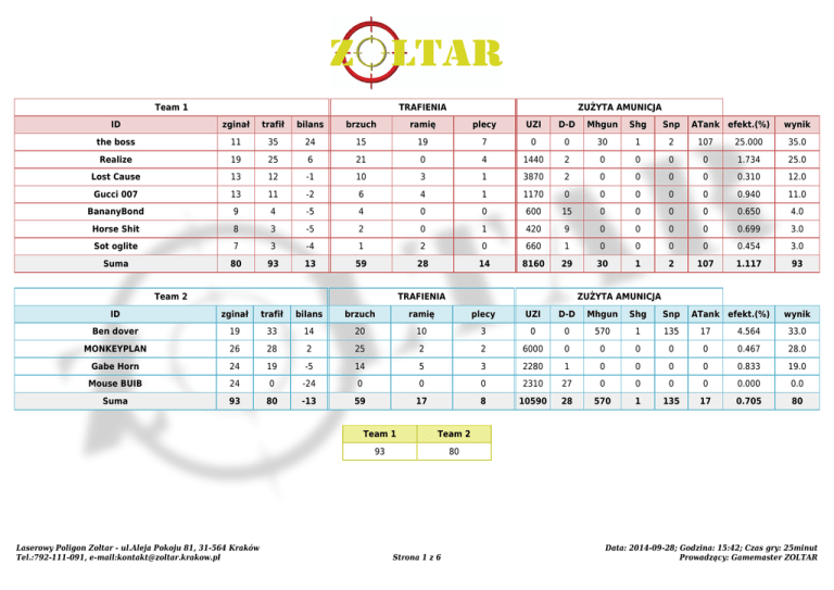 Team 1 TRAFIENIA ZUŻYTA AMUNICJA ID zginał trafił bilans brzuch ramię plecy UZI D-D Mhgun Shg Snp the boss 11 35 24 15 19 7 0 0 30 1 2 107 25.000 35.0 Realize 19 25 6 21 0 4 1440 2 0 0 0 0 1.734 25.0 Lost Cause 13 12 -1 10 3 1 3870 2 0 0 0 0 0.310 12.0 Gucci 007 13 11 -2 6 4 1 1170 0 0 0 0 0 0.940 11.0 BananyBond 9 4 -5 4 0 0 600 15 0 0 0 0 0.650 4.0 Horse Shit 8 3 -5 2 0 1 420 9 0 0 0 0 0.699 3.0 Sot oglite 7 3 -4 1 2 0 660 1 0 0 0 0 0.454 3.0 Suma 80 93 13 59 28 14 8160 29 30 1 2 107 1.117 93 Team 2 TRAFIENIA ATank efekt.(%) wynik ZUŻYTA AMUNICJA ID zginał trafił bilans brzuch ramię plecy UZI D-D Mhgun Shg Snp Ben dover 19 33 14 20 10 3 0 0 570 1 135 17 4.564 33.0 MONKEYPLAN 26 28 2 25 2 2 6000 0 0 0 0 0 0.467 28.0 Gabe Horn 24 19 -5 14 5 3 2280 1 0 0 0 0 0.833 19.0 Mouse BUIB 24 0 -24 0 0 0 2310 27 0 0 0 0 0.000 0.0 Suma 93 80 -13 59 17 8 10590 28 570 1 135 17 0.705 80 Laserowy Poligon Zoltar - ul.Aleja Pokoju 81, 31-564 Kraków Tel.:792-111-091, e-mail:[email protected] Team 1 Team 2 93 80 Strona 1 z 6 ATank efekt.(%) wynik Data: 2014-09-28; Godzina: 15:42; Czas gry: 25minut Prowadzący: Gamemaster ZOLTAR Team 1 TRAFIENIA ZUŻYTA AMUNICJA ID zginał trafił bilans brzuch ramię plecy UZI D-D Mhgun Shg Snp the boss 19 34 15 26 24 7 600 117 0 0 0 0 4.742 34.0 Realize 25 25 0 15 5 5 0 0 900 0 19 24 2.651 25.0 Gucci 007 22 23 1 16 7 5 1680 1 0 0 0 0 1.368 23.0 Lost Cause 12 15 3 12 3 2 3600 0 0 0 0 0 0.417 15.0 Horse Shit 20 13 -7 8 1 4 1110 0 0 0 0 0 1.171 13.0 BananyBond 18 12 -6 9 1 2 2700 0 0 0 0 0 0.444 12.0 Sot oglite 17 7 -10 7 0 0 1740 5 0 0 0 0 0.401 7.0 Suma 133 129 -4 93 41 25 11430 123 900 0 19 24 1.032 129 Team 2 TRAFIENIA ATank efekt.(%) wynik ZUŻYTA AMUNICJA ID zginał trafił bilans brzuch ramię plecy UZI D-D Mhgun Shg Snp Gabe Horn 42 43 1 36 8 5 1770 64 0 0 0 0 2.345 43.0 MONKEYPLAN 42 35 -7 24 14 7 3300 70 0 0 0 0 1.039 35.0 Mouse BUIB 22 29 7 16 12 4 0 0 300 11 15 219 5.321 29.0 Ben dover 23 26 3 16 7 4 6240 8 0 0 0 0 0.416 26.0 Suma 129 133 4 92 41 20 11310 142 300 11 15 219 1.109 133 Laserowy Poligon Zoltar - ul.Aleja Pokoju 81, 31-564 Kraków Tel.:792-111-091, e-mail:[email protected] Team 2 Team 1 133 129 Strona 2 z 6 ATank efekt.(%) wynik Data: 2014-09-28; Godzina: 16:17; Czas gry: 25minut Prowadzący: Gamemaster ZOLTAR Drużyny Miejsce Laserowy Poligon Zoltar - ul.Aleja Pokoju 81, 31-564 Kraków Tel.:792-111-091, e-mail:[email protected] Nazwa Rozgrywki 1 2 Suma Team 1 93 129 222 Team 2 80 133 213 Strona 3 z 6 Data: 2014-09-28 Prowadzący: Gamemaster ZOLTAR Zestawienie wg wyniku Miejsce TRAFIENIA ZUŻYTA AMUNICJA ID zginał trafił bilans brzuch ramię plecy UZI D-D Mhgun Shg Snp aTank efekt.(%) wynik the boss 36.00 82.80 46.80 49.20 51.60 16.80 720.00 140.40 36.00 1.20 2.40 128.40 8.051 82.80 MONKEYPLAN 81.60 75.60 -6.00 58.80 19.20 10.80 11160.00 84.00 0.00 0.00 0.00 0.00 0.672 75.60 Gabe Horn 79.20 74.40 -4.80 60.00 15.60 9.60 4860.00 78.00 0.00 0.00 0.00 0.00 1.507 74.40 4 Ben dover 50.40 70.80 20.40 43.20 20.40 8.40 7488.00 9.60 684.00 1.20 162.00 20.40 0.846 70.80 5 Realize 52.80 60.00 7.20 43.20 6.00 10.80 1728.00 2.40 1080.00 0.00 22.80 28.80 2.096 60.00 6 Gucci 007 42.00 40.80 -1.20 26.40 13.20 7.20 3420.00 1.20 0.00 0.00 0.00 0.00 1.193 40.80 7 Mouse BUIB 55.20 34.80 -20.40 19.20 14.40 4.80 2772.00 32.40 360.00 13.20 18.00 262.80 1.006 34.80 8 Lost Cause 30.00 32.40 2.40 26.40 7.20 3.60 8964.00 2.40 0.00 0.00 0.00 0.00 0.361 32.40 BananyBond 32.40 19.20 -13.20 15.60 1.20 2.40 3960.00 18.00 0.00 0.00 0.00 0.00 0.483 Horse Shit 33.60 19.20 -14.40 12.00 1.20 6.00 1836.00 10.80 0.00 0.00 0.00 0.00 1.040 Sot oglite 28.80 12.00 -16.80 9.60 2.40 0.00 2880.00 7.20 0.00 0.00 0.00 0.00 0.416 9 10 Laserowy Poligon Zoltar - ul.Aleja Pokoju 81, 31-564 Kraków Tel.:792-111-091, e-mail:[email protected] Strona 4 z 6 19.20 12.00 Data: 2014-09-28 Prowadzący: Gamemaster ZOLTAR Zestawienie wg bilansu Miejsce TRAFIENIA ZUŻYTA AMUNICJA ID zginał trafił bilans brzuch ramię plecy UZI D-D Mhgun Shg Snp aTank efekt.(%) wynik the boss 36.00 82.80 46.80 49.20 51.60 16.80 720.00 140.40 36.00 1.20 2.40 128.40 8.051 82.80 Ben dover 50.40 70.80 20.40 43.20 20.40 8.40 7488.00 9.60 684.00 1.20 162.00 20.40 0.846 70.80 Realize 52.80 60.00 7.20 43.20 6.00 10.80 1728.00 2.40 1080.00 0.00 22.80 28.80 2.096 60.00 4 Lost Cause 30.00 32.40 2.40 26.40 7.20 3.60 8964.00 2.40 0.00 0.00 0.00 0.00 0.361 32.40 5 Gucci 007 42.00 40.80 -1.20 26.40 13.20 7.20 3420.00 1.20 0.00 0.00 0.00 0.00 1.193 40.80 6 Gabe Horn 79.20 74.40 -4.80 60.00 15.60 9.60 4860.00 78.00 0.00 0.00 0.00 0.00 1.507 74.40 7 MONKEYPLAN 81.60 75.60 -6.00 58.80 19.20 10.80 11160.00 84.00 0.00 0.00 0.00 0.00 0.672 75.60 8 BananyBond 32.40 19.20 -13.20 15.60 1.20 2.40 3960.00 18.00 0.00 0.00 0.00 0.00 0.483 19.20 9 Horse Shit 33.60 19.20 -14.40 12.00 1.20 6.00 1836.00 10.80 0.00 0.00 0.00 0.00 1.040 19.20 10 Sot oglite 28.80 12.00 -16.80 9.60 2.40 0.00 2880.00 7.20 0.00 0.00 0.00 0.00 0.416 12.00 11 Mouse BUIB 55.20 34.80 -20.40 19.20 14.40 4.80 2772.00 32.40 360.00 13.20 18.00 262.80 1.006 34.80 Laserowy Poligon Zoltar - ul.Aleja Pokoju 81, 31-564 Kraków Tel.:792-111-091, e-mail:[email protected] Strona 5 z 6 Data: 2014-09-28 Prowadzący: Gamemaster ZOLTAR Zestawienie wg efektywności Miejsce TRAFIENIA ZUŻYTA AMUNICJA ID zginał trafił bilans brzuch ramię plecy UZI D-D Mhgun Shg Snp aTank efekt.(%) wynik the boss 36.00 82.80 46.80 49.20 51.60 16.80 720.00 140.40 36.00 1.20 2.40 128.40 8.051 82.80 Realize 52.80 60.00 7.20 43.20 6.00 10.80 1728.00 2.40 1080.00 0.00 22.80 28.80 2.096 60.00 Gabe Horn 79.20 74.40 -4.80 60.00 15.60 9.60 4860.00 78.00 0.00 0.00 0.00 0.00 1.507 74.40 4 Gucci 007 42.00 40.80 -1.20 26.40 13.20 7.20 3420.00 1.20 0.00 0.00 0.00 0.00 1.193 40.80 5 Horse Shit 33.60 19.20 -14.40 12.00 1.20 6.00 1836.00 10.80 0.00 0.00 0.00 0.00 1.040 19.20 6 Mouse BUIB 55.20 34.80 -20.40 19.20 14.40 4.80 2772.00 32.40 360.00 13.20 18.00 262.80 1.006 34.80 7 Ben dover 50.40 70.80 20.40 43.20 20.40 8.40 7488.00 9