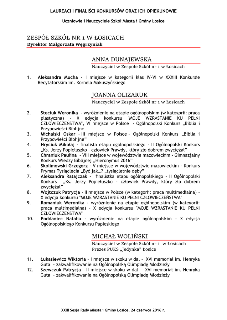 LAUREACI I FINALIŚCI KONKURSÓW ORAZ ICH OPIEKUNOWIE Uczniowie i Nauczyciele Szkół Miasta i Gminy Łosice ZESPÓŁ SZKÓŁ NR 1 W ŁOSICACH Dyrektor Małgorzata Węgrzyniak ANNA DUNAJEWSKA Nauczyciel w Zespole Szkół nr 1 w Łosicach 1. Aleksandra Mucha - I miejsce w kategorii klas IV-VI w XXXIII Konkursie Recytatorskim im. Kornela Makuszyńskiego JOANNA OLIZARUK Nauczyciel w Zespole Szkół nr 1 w Łosicach 2. 3. 4. 5. 6. 7. 8. 9. 10. Steciuk Weronika - wyróżnienie na etapie ogólnopolskim (w kategorii: praca plastyczna) - X edycja konkursu "MOJE WZRASTANIE KU PEŁNI CZŁOWIECZEŃSTWA", VI miejsce w Polsce - Ogólnopolski Konkurs „Biblia i Przypowieści Biblijne. Michalski Oskar - III miejsce w Polsce - Ogólnopolski Konkurs „Biblia i Przypowieści Biblijne” Hryciuk Mikołaj - finalista etapu ogólnopolskiego - II Ogólnopolski Konkurs „Ks. Jerzy Popiełuszko – człowiek Prawdy, który zło dobrem zwyciężał” Chraniuk Paulina - VIII miejsce w województwie mazowieckim - Gimnazjalny Konkurs Wiedzy Biblijnej „Hieronymus 2016” Skolimowski Grzegorz - V miejsce w województwie mazowieckim - Konkurs Prymas Tysiąclecia „Być jak…? „tysiącletnie dęby” Aleksandra Ratajczak - finalistka etapu ogólnopolskiego - II Ogólnopolski Konkurs „Ks. Jerzy Popiełuszko – człowiek Prawdy, który zło dobrem zwyciężał” Wojtczuk Patrycja - II miejsce w Polsce (w kategorii: praca multimedialna) X edycja konkursu "MOJE WZRASTANIE KU PEŁNI CZŁOWIECZEŃSTWA" Romaniuk Weronika - wyróżnienie na etapie ogólnopolskim (w kategorii: praca multimedialna) - X edycja konkursu "MOJE WZRASTANIE KU PEŁNI CZŁOWIECZEŃSTWA" Poddaniec Natalia - wyróżnienie na etapie ogólnopolskim - X edycja Ogólnopolskiego Konkursu Papieskiego MICHAŁ WOLIŃSKI Nauczyciel w Zespole Szkół nr 1 w Łosicach Prezes PUKS „Jedynka” Łosice 11. 12. Łukasiewicz Wiktoria – I miejsce w skoku w dal - XVI memoriał im. Henryka Guta - zakwalifikowanie na Ogólnopolską Olimpiadę Młodzieży Szewczuk Patrycja – II miejsce w skoku w dal - XVI memoriał im. Henryka Guta - zakwalifikowanie na Ogólnopolską Olimpiadę Młodzieży XXIII Sesja Rady Miasta i Gminy Łosice, 24 czerwca 2016 r. LAUREACI I FINALIŚCI KONKURSÓW ORAZ ICH OPIEKUNOWIE Uczniowie i Nauczyciele Szkół Miasta i Gminy Łosice SZKOŁAPODSTAWOWA NR 2 IM. MIKOŁAJA KOPERNIKA W ŁOSICACH Dyrektor Bożena Bojarczuk JOANNA NOWACZEK-JAKIMIUK Nauczyciel w Szkole Podstawowej nr 2 im. Mikołaja Kopernika w Łosicach 13. Kinga Czerka – finalista „Z ortografią na co dzień” Ogólnopolskiego Konkursu Polonistycznego AGATA BŁAŻEJCZUK Nauczyciel w Szkole Podstawowej nr 2 im. Mikołaja Kopernika w Łosicach 14. Jakub Szczerbicki – finalista Ogólnopolskiego konkursu „Z poprawną polszczyzną na co dzień” GIMNAZJUM NR 2 IM. JANA PAWŁA II W ŁOSICACH Dyrektor Jacek Izdebski MAŁGORZATA HRYNIEWICZ Nauczyciel w Gimnazjum nr 2 im. Jana Pawła II w Łosicach 15. Anna Sęk – VI miejsce w XVII edycji ogólnopolskiego konkursu geologiczno– środowiskowego „Nasza Ziemia – środowisko przyrodnicze wczoraj, dziś i jutro”. EWA STECKA Nauczyciel w Gimnazjum nr 2 im. Jana Pawła II w Łosicach 16. Marta Seredziuk – finalistka III Międzynarodowego Konkursu Młodych Recytatorów Prozy Rosyjskiej „Żywa Klasyka” XXIII Sesja Rady Miasta i Gminy Łosice, 24 czerwca 2016 r.