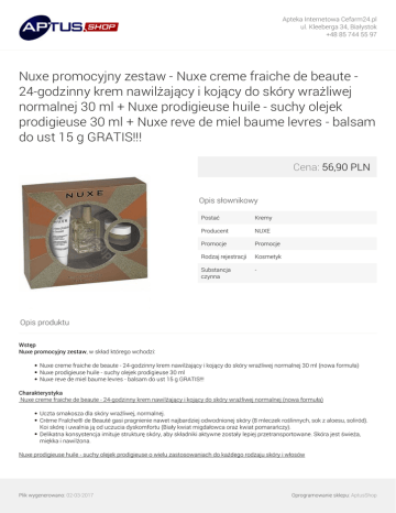Apteka Internetowa Cefarm24.pl ul. Kleeberga 34, Białystok +48 85 744 55 97 Nuxe promocyjny zestaw - Nuxe creme fraiche de beaute 24-godzinny krem nawilżający i kojący do skóry wrażliwej normalnej 30 ml + Nuxe prodigieuse huile - suchy olejek prodigieuse 30 ml + Nuxe reve de miel baume levres - balsam do ust 15 g GRATIS!!! Cena: 56,90 PLN Opis słownikowy Postać Kremy Producent NUXE Promocje Promocje Rodzaj rejestracji Kosmetyk Substancja czynna - Opis produktu Wstęp Nuxe promocyjny zestaw, w skład którego wchodzi: Nuxe creme fraiche de beaute - 24-godzinny krem nawilżający i kojący do skóry wrażliwej normalnej 30 ml (nowa formuła) Nuxe prodigieuse huile - suchy olejek prodigieuse 30 ml Nuxe reve de miel baume levres - balsam do ust 15 g GRATIS!!! Charakterystyka Nuxe creme fraiche de beaute - 24-godzinny krem nawilżający i kojący do skóry wrażliwej normalnej (nowa formuła) Uczta smakosza dla skóry wrażliwej, normalnej. Crème Fraîche® de Beauté gasi pragnienie nawet najbardziej odwodnionej skóry (8 mleczek roślinnych, sok z aloesu, soliród). Koi skórę i uwalnia ją od uczucia dyskomfortu (Biały kwiat migdałowca oraz kwiat pomarańczy). Delikatna konsystencja imituje strukturę skóry, aby składniki aktywne zostały lepiej przetransportowane. Skóra jest świeża, miękka i nawilżona. Nuxe prodigieuse huile - suchy olejek prodigieuse o wielu zastosowaniach do każdego rodzaju skóry i włosów Plik wygenerowano: 02-03-2017 Oprogramowanie sklepu: AptusShop Apteka Internetowa Cefarm24.pl ul. Kleeberga 34, Białystok +48 85 744 55 97 Huile Prodigieuse® - Olejek Prodigieuse®. Suchy olejek o wielu zastosowaniach dla każdego rodzaju skóry i włosów. Huile Prodigieuse to kultowy produkt, który łączy w sobie zalety szczególnej pielęgnacji za pomocą jednego gestu: nawilża, intensywnie odżywia, odnawia i chroni, a wszystko dzięki oryginalnej opatentowanej formule - 15% stężenie szlachetnych olejków roślinnych i witaminy E. Ostatnie testy potwierdziły jego skuteczność na rozstępy. Jego subtelny zapach, nietłusta konsystencja sprawiają, że jest to wyjątkowy produkt do pielęgnacji. Należy go stosować w dowolnej chwili na twarz, ciało i włosy. Bez konserwantów. Błyskawicznie wchłaniający się w skórę, o wielokierunkowym działaniu, pomaga odnowić, odżywić (koktajl szlachetnych olejków) i chronić (witamina E). Jednym gestem sprawisz, że skóra będzie miękka i satynowo gładka, włosy pozostaną jedwabiste i błyszczące. Używać przez cały rok, zimą i latem. Idealny do stosowania po kąpieli słonecznej. Huile Prodigieuse® - 98,8 % składników pochodzenia naturalnego. Nuxe reve de miel baume levres - balsam do ust Balsam do ust Reve de Miel - ultraodżywczy i naprawczy, na wysuszone usta i okolice ust. Aksamitny balsam o smaku miodu akacjowego i grejpfruta, którego obecność jest obowiązkowa w każdej kosmetyczce! Ma właściwości naprawcze, intensywnie odżywcze i wygładzające, co zapewnia ustom znakomite samopoczucie. Jego skuteczność była testowana w ekstremalnych warunkach w Kanadzie. Stosowanie Nuxe creme fraiche de beaute - 24-godzinny krem nawilżający i kojący do skóry wrażliwej normalnej 30 ml (nowa formuła) Nakładaj Crème Fraîche® de Beauté rano i/lub wieczorem na dokładnie oczyszczoną skórę. Nuxe prodigieuse huile - suchy olejek prodigieuse o wielu zastosowaniach do każdego rodzaju skóry i włosów Suchy, jedwabisty olejek o wyszukanym zapachu, jest bardzo szybko wchłaniany. Nie uczula. Twarz: Pobrać kilka kropel na dłoń, nakładać szczególnie na przesuszone części twarzy, omijając okolice oczu. Ciało: Nakładać odważnie, aby nawilżyć i odżywić skórę ciała. Idealny po ekspozycji słonecznej, w celu ukojenia skóry. Włosy: Nakładać jako odżywkę na suche i zniszczone końcówki włosów. Przy zniszczonych włosach, przesuszonej skórze głowy, po intensywnej kąpieli słonecznej stosować jako maskę, wieczorem obficie wetrzeć w umyte włosy i skórę głowy, pozostawić na noc, rano umyć głowę szamponem z linii Reve de Miel. Plik wygenerowano: 02-03-2017 Powered by TCPDF (www.tcpdf.org) Oprogramowanie sklepu: AptusShop