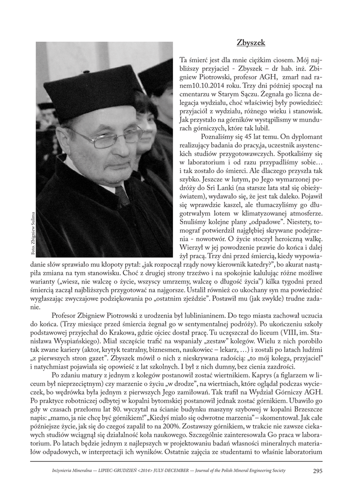 Zbyszek Foto. Zbigniew Sulima Ta śmierć jest dla mnie ciężkim ciosem. Mój najbliższy przyjaciel - Zbyszek – dr hab. inż. Zbigniew Piotrowski, profesor AGH, zmarł nad ranem10.10.2014 roku. Trzy dni później spoczął na cmentarzu w Starym Sączu. Żegnała go liczna delegacja wydziału, choć właściwiej były powiedzieć: przyjaciół z wydziału, różnego wieku i stanowisk. Jak przystało na górników wystąpilismy w mundurach górniczych, które tak lubił. Poznaliśmy się 45 lat temu. On dyplomant realizujący badania do pracy,ja, uczestnik asystenckich studiów przygotowawczych. Spotkaliśmy się w laboratorium i od razu przypadliśmy sobie… i tak zostało do śmierci. Ale dlaczego przyszła tak szybko. Jeszcze w lutym, po Jego wymarzonej podróży do Sri Lanki (na starsze lata stał się obieżyświatem), wydawało się, że jest tak daleko. Pojawił się wprawdzie kaszel, ale tłumaczyliśmy go długotrwałym lotem w klimatyzowanej atmosferze. Snuliśmy kolejne plany „odpadowe”. Niestety, tomograf potwierdził najgłębiej skrywane podejrzenia - nowotwór. O życie stoczył heroiczną walkę. Wierzył w jej powodzenie prawie do końca i dalej żył pracą. Trzy dni przed śmiercią, kiedy wypowiadanie słów sprawiało mu kłopoty pytał: „jak rozpoczął rządy nowy kierownik katedry?”, bo akurat nastąpiła zmiana na tym stanowisku. Choć z drugiej strony trzeźwo i na spokojnie kalulując różne możliwe warianty („wiesz, nie walczę o życie, wszyscy umrzemy, walczę o długość życia”) kilka tygodni przed śmiercią zaczął najbliższych przygotować na najgorsze. Ustalił również co ukochany syn ma powiedzieć wygłaszając zwyczajowe podziękowania po „ostatnim zjeździe”. Postawił mu (jak zwykle) trudne zadanie. Profesor Zbigniew Piotrowski z urodzenia był lublinianinem. Do tego miasta zachował uczucia do końca. (Trzy miesiące przed śmiercia żegnał go w sentymentalnej podróży). Po ukończeniu szkoły podstawowej przyjechał do Krakowa, gdzie ojciec dostał pracę. Tu uczęszczał do liceum (VIII, im. Stanisława Wyspiańskiego). Miał szczęście trafić na wspaniały „zestaw” kolegów. Wielu z nich porobiło tak zwane kariery (aktor, krytyk teatralny, biznesmen, naukowiec – lekarz, …) i zostali po latach ludźmi „z pierwszych stron gazet”. Zbyszek mówił o nich z nieskrywana radością: „to mój kolega, przyjaciel” i natychmiast pojawiała się opowieść z lat szkolnych. I był z nich dumny, bez cienia zazdrości. Po zdaniu matury z jednym z kolegów postanowił zostać wiertnikiem. Kaprys (a figlarzem w liceum był nieprzeciętnym) czy marzenie o życiu „w drodze”, na wiertniach, które oglądał podczas wycieczek, bo wędrówka była jednym z pierwszych Jego zamiłowań. Tak trafił na Wydział Górniczy AGH. Po praktyce robotniczej odbytej w kopalni bytomskiej postanowił jednak zostać górnikiem. Ubawiło go gdy w czasach przełomu lat 80. wyczytał na ścianie budynku maszyny szybowej w kopalni Brzeszcze napis: „mamo, ja nie chcę być górnikiem!” „Kiedyś miało się odwrotne marzenia” – skomentował. Jak całe późniejsze życie, jak się do czegoś zapalił to na 200%. Zostawszy górnikiem, w trakcie nie zawsze ciekawych studiów wciągnął się działalność koła naukowego. Szczególnie zainteresowała Go praca w laboratorium. Po latach będzie jednym z najlepszych w projektowaniu badań własności mineralnych materiałów odpadowych, w interpretacji ich wyników. Ostatnie zajęcia ze studentami to właśnie laboratorium Inżynieria Mineralna — LIPIEC-GRUDZIEŃ <2014> JULY-DECEMBER — Journal of the Polish Mineral Engineering Society 295 z zagospodarowania odpadów wydobywczych i energetycznych. A przecież miał już etat profesora i do laboratorium mógł „posyłać” innych. Kończąc studia pracę dyplomową wykonuje pod kierunkiem doc. dr inż. Karola Drzewieckiego. Ten wykorzystując zdolności manualne dyplomanta zleca mu oryginalny temat oparty o badania laboratoryjne. Ich wyniki opublikowaliśmy wspólnie. Była to pierwsza publikacja z całej serii pisanych potem razem przez bez mała 45 lat. (Wracając wspomnieniami do tamtych czasów myślę - czy mu się dopisałem? Czy pomoc i mój wkład zasługiwał na współautorstwo? Pomysł był Jego). Po studiach, doceniając zdolności świeżo upieczonego mgr. inż. Jego promotor, wspólnie z dyrektorem instytutu zaproponowali mu asystenturę. Nagatywna opinia grupowego instytutowego pewnej organizacji, zablokowała drogę naukową.Dzięki sympatii jaką podczas życia studenckiego zyskał u starszego kolegi - Tadka Popardy - „załapał się” do tworzonego wtedy przez niego Ośrodka Badań Naukowych i Współpracy z Przemysłem AGH. Po kilku latach zostaje zastępcą kierownika. Można by rzec – zrobił karierę urzędniczą. O pracy w tamtym ustroju, w fasadowym (w dużej mierze) dziale uczelni, potrafił opowiadać godzinami. Poznał wielu naukowców różnego formatu. Poznał sposoby pozyskiwania przez nich środków, metody uzyskiwanie nagród. Najciekawsze w Jego opowieściach były te, które szczegółowo relacjonowały jakimi metodami utytułowane osoby zabiegały o życzliwość małego urzędnika, który miał jeden walor, mógł wpłynąć na przydział środków. Na spisanie tamtych wspomnieńnie dał się jednak namówić, a szkoda. Będąc urzędnikiem pozostał wierny badaniom laboratoryjnym. W ramach „gospodarstw pomocniczych”, w swym dyplomującym instytucie, uczestniczył w realizacji pierwszego, z długiej serii, tematu odpadowego. On spędzał długie godziny w laboratorium określając właściwości próbek podsadzki a ja, po interpretacji, wykorzystałem je jako fragment swej dysertacji doktorskiej. I tak zacieśniała się nasza współpraca. Potwierdziła wcześniejsze doświadczenia, Zbyszka i wyników uzyskanych przez niego w laboratorium mogłem być pewny. Kiedy w 1980 roku, po