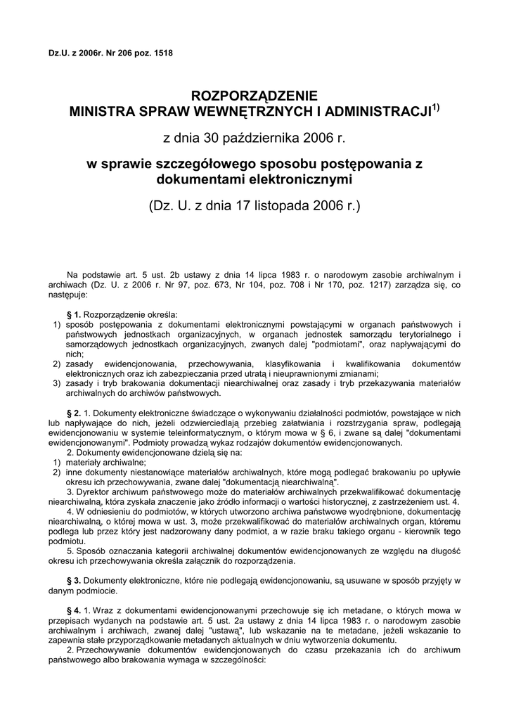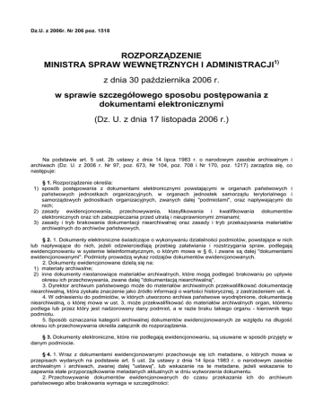 Dz.U. z 2006r. Nr 206 poz. 1518 ROZPORZĄDZENIE MINISTRA SPRAW WEWNĘTRZNYCH I ADMINISTRACJI1) z dnia 30 października 2006 r. w sprawie szczegółowego sposobu postępowania z dokumentami elektronicznymi (Dz. U. z dnia 17 listopada 2006 r.) Na podstawie art. 5 ust. 2b ustawy z dnia 14 lipca 1983 r. o narodowym zasobie archiwalnym i archiwach (Dz. U. z 2006 r. Nr 97, poz. 673, Nr 104, poz. 708 i Nr 170, poz. 1217) zarządza się, co następuje: § 1. Rozporządzenie określa: 1) sposób postępowania z dokumentami elektronicznymi powstającymi w organach państwowych i państwowych jednostkach organizacyjnych, w organach jednostek samorządu terytorialnego i samorządowych jednostkach organizacyjnych, zwanych dalej "podmiotami", oraz napływającymi do nich; 2) zasady ewidencjonowania, przechowywania, klasyfikowania i kwalifikowania dokumentów elektronicznych oraz ich zabezpieczania przed utratą i nieuprawnionymi zmianami; 3) zasady i tryb brakowania dokumentacji niearchiwalnej oraz zasady i tryb przekazywania materiałów archiwalnych do archiwów państwowych. § 2. 1. Dokumenty elektroniczne świadczące o wykonywaniu działalności podmiotów, powstające w nich lub napływające do nich, jeŜeli odzwierciedlają przebieg załatwiania i rozstrzygania spraw, podlegają ewidencjonowaniu w systemie teleinformatycznym, o którym mowa w § 6, i zwane są dalej "dokumentami ewidencjonowanymi". Podmioty prowadzą wykaz rodzajów dokumentów ewidencjonowanych. 2. Dokumenty ewidencjonowane dzielą się na: 1) materiały archiwalne; 2) inne dokumenty niestanowiące materiałów archiwalnych, które mogą podlegać brakowaniu po upływie okresu ich przechowywania, zwane dalej "dokumentacją niearchiwalną". 3. Dyrektor archiwum państwowego moŜe do materiałów archiwalnych przekwalifikować dokumentację niearchiwalną, która zyskała znaczenie jako źródło informacji o wartości historycznej, z zastrzeŜeniem ust. 4. 4. W odniesieniu do podmiotów, w których utworzono archiwa państwowe wyodrębnione, dokumentację niearchiwalną, o której mowa w ust. 3, moŜe przekwalifikować do materiałów archiwalnych organ, któremu podlega lub przez który jest nadzorowany dany podmiot, a w razie braku takiego organu - kierownik tego podmiotu. 5. Sposób oznaczania kategorii archiwalnej dokumentów ewidencjonowanych ze względu na długość okresu ich przechowywania określa załącznik do rozporządzenia. § 3. Dokumenty elektroniczne, które nie podlegają ewidencjonowaniu, są usuwane w sposób przyjęty w danym podmiocie. § 4. 1. Wraz z dokumentami ewidencjonowanymi przechowuje się ich metadane, o których mowa w przepisach wydanych na podstawie art. 5 ust. 2a ustawy z dnia 14 lipca 1983 r. o narodowym zasobie archiwalnym i archiwach, zwanej dalej "ustawą", lub wskazanie na te metadane, jeŜeli wskazanie to zapewnia stałe przyporządkowanie metadanych aktualnych w dniu wytworzenia dokumentu. 2. Przechowywanie dokumentów ewidencjonowanych do czasu przekazania ich do archiwum państwowego albo brakowania wymaga w szczególności: 1) opracowania i aktualizowania szczegółowych procedur przechowywania w czasie nie krótszym niŜ 10 lat, z uwzględnieniem bieŜącego stanu wiedzy i technologii; 2) przeprowadzania corocznych przeglądów określonych w procedurach, o których mowa w pkt 1, próbki dokumentów ewidencjonowanych; 3) przygotowania i realizacji planów przeniesienia dokumentów ewidencjonowanych na nowe informatyczne nośniki danych, z uwzględnieniem wyników przeglądów, o których mowa w pkt 2. § 5. 1. Rzeczową klasyfikację oraz kwalifikację dokumentów ewidencjonowanych ze względu na okresy ich przechowywania zawierają właściwe dla danych podmiotów jednolite rzeczowe wykazy akt, zwane dalej "wykazami akt". 2. Wykazy akt stanowią podstawę rejestracji i grupowania dokumentów w akta spraw. § 6. Postępowanie z dokumentami ewidencjonowanymi i metadanymi prowadzi się przy uŜyciu systemu teleinformatycznego, który: 1) zapewnia integralność treści dokumentów i metadanych polegającą na zabezpieczeniu przed wprowadzaniem zmian, z wyjątkiem zmian wprowadzanych w ramach ustalonych i udokumentowanych procedur; 2) zabezpiecza przed wprowadzaniem zmian w dokumentach spraw załatwionych; 3) zabezpiecza przed usunięciem dokumentów z systemu, z wyjątkiem udokumentowanych czynności dokonywanych w ramach ustalonych procedur usuwania dokumentów: a) dla których upłynął okres przechowywania ustalony w wykazie akt, b) mylnie zapisanych, c) mogących stanowić zagroŜenie dla prawidłowego funkcjonowania systemu, d) których usunięcie wymagane jest na podstawie przepisu prawa, prawomocnego orzeczenia sądu lub ostatecznej decyzji organu administracji; 4) zapewnia stały i skuteczny dostęp do dokumentów oraz ich wyszukiwanie; 5) umoŜliwia odczytanie metadanych dla kaŜdego dokumentu; 6) identyfikuje uŜytkowników i dokumentuje dokonywane przez nich zmiany w dokumentach i metadanych; 7) zapewnia kontrolę dostępu poszczególnych uŜytkowników do dokumentów i metadanych; 8) umoŜliwia odczytanie bez zniekształceń treści dokumentów wytworzonych przez podmiot, w którym działa system; 9) zachowuje dokumenty i metadane w strukturze określonej w przepisach wydanych na podstawie art. 5 ust. 2a ustawy, łącznie z moŜliwością prezentacji tej struktury; 10) zapewnia odtworzenie przebiegu załatwiania i rozstrzygania spraw; 11) wspomaga czynności związane z klasyfikowaniem i kwalifikowaniem oraz grupowaniem dokumentów w akta spraw na podstawie wykazu akt; 12) wspomaga i dokumentuje proces brakowania dokumentów stanowiących dokumentację niearchiwalną, w tym: a) wyodrębnia automatycznie dokumenty przeznaczone do brakowania, b) przygotowuje automatycznie spis dokumentacji niearchiwalnej, o którym mowa w § 11 ust. 1 pkt 2; 13) wspomaga czynności związane z przygotowaniem dokumentów stanowiących materiały archiwalne i ich metadanych do przekazania 