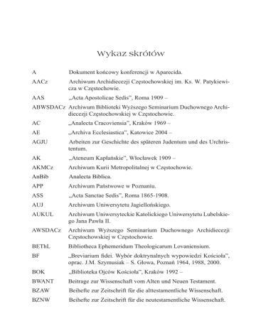 Wykaz skrótów ADokument końcowy konferencji w Aparecida. AACzArchiwum Archidiecezji Częstochowskiej im. Ks. W. Patykiewicza w Częstochowie. AAS„Acta Apostolicae Sedis”, Roma 1909 – ABWSDACz Archiwum Biblioteki Wyższego Seminarium Duchownego Archidiecezji Częstochowskiej w Częstochowie. AC „Analecta Cracoviensia”, Kraków 1969 – AE „Archiva Ecclesiastica”, Katowice 2004 – AGJUArbeiten zur Geschichte des späteren Judentum und des Urchristentum. AK„Ateneum Kapłańskie”, Włocławek 1909 – AKMCz Archiwum Kurii Metropolitalnej w Częstochowie. AnBibAnalecta Biblica. APP Archiwum Państwowe w Poznaniu. ASS„Acta Sanctae Sedis”, Roma 1865-1908. AUJ Archiwum Uniwersytetu Jagiellońskiego. AUKUL Archiwum Uniwersyteckie Katolickiego Uniwersytetu Lubelskiego Jana Pawła II. AWSDACz Archiwum Wyższego Seminarium Duchownego Archidiecezji Częstochowskiej w Częstochowie. BEThL Bibliotheca Ephemeridum Theologicarum Lovaniensium. BF „Breviarium fidei. Wybór doktrynalnych wypowiedzi Kościoła”, oprac. J.M. Szymusiak – S. Głowa, Poznań 1964, 1988, 2000. BOK„Biblioteka Ojców Kościoła”, Kraków 1992 – BWANT Beitrage zur Wissenschaft vom Alten und Neuen Testament. BZAWBeihefte zur Zeitschrift für die alttestamentliche Wissenschaft. BZNWBeihefte zur Zeitschrift für die neutestamentliche Wissenschaft. 10 Veritati et Caritati CCL„Corpus Christianorum. Series Latina”, Turnhout 1954 – CELAM Consejo Episcopal Latinoamericano / Rada Biskupów Ameryki Łacińskiej. CSEL„Corpus Scriptorum Ecclesiasticorum Latinorum”, Wien 1866 – CT „Collectanea Theologica”, Lwów – Warszawa 1931 – CzST„Częstochowskiej Studia Teologiczne”, Częstochowa 1973 – DP Dokument końcowy Konferencji CEKAM w Puebla. EK„Encyklopedia Katolicka”, Lublin 1973 – EKK Evangelisch-katholisches Kommentar. FHC „Folia Historica Cracoviensia”, Kraków 1989 – FRLANT Forschungen zur Religion und Literatur des Alten und Neuen Testaments. HTA.NT Historisch-theologische Auslegung. Neues Testament. HTKNT Herders Theologischer Kommentar zum Neuen Testament. JSNT„Journal for the Study of the New Testament”, Cardiff 1978 – KDKK „Kronika Diecezji Kujawsko – Kaliskiej”, Włocławek 1907 – KDS Kuria Diecezjalna w Sosnowcu. KW „Kwartalnik Historyczny”, Lwów – Warszawa 1887 – LThK „Lexikon für Theologie und Kirche”, I-X, Freiburg 1957-1968. NKBNowy Komentarz Biblijny. NTDNeues Testament Deutsch. NTOA Novum Testamentum et Orbis Antiquus / Studien zur Umwelt des Neuen Testaments (NTOA/StUNT). NTSNew Testament Studies, Cambridge 1955 – NTSupNovum Testamentum. Supplements. PG „Patrologiae cursus completus. Series Graeca”, 1-161, ed. J.P. Migne, Paris 1857-1866. PKan„Prawo Kanoniczne”, Warszawa 1958 – PL „Patrologiae cursus completus. Series Latina”, 1-222, ed. J.P. Migne, Paris 1878-1890. Wykaz skrótów 11 POK„Pisma Ojców Kościoła”, 1-28, red. J. Sajdak, Poznań 1924-1970. PSP„Pisma Starochrześcijańskich Pisarzy”, Warszawa 1969 – PŚSTPismo Święte Starego Testamentu, tzw. Biblia KUL. RGG Lexikon „Die Religion in Geschichte und Gegenwart”, Tübingen 1998-2005 [wyd. 4]. RSBRozprawy i Studia Biblijne. RT„Roczniki Teologiczne”, Lublin 1949 – RW „Rocznik Wieluński”, Wieluń 2001 – SACh SN „Studia Antiquitatis Christianae. Series Nova, Katowice 2005 – SACh„Studia Antiquitatis Christianae”, Warszawa 1977 – SaecCh „Saeculum Christianum”, Warszawa 1994 – SCh„Sources Chrétiennes”, Paris 1947 – SDKonferencja CELAMu w San Domingo w roku 1992. SKK/NT Stuttgarter kleiner Kommentar: Neues Testament. SMStudia Missionalia, Roma 1943 – SP „Studia Polonijne”, Lublin 1976 – SPTK„Słownik polskich teologów katolickich”, Warszawa 1981 – StTh„Studia Theologica”, Lund 1947 – ŚSHT„Śląskie Studia Historyczno - Teologiczne”, Katowice 1968 – TANZ Texte und Arbeiten zum neutestamentlichen Zeitalter. VoxP„Vox Patrum”, Lublin 1981 – VTVetus Testamentum, Leiden 1951 – WD „Wiadomości Diecezjalne”, Częstochowa 1926 –, dalej: CzWD „Częstochowskie Wiadomości Diecezjalne”, Częstochowa 1957 –, dalej: WACz „Wiadomości Archidiecezji Częstochowskiej” Częstochowa 1992 – WST„Warszawskie Studia Teologiczne”, Warszawa 1982 – WUNT Wissenschaftliche Untersuchungen zum Neuen Testament. ZCz „Ziemia Częstochowska”, Częstochowa 1934 – ZH „Zeszyty Historyczne”, Częstochowa 1993 – 12 ZNKUL Veritati et Caritati „Zeszyty Naukowe KUL”, Lublin 1958 – ZNWZeitschrift für die neutestamentliche Wissenschaft, Berlin 1900 – ŹMT„Źródła Myśli Teologicznej”, Kraków 1996 –