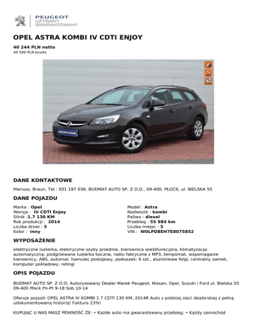 OPEL ASTRA KOMBI IV CDTI ENJOY 40 244 PLN netto 49 500 PLN brutto DANE KONTAKTOWE Mariusz, Braun, Tel.: 501 197 036, BUDMAT AUTO SP. Z O.O., 09-400, PŁOCK, ul. BIELSKA 55 DANE POJAZDU Marka : Opel Wersja : IV CDTI Enjoy Silnik :1.7 130 KM Rok produkcji : 2014 Liczba drzwi : 5 Kolor : inny Model : Astra Nadwozie : kombi Paliwo : diesel Przebieg : 55 984 km Liczba miejsc : 5 VIN : W0LPD8EH7E8075852 WYPOSAŻENIE elektryczne lusterka, elektryczne szyby przednie, kierownica wielofunkcyjna, klimatyzacja: automatyczna, podgrzewane lusterka boczne, radio fabryczne z MP3, tempomat, wspomaganie kierownicy, ABS, automat. hamulec postojowy, poduszek: 6 szt., aluminiowe felgi, centralny zamek, komputer pokładowy, relingi OPIS POJAZDU BUDMAT AUTO SP. Z O.O. Autoryzowany Dealer Marek Peugeot, Nissan, Opel, Suzuki i Ford ul. Bielska 55 09-400 Płock Pn-Pt 9-18 Sob 10-14 Oferuje pojazd: OPEL ASTRA IV KOMBI 1.7 CDTI 130 KM; 2014R Auto z polskiej sieci dealerskiej z pełną udokumentowaną historią! Faktura 23%! KUPUJĄC U NAS MASZ PEWNOŚĆ ŻE: • Każde auto ma gwarantowany przebieg; • Każdy samochód posiada ważną polisę OC oraz aktualne badania techniczne; • Sprawdziliśmy stan techniczny i prawny samochodu; • Nie zaniżamy cen na fakturze zawsze wystawiamy faktury na pełną wartość pojazdu GWARANCJA: Na każdy pojazd z przebiegiem do 150 000 km udzielamy 6-miesięcznej gwarancji programowej (silnik, skrzynia biegów, przekładnia główna) Rozszerzenie warunków gwarancji (układ kierowniczy, hamulcowy, paliwowy, przeniesienie napędu, instalacja elektryczna itp.) - 1060 PLN Wydłużenie gwarancji do 12 miesięcy - 840 PLN Szczegóły oferty dostępne w salonie. WYPOSAŻENIE: Klimatyzacja automatyczna, sterowana elektronicznie, dwustrefowa;ABS;Kamera parkowania z tyłu;Światła przednie z funkcją Follow Me Home;Światła do jazdy dziennej;Zestaw do naprawy przebitej opony;Zamek centralny;Zderzaki w kolorze nadwozia;Wyłącznik poduszki powietrznej pasażera;System przypominania o zapięciu pasów bezpieczeństwa na przednich siedzeniach;Tapicerka Silvanus;Panel centralny i listwy na drzwiach w kolorze szarym Dolomite Pearl Light;Tempomat;Wejście AUX-IN;Wspomaganie układu kierowniczego;Tylna kanapa składana, dzielona 60/40;Mocowanie fotelika dziecięcego ISOFIX w 2. rzędzie foteli;Sterowanie radiem z kierownicy;Relingi dachowe - czarne;Radio CD 400 MP3;Komputer pokładowy;Lusterka boczne regulowane elektrycznie i ogrzewane;Kolumna kierownicy z regulacją położenia w dwóch płaszczyznach;Felgi aluminiowe 16 z ogumieniem;Fotele przednie komfortowe;Kierownica trójramienna, skórzana;Elektryczne szyby przednie;ESP - program stabilizacji toru jazdy z kontrolą trakcji;Aktywne zagłówki w fotelach przednich;Światła przeciwmgielne z przodu;Lakier metalik;Hamulec postojowy sterowany elektrycznie;Airbag 6 sztuk: poduszki powietrzne czołowe i boczne dla kierowcy i pasażera, kurtyny powietrzne Na miejscu oferujemy: FINANSOWANIE : Samochód dostępny w finansowaniu kredytowym i leasingowym. Szczegóły oferty dostępne w salonie. UBEZPIECZENIE Pełne pakiety dealerskie AC/OC/NNW/ASS, likwidacja szkód na częściach oryginalnych. Konkurencyjne ceny! Szczegóły oferty dostępne w salonie. PRZYJMUJEMY SAMOCHÓD UŻYWANY W ROZLICZENIU: Proponujemy pozostawienie samochodu używanego w rozliczeniu. Zapewniamy bezpłatną wycenę w naszym salonie. Zapraszamy do kontaktu z naszym działem handlowym: Michał Michalski 508-090-457 Tomasz Szadkowski 501-197-036 *Powyższa informacja nie stanowi oferty w myśl prawa handlowego (art. 66 § 1 k.c.), więcej informacji możecie Państwo uzyskać kontaktując się z naszym Działem Sprzedaży. *Samochód prezentowany na zdjęciu może różnić się od przedstawionego w opisie. UMÓW SIĘ NA JAZDĘ PRÓBNĄ W NASZYM SALONIE. Do dyspozycji szeroka gama pojazdów używanych różnych marek. Zapraszamy serdecznie! QR CODE DLA OGŁOSZENIA W SERWISIE UZYWANYGWARANTOWANY.PL Powered by TCPDF (www.tcpdf.org)