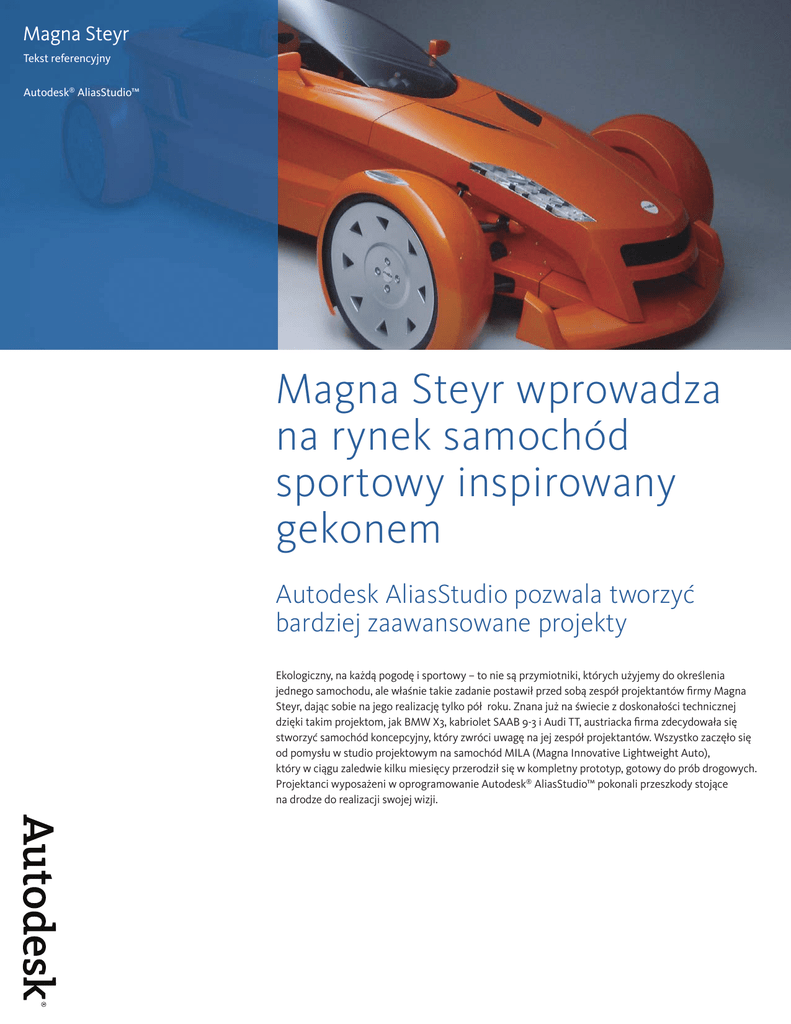 Magna Steyr Tekst referencyjny Autodesk® AliasStudio™ Magna Steyr wprowadza na rynek samochód sportowy inspirowany gekonem Autodesk AliasStudio pozwala tworzyć bardziej zaawansowane projekty Ekologiczny, na każdą pogodę i sportowy – to nie są przymiotniki, których użyjemy do określenia jednego samochodu, ale właśnie takie zadanie postawił przed sobą zespół projektantów firmy Magna Steyr, dając sobie na jego realizację tylko pół roku. Znana już na świecie z doskonałości technicznej dzięki takim projektom, jak BMW X3, kabriolet SAAB 9-3 i Audi TT, austriacka firma zdecydowała się stworzyć samochód koncepcyjny, który zwróci uwagę na jej zespół projektantów. Wszystko zaczęło się od pomysłu w studio projektowym na samochód MILA (Magna Innovative Lightweight Auto), który w ciągu zaledwie kilku miesięcy przerodził się w kompletny prototyp, gotowy do prób drogowych. Projektanci wyposażeni w oprogramowanie Autodesk® AliasStudio™ pokonali przeszkody stojące na drodze do realizacji swojej wizji. „Praca w AliasStudio podczas całego projektu pozwoliła nam kierować się instynktem, a nie wymiarami – co widać” Tim Doherty Starszy projektant, MILA Narodziny samochodu Projekt zapoczątkował kierownik działu projektowania Andreas Wolfsgruber wspólnie ze starszym projektantem Timem Doherty’m. Będąc pod wrażeniem świata przyrody - zwinności, szybkości i wyglądu gekonów - zespół przygotował szkic samochodu koncepcyjnego MILA. „Wzorując się na gekonie, który dzięki małemu okrągłemu korpusowi i szeroko rozstawionym łapkom doskonale trzyma się nawierzchni, chcieliśmy zaprojektować samochód o takiej samej sylwetce” – mówi Doherty. Inspiracja gekonem ukształtowała początkową wizję zespołu – MILA ma być zamkniętym pojazdem Formuły I. Kolejnym założeniem projektowym, wynikającym z ekologiczności pojazdu, był wymóg aby był on napędzany silnikiem na sprężony gaz ziemny – realistyczną alternatywą dla rozpowszechniających się napędów hybrydowych. „Chcieliśmy udowodnić, że da się to zrobić” – dodaje Doherty. W Magna Steyr są pewni, że gaz ziemny w coraz większym stopniu w przyszłości będzie alternatywnym paliwem dla pojazdów drogowych. Zespół miał tylko sześć miesięcy na realizację tego, zainspirowanego przyrodą, pomysłu, dlatego nie opóźniał rozpoczęcia działań. Proces i narzędzia Samochód koncepcyjny MILA był opracowany całkowicie cyfrowo. W ramach tego projektu nie budowano modelu z gliny. W oparciu o dane wygenerowane w Autodesk AliasStudio, z pianki poliuretanowej wycięto najpierw model zmniejszony, a potem pełnowymiarowy. Z chwilą zatwierdzenia produkcji prototypu, przystąpiono do wykonania narzędzi w oparciu o cyfrowe dane o wnętrzu i powłoce samochodu. Używając już od dawna AliasStudio, projektanci na każdym etapie tworzenia samochodu MILA wykorzystywali możliwości tego oprogramowania. Doherty na samym początku opracował trójwymiarowy model, dzięki czemu zachował nad nim pełną kontrolę, nie pozwalając, aby ktoś zamiast niego ingerował w projekt. „Jeżeli z jakiegokolwiek powodu na dowolnym etapie tworzenia trzeba było coś zmienić, miałem pełną kontrolę nad tym, jak pod nowe wymagania zmieni się cały model” - dodaje. „AliasStudio pozwala działać samodzielnie na poziomie koncepcyjnym uwzględniając to, że jesteśmy projektantami, a nie modelarzami”. Możliwość pracy w trzech wymiarach już od początku dawała także większe możliwości przekonania wszystkich osób decyzyjnych do rozpoczęcia projektu. Zarząd dostał wizualizacje w AliasStudio, dzięki czemu łatwo było sobie wyobrazić, jak będzie wyglądał gotowy produkt. „Używając AliasStudio podłożyliśmy pod rysunki różne tła i ludzi, tworząc realistyczne scenki” - wyjaśnia Doherty. „Dzięki temu znacznie łatwiej było przekonać recenzentów, że MILA jest realistyczny”. Oprócz większej kontroli nad projektem i możliwości pokazania gotowego produktu ze znacznym wyprzedzeniem, Doherty jako istotną przyczynę wyboru AliasStudio podaje też szybkie informacje zwrotne dla konstruktorów. Gdy pierwotna konstrukcja ewoluowała ze względu na wymogi techniczne, na przykład aerodynamikę, jej sedno się nie zmieniało. „Narzędzie może nam pomóc zaoszczędzić czas oraz zmniejszyć koszty, ale jeżeli stracimy przez nie charakter czy wymowę projektu określoną początkowymi szkicami, to nie będzie on udany” – dodaje Doherty. „Używając AliasStudio na etapie koncepcyjnym zachowujemy jednocześnie dokładność i swobodę”. Pierwsze szkice z widocznym wpływem gekona Prototyp cyfrowy zaprojektowany w AliasStudio Magna Steyr Tekst referencyjny Odsłona Samochód koncepcyjny MILA został uroczyście zaprezentowany na ubiegłorocznych targach motoryzacyjnych we Frankfurcie i wywołał wiele pozytywnych reakcji. Umiejętność skonstruowania takiego pojazdu zaledwie w pół roku jest wystarczającym dowodem na przyszłościowe możliwości projektowe firmy Magna Steyr. Widok koncepcji MILA z przodu „Byliśmy zafascynowani gotowym produktem oraz tym, że utrzymaliśmy charakter koncepcji” – mówi Doherty. „Praca z AliasStudio podczas całego projektu pozwoliła nam kierować się instynktem, a nie wymiarami – co widać”. Gdy właściwi ludzie wyposażeni we właściwe narzędzia realizują pomysł, w który wierzą, nie ma wątpliwości, że wynik będzie imponujący. Starszy projektant Tim Doherty w prototypowym pojeździe MILA Autodesk i AliasStudio są znakami towarowymi Autodesk, Inc., zarejestrowanymi w U.S.A. i/lub innych krajach. Wszystkie pozostałe znaki towarowe należą do ich właścicieli. Autodesk zastrzega sobie prawo zmiany oferty produktów i ich specyfikacji w dowolnej chwili bez uprzedzenia i nie odpowiada za błędy drukarskie i graficzne, które mogą występować w niniejszym dokumenc