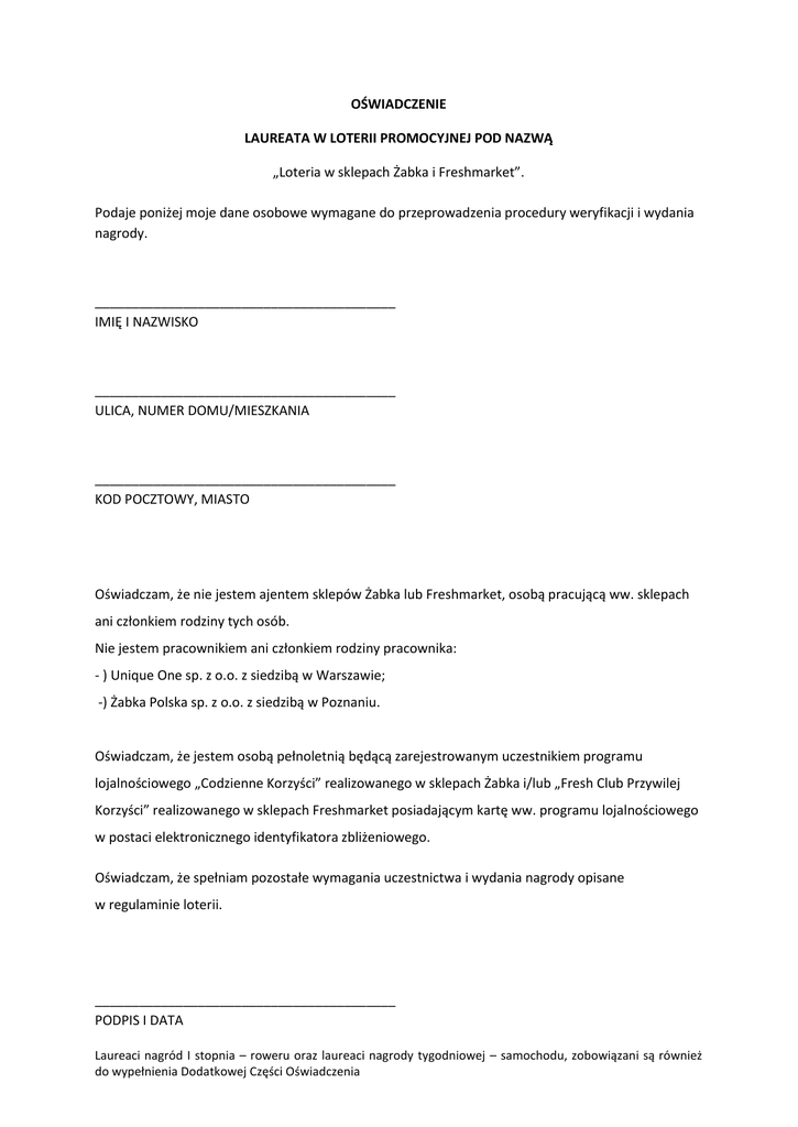 OŚWIADCZENIE LAUREATA W LOTERII PROMOCYJNEJ POD NAZWĄ „Loteria w sklepach Żabka i Freshmarket”. Podaje poniżej moje dane osobowe wymagane do przeprowadzenia procedury weryfikacji i wydania nagrody. _________________________________________ IMIĘ I NAZWISKO _________________________________________ ULICA, NUMER DOMU/MIESZKANIA _________________________________________ KOD POCZTOWY, MIASTO Oświadczam, że nie jestem ajentem sklepów Żabka lub Freshmarket, osobą pracującą ww. sklepach ani członkiem rodziny tych osób. Nie jestem pracownikiem ani członkiem rodziny pracownika: - ) Unique One sp. z o.o. z siedzibą w Warszawie; -) Żabka Polska sp. z o.o. z siedzibą w Poznaniu. Oświadczam, że jestem osobą pełnoletnią będącą zarejestrowanym uczestnikiem programu lojalnościowego „Codzienne Korzyści” realizowanego w sklepach Żabka i/lub „Fresh Club Przywilej Korzyści” realizowanego w sklepach Freshmarket posiadającym kartę ww. programu lojalnościowego w postaci elektronicznego identyfikatora zbliżeniowego. Oświadczam, że spełniam pozostałe wymagania uczestnictwa i wydania nagrody opisane w regulaminie loterii. _________________________________________ PODPIS I DATA Laureaci nagród I stopnia – roweru oraz laureaci nagrody tygodniowej – samochodu, zobowiązani są również do wypełnienia Dodatkowej Części Oświadczenia DODATKOWA CZĘŚĆ OŚWIADCZENIA DLA LAUREATA NAGRODY I STOPNIA – ROWERU WYBIERAM KOLOR i TYP NAGRODY*: ROWER MĘSKI biały / zielony połysk ROWER MĘSKI brązowy / miedziany mat ROWER MĘSKI czarny / biały mat ROWER DAMSKI czarny/ miętowy mat ROWER DAMSKI kremowy/ brązowy połysk ROWER DAMSKI zielony/ miętowy mat *NALEŻY ZAZNACZYĆ WYŁĄCZNIE JEDNO POLE WYBORU KOLORU OZNACZAJĄC JE SYMBOLEM „X _________________________________________ PODPIS I DATA Laureaci nagród I stopnia – roweru oraz laureaci nagrody tygodniowej – samochodu, zobowiązani są również do wypełnienia Dodatkowej Części Oświadczenia DODATKOWA CZĘŚĆ OŚWIADCZENIA DLA LAUREATA NAGRODY TYGODNIOWEJ – SAMOCHODU WYBIERAM KOLOR NAGRODY*: GAN SREBRNY SOVEREIGN METALICZNY GAR CZARNY CARBON FLASH METALICZNY GDB BRĄZOWY DARK CARAMEL METALICZNY GDC SZARY GRANITE METALICZNY GDC GWD SREBRNY MAGNETIC METALICZNY GWH SZARY ASTEROID PERŁOWY GWJ NIEBIESKI DEEP SKY METALICZNY G6R ZIELONY EMERALD PERŁOWY H06 BRĄZOWY BRONZE METALICZNY GBH CZERWONY POWER BRYLANTOWY *NALEŻY ZAZNACZYĆ WYŁĄCZNIE JEDNO POLE WYBORU KOLORU OZNACZAJĄC JE SYMBOLEM „X” _________________________________________ PODPIS I DATA Laureaci nagród I stopnia – roweru oraz laureaci nagrody tygodniowej – samochodu, zobowiązani są również do wypełnienia Dodatkowej Części Oświadczenia