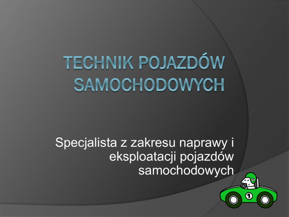 Specjalista z zakresu naprawy i eksploatacji pojazdów samochodowych CZYM ZAJMUJE SIĘ TECHNIK POJAZDÓW SAMOCHODOWY CH? Źródło; anterserwis.pl Diagnozowanie oraz naprawa pojazdów samochodowych CZYM ZAJMUJE SIĘ TECHNIK POJAZDÓW SAMOCHODOWY CH? źródło;sprawdzprace.pl Źródło;diagnosta.pl Źródło; samochodowka-wejherowo.pl Diagnozowanie oraz naprawa elektrycznych i elektronicznych układów pojazdów samochodowych źródło; pl.depositphotos.com Źródło; pl.depositphotos.com CZYM ZAJMUJE SIĘ TECHNIK POJAZDÓW SAMOCHODOWY CH? Montuje samochody i wymyśla prototypy Źródło;fracht.pl CZYM ZAJMUJE SIĘ TECHNIK POJAZDÓW SAMOCHODOWY CH? Kieruje pojazdami, przewozi ludzi lub towary Źródło;pomocdrogowa-24.com CZYM ZAJMUJE SIĘ TECHNIK POJAZDÓW SAMOCHODOWY CH? Pomaga w podróży w sytuacjach awaryjnych Źródło; stplus.pl Źródło;transbek.com.pl CZYM ZAJMUJE SIĘ TECHNIK POJAZDÓW SAMOCHODOWY CH? Wykonuje przeglądy techniczne pojazdów samochodowych CZYM ZAJMUJE SIĘ TECHNIK POJAZDÓW SAMOCHODOWY CH? Prowadzi salon samochodowy, sprzedaje samochody Źródło; Źródło;autotest.com.pl Źródło:pl.123rf.com CZYM ZAJMUJE SIĘ TECHNIK POJAZDÓW SAMOCHODOWY CH? Współpracuje z mechanikami, kieruje pracą zespołów Źródło;boschserwis,pl Źródło;kwalifikacjewzawodzie .pl Źródło;dobreprogramy.pl CZYM ZAJMUJE SIĘ TECHNIK POJAZDÓW SAMOCHODOWY CH? Prowadzi dokumentację techniczną napraw samochodów Źródło;pl.123rf.com Śródło:boschserwis.pl Źródło:panoramafirm.pl CZYM ZAJMUJE SIĘ TECHNIK POJAZDÓW SAMOCHODOWY CH? Koordynuje terminarz przeglądów, napraw, prób i pomiarów kontrolnych CZYM ZAJMUJE SIĘ TECHNIK POJAZDÓW SAMOCHODOWY CH? Źródło:moto.onet.pl Źródło:agrogama.eu Prowadzi własny warsztat samochodowy Możliwości zatrudnienia Warsztaty i serwisy samochodowe Stacje obsługi pojazdów Fabryki samochodów Stacje Kontroli pojazdów Salony sprzedaży Przedsiębiorstwa samochodowe Przedsiębiorstwa spedycyjne Prowadzenie działalności gospodarczej Doradztwo motoryzacyjne Likwidacja pojazdów samochodowych Stanowiska pracy Technik pojazdów samochodowych Technik serwisowy Diagnosta samochodowy Kontroler jakości stanu technicznego samochodów Kierownik salonu samochodowego Kierownik serwisu Kierownik warsztatu samochodowego Mechanik samochodowy Elektromechanik samochodowy Kierowca Miejsce wykonywania pracy Warsztat samochodowy Stacja kontroli pojazdów Stacja diagnostyczna Zaplecze techniczne Hala produkcyjna Garaż Czasami na powietrzu Biura M.18 Diagnozowanie i naprawa podzespołów i zespołów pojazdów samochodowych M.12 Diagnozowanie oraz naprawa elektrycznych i elektronicznych układów pojazdów samochodowych M.42 Organizacja i prowadzenie procesu obsługi pojazdów samochodowych A co po Technikum? Możliwość rozwoju na jednym z popularnych kierunków studiów: Inżynieria pojazdów elektrycznych i hybrydowych Samochody i ciągniki Technika i budowa maszyn Automatyka i robotyka Mechatronika Elektronika Elektrotechnika ZESPÓŁ SZKÓŁ PONADGIMNAZJALNYCH NR 2 W ZAMOŚCIU UL. SZCZEBRZESKA 41