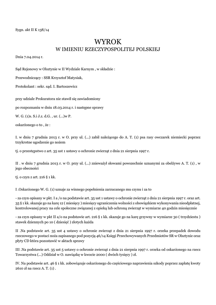 Sygn. akt II K 138/14 WYROK W IMIENIU RZECZYPOSPOLITEJ POLSKIEJ Dnia 7.04.2014 r. Sąd Rejonowy w Olsztynie w II Wydziale Karnym , w składzie : Przewodniczący : SSR Krzysztof Matysiak, Protokolant : sekr. sąd. I. Bartoszewicz przy udziale Prokuratora nie stawił się zawiadomiony po rozpoznaniu w dniu 18.03.2014 r. i następne sprawy W. G. (1)s. S.i J.z. d.G. , ur. (...)w P. oskarżonego o to , że : I. w dniu 7 grudnia 2013 r. w O. przy ul. (...) zabił należącego do A. T. (1) psa rasy owczarek niemiecki poprzez trzykrotne ugodzenie go nożem tj. o przestępstwo z art. 35 ust 1 ustawy o ochronie zwierząt z dnia 21 sierpnia 1997 r. II . w dniu 7 grudnia 2013 r. w O. przy ul. (...) znieważył słowami powszechnie uznanymi za obelżywe A. T. (1) , w jego obecności tj. o czyn z art. 216 § 1 kk. I .Oskarżonego W. G. (1) uznaje za winnego popełnienia zarzucanego mu czynu i za to - za czyn opisany w pkt. I a /o na podstawie art. 35 ust 1 ustawy o ochronie zwierząt z dnia 21 sierpnia 1997 r. oraz art. 35 § 1 kk. skazuje go na karę 12 ( miesięcy ) miesięcy ograniczenia wolności z obowiązkiem wykonywania nieodpłatnej, kontrolowanej pracy na cele społeczne związanej z opieką lub ochroną zwierząt w wymiarze 40 godzin miesięcznie - za czyn opisany w pkt II a/o na podstawie art. 216 § 1 kk. skazuje go na karę grzywny w wymiarze 30 ( trzydziestu ) stawek dziennych po 10 ( dziesięć ) złotych każda II .Na podstawie art. 35 ust 4 ustawy o ochronie zwierząt z dnia 21 sierpnia 1997 r. orzeka przepadek dowodu rzeczowego w postaci noża zapisanego pod pozycją 46/14 Księgi Przechowywanych Przedmiotów SR w Olsztynie oraz płyty CD która pozostawić w aktach sprawy III .Na podstawie art. 35 ust 5 ustawy o ochronie zwierząt z dnia 21 sierpnia 1997 r. orzeka od oskarżonego na rzecz Towarzystwa (...) Oddział w O. nawiązkę w kwocie 2000 ( dwóch tysięcy ) zł. IV. Na podstawie art. 46 § 1 kk. zobowiązuje oskarżonego do częściowego naprawienia szkody poprzez zapłatę kwoty 2610 zł na rzecz A. T. (1) . V. Na podstawie art. 46 § 2 kk. orzeka od oskarżonego na rzecz pokrzywdzonego A. T. (1) kwotę 4000 zł tytułem zadośćuczynienia za doznaną krzywdę VI . Obciąża oskarżonego kosztami procesu i opłatą w kwocie 330 złotych UZASADNIENIE We wrześniu 2013 r. miał miejsce incydent, podczas którego 3,5 letni owczarek niemiecki o imieniu (...), którego właścicielem był A. T. (1) poszarpał psa rasy mieszanej o imieniu (...) należącego do W. G. (1). A. T. (1) przeprosił W. G. (1) i pokrył koszty leczenia psa. (dowód: zeznania A. T. k. 100v – 101v, zeznania J. M. k. 52v, wyjaśnienia W. G. k. 99v-100v , ) W dniu 07 grudnia 2013 r. w O. A. T. (1) umówił się na wieczorny spacer z psami ze znajomym małżeństwem S. N. (1) i M. Z. (1) . Około godziny 20:50 szli ul. (...) w okolicy starego mostu na Ł. . Psy zostały puszczone luzem, bez kagańca. W tym samym czasie w okolicach ul. (...) z przeciwnej strony nadchodził W. G. (1) , który wyszedł na spacer wraz z małżonką i psem rasy mieszanej o imieniu (...). Pies W. G. (1) był trzymany na smyczy. W pewnym momencie spaceru pies A. T. (3) podbiegł w stronę Idącego z psem małżeństwa G. . W. G. (1) przekazał smycz z psem swojej małżonce a sam pochylił się , wyciągnął nóż przygotowując się na nadbiegającego psa . Doszło do zwarcia w trakcie którego ugodził nożem nadbiegającego psa w okolice klatki piersiowej, następnie oskarżony złapał owczarka za obrożę i tym samym nożem ugodził go nad łapą w okolicy serca, , po czym kolejną ranę zadał na grzbiecie w okolicach tylnich łap. Zraniony pies zaczął uciekać w kierunku właściciela. W. G. (1) wyrzucił w śnieg trzymany w ręku nóż. W tym momencie w kierunku oskarżonego nadbiegał właściciel owczarka A. T. (1) i nie widząc jeszcze co się stało z jego psem zaczął przepraszać oskarżonego, który w odpowiedzi użył w stosunku do niego słów wulgarnych. Gdy owczarek dotarł do nadbiegającego z przeciwnej strony właściciela, ten zauważył, że pies krwawi. (dowód: zeznania A. T. k. 100v-101, zeznania M. Z. k. 14, k. 54v,104, zeznania S. N. k. 103v-104 zeznania L. G. k. 102, prot. zatrzymania rzeczy k. 22-23, 38v, częściowo wyjaśnienia W. G.. 99-100v , 101 v ) S. N. (1)zadzwonił na policję i pobiegł po samochód. Z A. T. (1)została M. N.. A. T. (1)wsiadł z U. do bagażnika auta typu kombi należącego do S. N. (1). W tym czasie na miejsce zdarzenia przyjechała policja. Funkcjonariusz policji polecił zawieść psa do lekarza. Pies został odwieziony do kliniki weterynaryjnej znajdującej się na K.w O.. Na miejscu udzielono psu pierwszej pomocy i przetransportowano na salę zabiegową, gdzie w czasie przeprowadzanych czynności pies zdechł. (dowód: zeznania A. T. k. 5v-6, zeznania R. P. k.104v-105 , zeznania A. K.- S. k. 102, zeznania J. G. k. 101v, zeznania S. N. k. 103v-104, zeznania M. Z. (1) k. 104 ) W wyniku zdarzenia owczarek doznał następujących ran: rana kłuta w okolicy przedłopatkowej lewej o długości 10 cm sięgającą w głąb tkanek, rana kłuta o długości 3 cm umiejscowiona po lewej stronie w odległości 6 cm od linii środkowej kręgosłupa na wysokości 10 i 11 żebra sięgająca w głąb tkanek, ranę kłutą o długości 3-5 mm w okolicy żebrowej lewej, za lewą łopatką w ½ wysokości klatki piersiowej . Bezpośrednią przyczyną śmierci psa był wstrząs hipowolemiczny powstały w wyniku wynaczynień krwi do tkanki podskórnej, mięśni, jamy piersiowej, osierdzia i śródpiersia spowodowane uszkodzeniem ciągłości tkanek i naczyń przez ostre, płaskie narzędzie o szerokości ok. 3 cm, długości minimum 8 cm. (dowód: prot. badania sekcyjnego k. 49 ) W. G. (1) w czasie popełnienia zarzucanego mu czynu był w stanie nietrzeźwości badanie 21:36- wynik 1, 01 mg/l (dowód: prot. z przebiegu badania trzeźwości k. 3, ) W związku z powyższym przedstawiono W.