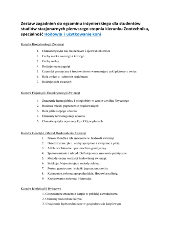 Zestaw zagadnień do egzaminu inżynierskiego dla studentów studiów stacjonarnych pierwszego stopnia kierunku Zootechnika, specjalność Hodowla i użytkowanie koni Katedra Biotechnologii Zwierząt 1. Charakterystyka ras matecznych i ojcowskich owiec 2. Cechy mleka owczego i koziego 3. Cechy wełny 4. Rodzaje tuczu jagniąt 5. Czynniki genetyczne i środowiskowe warunkujące cykl płciowy u owiec 6. Rola owiec w ochronie krajobrazu 7. Rodzaje skór owczych Katedra Fizjologii i Endokrynologii Zwierząt 1. Znaczenie hemoglobiny i mioglobiny w czasie wysiłku fizycznego 2. Budowa mięśni poprzecznie prążkowanych 3. Rola jelita ślepego u konia 4. Elementy termoregulacji u konia 5. Charakterystyka wymiany O2 i CO2 w płucach Katedra Genetyki i Metod Doskonalenia Zwierząt 1. Prawa Mendla i ich znaczenie w hodowli zwierząt 2. Dziedziczenie płci, cechy sprzężone i związane z płcią. 3. Allele wielokrotne i polimorfizm genetyczny 4. Spokrewnienie i inbred. Definicje oraz znaczenie praktyczne. 5. Metody oceny wartości hodowlanej zwierząt. 6. Selekcja. Najważniejsze metody selekcji. 7. Postęp genetyczny i ścieżki jego przenoszenia. 8. Kojarzenie zwierząt gospodarskich. Hodowla na linię. 9. Krzyżowanie zwierząt. Heterozja. Katedra Ichtiologii i Rybactwa 1. Gospodarcze znaczenie karpia w polskiej akwakulturze. 2. Odmiany hodowlane karpia 3. Urządzenia hydrotechniczne w gospodarstwie karpiowym 4. Cykl produkcyjny karpia 5. Gospodarcze znaczenie pstrąga tęczowego w polskiej akwakulturze Katedra Żywienia Zwierząt i Paszoznawstwa 1. Rola składników pokarmowych dla organizmów zwierząt. 2. Metody badań strawnościowych i bilansowych. 3. Metody konserwacji pasz objętościowych. 4. Żywienie krów mlecznych w poszczególnych okresach fizjologicznych. 5. Żywienie zwierząt przeżuwających i nieprzeżuwających – porównanie. 6. Zasady żywienia poszczególnych gatunków drobiu (kury, gęsi, kaczki, indyki). 7. Zasady żywienia różnych grup użytkowych koni. 8. Odchów źrebiąt. Instytut Nauk Weterynaryjnych Zakład Weterynarii, Rozrodu i Dobrostanu Zwierząt Przedmiot: Rozród zwierząt 1. Charakterystyka cyklu rujowego klaczy 2. Ocena przydatności samców zwierząt gospodarskich do rozrodu 3. Metody oceny nasienia samców zwierząt gospodarskich 4. Nasienia ogiera w ocenie makro- i mikroskopowej 5. Metody konserwacji nasienia ogiera 6. Możliwości sterowania cyklem rujowym u samic zwierząt gospodarskich 8. Gonadotropiny, rodzaje i funkcje 7. Błony płodowe i budowa łożyska klaczy 9. Charakterystyka łożysk zwierząt gospodarskich 10. Fazy porodu u klaczy Przedmiot: Prewencja zootechniczna 1. Rodzaje odporności 2. Surowice i szczepionki – rodzaje i stosowanie 3. Choroby wirusowe bydła 4. Odczyny alergiczne w diagnozie chorób zwierząt 5. Choroby bakteryjne koni 6. Coli-bakteriozy zwierząt Przedmiot: Higiena i dobrostan zwierząt 1. Immunomodulacja ze szczególnym uwzględnieniem immunosupresyjnego działania czynników środowiska hodowlanego 2. Drogi utraty ciepła przez zwierzęta 3. Przyczyny bezpośrednie i pośrednie w szerzeniu chorób 4. Metody i rodzaje dezynfekcji 5. Naturalne bariery ochronne organizmu 6. Założenia do spełnienia wymogów dobrostanu zwierząt 7. Wpływ frakcji promieniowania słonecznego na zwierzęta 8 Bakteryjne i wirusowe choroby koni objęte profilaktyczną akcją szczepień Zakład Anatomii Zwierząt 1. Skóra i wytwory naskórka ssaków i ptaków 2. Budowa i różnice gatunkowe przewodu pokarmowego zwierząt domowych i laboratoryjnych 3. Układ rozrodczy samic i samców zwierząt gospodarskich, laboratoryjnych oraz ptaków 4. Układ oddechowy ptaków i ssaków 5. Układ wydalniczy ptaków i ssaków 6. Gruczoł mlekowy ssaków domowych 7. Toksoplazmoza – zoonoza 8. Najgroźniejsze zoonozy bakteryjne 9. Najgroźniejsze zoonozy wirusowe Instytut Nauk o Zwierzętach Zakład Hodowli Bydła 1. Mleczne użytkowanie bydła. 2. Mięsne użytkowanie bydła. 3. Systemy utrzymania różnych kategorii bydła. 4. Reprodukcja i żywienie bydła. 5. Praca hodowlana w stadzie bydła. 6. Jakość surowców uzyskiwanych od bydła. Zakład Hodowli Koni 1. Opisz sposoby utrzymania koni w budynkach stajennych w odniesieniu do dobrostanu i wskaz wady i zalety każdego z systemów 2. Wymień rodzime rasy koni hodowane w Polsce, krótko je scharakteryzuj i podaj stadniny, w których obecnie się je hoduje 3. Podaj zasady przeprowadzania prób dzielności dla koni różnych typów użytkowych 4. Podaj zasady oceny bonitacyjnej koni, opisz najważniejsze wady budowy i postawy 5. Wymień i scharakteryzuj sprzęt do użytkowania wierzchowego i zaprzęgowego 6. Omów zasady rozpoznawaniu wieku koni na podstawie wyglądu uzębienia 7. Omów niekonwencjonalne sposoby użytkowania koni 8. Scharakteryzuj systemy odchowu koni stosowane w Polsce 9. Uzasadnij stosowanie imprintingu u źrebiąt 10. Wymień najczęściej stosowane rodzaje selekcji i doboru do rozpłodu stosowane w hodowli koni 11. Zaburzenia płodności ogierów (wrodzone, nabyte) 12. Przygotowanie klaczy do stanówki 13. Fizjologiczne i zootechniczne aspekty rozrodu koni (dojrzałość płciowa, cykl płciowy, ruja, ciąża, parametry nasienia, krycie) 14. Opisz codzienną pielęgnację kopyt konia (wymień sprzęt, środki pielęgnacyjne oraz zasady postępowania) 15. Rola właściwej pielęgnacji i podkownictwa w użytkowaniu koni z uwzględnieniem budowy i mechaniki kopyta 16. Rasy koni w Polsce objęte programem ochrony zasobów genetycznych 17. Jaka dokumentacja umożliwia prowadzenie racjonalnej hodowli koni 18. Wyjaśnij zasadę i omów metody identyfikacji koniowatych Zakład Hodowli Trzody Chlewnej i Drobnego Inwentarza Przedmiot: Hodowla Trzody Chlewnej 1. Wymień i scharakteryzuj rasy świń, dla których w Polsce prowadzone są księgi zwierząt zarodowych. 2. Omów zabiegi wykonywane na prosiętach od urodzenia do odsadzenia. 3. Omów obowiązujące od 1.01.2013 zasady utrzyman