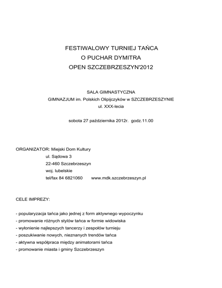 FESTIWALOWY TURNIEJ TAŃCA O PUCHAR DYMITRA OPEN SZCZEBRZESZYN'2012 SALA GIMNASTYCZNA GIMNAZJUM im. Polskich Olipijczyków w SZCZEBRZESZYNIE ul. XXX-lecia sobota 27 października 2012r. godz.11.00 ORGANIZATOR: Miejski Dom Kultury ul. Sądowa 3 22-460 Szczebrzeszyn woj. lubelskie tel/fax 84 6821060 www.mdk.szczebrzeszyn.pl CELE IMPREZY: - popularyzacja tańca jako jednej z form aktywnego wypoczynku - promowanie różnych stylów tańca w formie widowiska - wyłonienie najlepszych tancerzy i zespołów turnieju - poszukiwanie nowych, nieznanych trendów tańca - aktywna współpraca między animatorami tańca - promowanie miasta i gminy Szczebrzeszyn REGULAMIN I. KATEGORIE WIEKOWE: 1. Solo a) do 8 lat (do 2004r. włącznie) b) 9 i 10 lat (2003 i 2002r.) c) 11 i 12 lat (2001 i 2000r.) d) 13 i 14 lat (1999 i 1998r.) e) powyżej 15 lat (od1997r. włącznie) 2. Duety a) od 10 do 12 lat (2002,2001,2000r.) b) od 13 do 15 lat (1999,1998,1997r.) c) powyzej 16 lat (od 1996r. włącznie) 3. Małe Grupy a) do 12 lat (do 2000r. włącznie) b) od 13 do 15 lat (1999,1998,1997r.) c) powyżej 16 lat (od 1996r. włącznie) 4. Formacje a) do 12 lat (do 2000r. włącznie) b) od 13 lat (od 1999r. Włącznie) 5. Produkcje a) bez ograniczeń wiekowych UWAGA ! - w wyjątkowych sytuacjach możliwa jest tolerancja wiekowa w kategorii małe grupy i formacje, nie więcej jednak jak 25 % składu osobowego (oprócz kategorii produkcje) II. KATEGORIE TANECZNE 1. do muzyki hip hop - solo, duety, małe grupy 2. do muzyki disco dance - solo, duety, małe grupy 3. muzyka własna (freestyle) - solo, duety, małe grupy, formacje 4. taniec synchroniczny -małe grupy, formacje, produkcje - udział w kategoriachkategoriacha) soliści i duety mogą brać udział tylko w jednej kategorii tanecznej i wiekowej b) małe grupy zgłoszone do kategorii 1 i 2 nie mogą brać udziału w kategorii 3 c) małe grupy zgłoszone do kategorii 3 nie mogą brać udziału w kategorii 1 i 2 d) choreografia zespołu (MG,F,Pr.) zaprezentowana w jednej kategorii nie może powtórzyć się w innej III. MUZYKA, CZAS, TEMPO 1. Kategoria do muzyki HipHop i DiscoDance: DiscoDance solo,duety, małe grupy - tancerze tańczą do muzyki organizatora - czas prezentacji solistów; 45 sek. (plus krótkie rundy wstępne i porównawcze) - czas prezentacji małych grup; 1min.30sek.-eliminacje; do 2min. - finały - tempo utworów HH;od HH; 108 do 120 b/m, DD; od 128 do 140 b/m - w trakcie prezentacji dozwolone są elementy akrobatyczne, bezpiecznie wykonane (nie zagrażające innym) 2. Kategoria do muzyki własnej (freestyle); solo, duety, małe grupy, formacje - opisana płyta CD-R zawierajaca jeden utwór (audio lub mp3) !!! - czas prezentacji solistów i duetów: od 0.45 sek. do 1min. - czas prezentacji małych grup; od 1.30 do 2min. - czas prezentacji formacji; od 2.30 do 3min. - w trakcie prezentacji dozwolone są elementy akrobatyczne -bezpiecznie wykonane 3. Kategoria taniec synchroniczny; małe grupy, formacje, produkcje produkcje - w trakcie prezentacji zakaz wykonywania elementów akrobatycznych - muzyka i tempo dowolne - opisana płyta CD-R zawierająca jeden utwór (audio lub mp3) !!! - czas prezentacji małych grup; od 2.30 do 3min. ( 3-7 osób ) - czas prezentacji formacji; od 3.00 do 4min. ( 8-24 ) - czas prezentacji produkcji; od 4.00 do 5min. ( od 25 ) IV. OPŁATY STARTOWE - solo 10zł - duety 20zł - małe grupy 50zł - formacje 100zł - produkcje 150zł V. WARUNKI I ZASADY UCZESTNICTWA 1. Turniej ma charakter otwarty (zrzeszeni i niezrzeszeni) 2. Zgłoszenie udziału wg podanego wzoru (Mickrosoft Word) do 18 października 2012r. na adres organizatora; [email protected] oraz [email protected] − zgłoszenia błędnie wypełnione będą zwracane do korekty − zgłoszenie przesłane na jeden adres może zostać pominięte − organizator potwierdzi przyjęcie zgłoszenia 3. Realizacja opłat startowych wg zgłoszeń - po wystawieniu faktury lub KP organizator nie zwraca opłat startowych ! 4. W dniu turnieju rejestracji zawodników dokonuje tylko trener lub opiekun grupy wymieniony w zgłoszeniu 5. AGRAFKI do numerów startowych zabezpieczają sami zawodnicy ! 6. Prezentacje turniejowe ocenia komisja sędziowska powołana przez Organizatora 7. Podporządkowanie się Organizatorom oraz Regulaminowi Turnieju VI. POZOSTAŁE SPRAWY ORGANIZACYJNE 1. W uzasadnionych przypadkach organizator ma prawo do nie przyjęcia zgłoszenia, np. zgłoszenie po terminie lub brak wpłaty akredytacyjnej 2. Numery startowe wydawane są na podstawie wniesionej akredytacji 3. Na prośbę osób rejestrujących, zawodnik ma obowiązek przedstawić aktualny dowód tożsamości 4. W dniu turnieju, w trakcie rejestracji w wyznaczonym czasie, obowiązuje zakaz dopisywania do listy startowej nowych zawodników; jest to możliwe tylko wtedy gdy w danej kategorii zostały zwolnione numery startowe 5. W przypadku spóźnienia się na czas rejestracji (wypadki losowe), opiekun danej ekipy zobowiązany jest bezwzględnie do powiadomienia organizatora o zaistniałej sytuacji oraz o jakichkolwiek zmianach na liście startowej 6. Organizator nie ma obowiązku dopuszczenia do turnieju zarejestrowanych zawodników, którzy spóźnili się na wyznaczony czas eliminacji w danej kategorii, a szczególnie w sytuacji kiedy może to wywołać opóźnienie w programie turnieju 7. Wejście na parkiet możliwe jest tylko w czystym obuwiu sportowym 8. W trakcie rozgrzewki, prób oraz prezentacji turniejowych obowiązuje zakaz wnoszenia na parkiet jakichkolwiek napojów 9. Za prawidłowe przypięcie numerów startowych na stroju odpowiadają zawodnicy 10. Ekipy startujące są zobowiązane do uczestnictwa w ceremonii wręczenia dyplomów i nagród oraz przyjęcia wyników z godnością 11. Przestrzeganie zasad BHP, PPOŻ oraz FAIR PLAY. 12. Za jakiekolwiek łamanie regulaminu i poleceń organizatora, Sędzia Główny oraz Organizator Turnieju mają prawo do wykluczenia z turnieju zawodnika, zawodnik