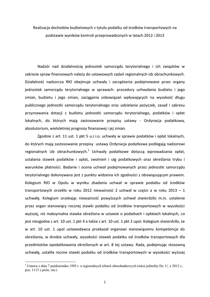 Realizacja dochodów budżetowych z tytułu podatku od środków transportowych na podstawie wyników kontroli przeprowadzonych w latach 2012 i 2013 Nadzór nad działalnością jednostek samorządu terytorialnego i ich związków w zakresie spraw finansowych należy do ustawowych zadań regionalnych izb obrachunkowych. Działalność nadzorcza RIO obejmuje uchwały i zarządzenia podejmowane przez organy jednostek samorządu terytorialnego w sprawach: procedury uchwalania budżetu i jego zmian, budżetu i jego zmian, zaciągania zobowiązań wpływających na wysokość długu publicznego jednostki samorządu terytorialnego oraz udzielania pożyczek, zasad i zakresu przyznawania dotacji z budżetu jednostki samorządu terytorialnego, podatków i opłat lokalnych, do których mają zastosowanie przepisy ustawy - Ordynacja podatkowa, absolutorium, wieloletniej prognozy finansowej i jej zmian. Zgodnie z art. 11 ust. 1 pkt 5 u.r.i.o. uchwały w sprawie podatków i opłat lokalnych, do których mają zastosowanie przepisy ustawy Ordynacja podatkowa podlegają nadzorowi regionalnych izb obrachunkowych.1 Uchwały podatkowe dotyczą wprowadzania opłat, ustalania stawek podatków i opłat, zwolnień i ulg podatkowych oraz określania trybu i warunków płatności. Badanie i ocena uchwał podejmowanych przez jednostki samorządu terytorialnego dokonywana jest z punktu widzenia ich zgodności z obowiązującym prawem. Kolegium RIO w Opolu w wyniku zbadania uchwał w sprawie podatku od środków transportowych orzekło w roku 2012 nieważność 2 uchwał w części a w roku 2013 – 1 uchwałę. Kolegium orzekając nieważność powyższych uchwał stwierdziło m.in. ustalenie przez organ stanowiący rocznej stawki podatku od środków transportowych w wysokości wyższej, niż maksymalna stawka określona w ustawie o podatkach i opłatach lokalnych, co jest niezgodne z art. 10 ust. 1 pkt 4 a także z art. 10 ust. 1 pkt 2 upol. Kolegium stwierdziło, że w art. 10 ust. 1 upol ustawodawca przekazał organowi stanowiącemu kompetencje do określania, w drodze uchwały, wysokości stawek podatku od środków transportowych dla przedmiotów opodatkowania określonych w art. 8 tej ustawy. Rada, podejmując stosowną uchwałę, ustaliła roczne stawki podatku od środków transportowych w wysokości wyższej 1 Ustawa z dnia 7 października 1992 r. o regionalnych izbach obrachunkowych (tekst jednolity Dz. U. z 2012 r., poz. 1113 z późn. zm.) 1 niż stawki określone w ustawie. Ponadto, Kolegium zauważyło, że stawki podatku od środków transportowych, ustalane przez radę w uchwale, nie mogą być wyższe od stawek maksymalnych, ani nie mogą być niższe od stawek minimalnych ustalonych w ustawie. 2 Podatek od środków transportowych – definicja Jednym ze źródeł dochodów gmin są dochody własne, które zostały określone w ustawie o dochodach jednostek samorządu terytorialnego. Dochody własne obejmują m.in. wpływy z podatków w tym z podatku od środków transportowych.3 Podatnikami od środków transportowych są osoby fizyczne, osoby prawne będące właścicielami (współwłaścicielami) środków transportu oraz jednostki organizacyjne nie mające osobowości prawnej jeśli środek transportu jest na nie zarejestrowany. Ustawodawca nie łączy powstania obowiązku podatkowego z możliwością wykorzystywania środka transportowego, a wyłącznie z posiadaniem zarejestrowanego środka transportowego. Powyższy pogląd został potwierdzony przez Sąd Administracyjny w Gdańsku w wyroku z dnia 22.02.2012 r. I SA/Gd 1197/11 w którym stwierdzono, że bez wpływu na istnienie obowiązku podatkowego ma stan techniczny nabytego pojazdu i faktyczny brak możliwości korzystania z posiadanego środka transportowego. Opodatkowaniu podatkiem od środków transportowych podlegają: samochody ciężarowe o dopuszczalnej masie całkowitej od 3,5 tony, ciągniki siodłowe i balastowe przystosowane do używania z przyczepą lub naczepą o dopuszczalnej masie całkowitej zespołu pojazdów od 3,5 tony, przyczepy i naczepy, które łącznie z pojazdem silnikowym posiadają dopuszczalną masę całkowitą od 7 ton, z wyjątkiem związanych wyłącznie z działalnością rolniczą prowadzoną przez podatnika podatku rolnego, autobusy. Stawki podatku dla poszczególnych środków transportu ustalane są przez radę gminy, z tym że nie mogą one być wyższe niż określone w art. 10 u.p.o.l.4 ani też niższe niż stawki minimalne określone w załącznikach do u.p.o.l. Obowiązek podatkowy w podatku od 2 Raport Regionalnej Izby Obrachunkowej w Opolu za 2012 r. Realizacja budżetów jednostek samorządu terytorialnego województwa opolskiego 3 Ustawa z dnia 13 listopada 2003 r. o dochodach jednostek samorządu terytorialnego (tekst jednolity Dz. U. z 2014 r., poz. 1115) 4 Ustawa z dnia 12 stycznia 1991 r. o podatkach i opłatach lokalnych (tekst jednolity Dz.U. z 2014 r., poz. 849) 2 środków transportowych powstaje w trzech sytuacjach, a mianowicie w przypadku: nabycia zarejestrowanego środka transportu, zrejestrowania pojazdu oraz ponownego dopuszczenia pojazdu do ruchu po upływie okresu wycofania tegoż pojazdu z ruchu. Przy czym należy nadmienić, że obowiązek podatkowy nie powstaje z chwilą zaistnienia ww. okoliczności ale począwszy od pierwszego dnia miesiąca następującego po miesiącu, w którym zdarzenie miało miejsce. Z kolei obowiązek podatkowy wygasa podobnie jak w przypadku powstania obowiązku podatkowego w przypadku zaistnienia trzech okoliczności. Obowiązek podatkowy w podatku od środków transportowych wygasa z końcem miesiąca, w którym zarejestrowany pojazd został zbyty, albowiem stosownie do art. 9 ust. 3 u.p.o.l.5, w przypadku zmiany właściciela zarejestrowanego środka transportowego obowiązek podatkowy ciąży na poprzednim właścicielu jedynie do końca miesiąca, w którym nastąpiło przeniesienie prawa własności. Ponadto obowiązek podatkowy wygasa 