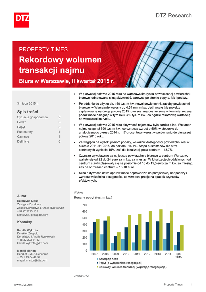 DTZ Research PROPERTY TIMES Rekordowy wolumen transakcji najmu Biura w Warszawie, II kwartał 2015 r. 31 lipca 2015 r. W pierwszej połowie 2015 roku na warszawskim rynku nowoczesnej powierzchni biurowej odnotowano silną aktywność, zarówno po stronie popytu, jak i podaży. Po oddaniu do użytku ok. 150 tys. m kw. nowej powierzchni, zasoby powierzchni biurowej w Warszawie wzrosły do 4,54 mln m kw. Jeśli wszystkie projekty zaplanowane na drugą połowę 2015 roku zostaną dostarczone w terminie, roczna podaż może osiągnąć w tym roku 350 tys. m kw., co będzie rekordową wartością na warszawskim rynku. W pierwszej połowie 2015 roku aktywność najemców była bardzo silna. Wolumen najmu osiągnął 390 tys. m kw., co oznacza wzrost o 50% w stosunku do analogicznego okresu 2014 r. i 17-procentowy wzrost w porównaniu do pierwszej połowy 2013 roku. Ze względu na wysoki poziom podaży, wskaźnik dostępności powierzchni rósł w okresie 2011-H1 2015, do poziomu 14,1%. Stopa pustostanów dla stref centralnych wyniosła 15%, zaś dla lokalizacji poza centrum – 13,7%. Czynsze wywoławcze za najlepsze powierzchnie biurowe w centrum Warszawy wahały się od 22 do 24 euro za m kw. za miesiąc. W lokalizacjach oddalonych od centrum stawki plasowały się na poziomie od 10 do 15,5 euro za m kw. za miesiąc, zaś na obrzeżach centrum – 16-18 euro. Silna aktywność deweloperów może doprowadzić do przejściowej nadpodaży i wzrostu wskaźnika dostępności, co wzmocni presję na spadek czynszów efektywnych. Spis treści Sytuacja gospodarcza 2 Podaż 3 Popyt 3 Pustostany 4 Czynsze 4 Definicje 6 Wykres 1 Autor Katarzyna Lipka Zastępca Dyrektora Zespół Doradztwa i Analiz Rynkowych +48 22 2223 132 [email protected] Roczny popyt (tys. m kw.) Source: PORF, DTZ, (f)-forecast Kontakty Kamila Wykrota Dyrektor Zespołu Doradztwa i Analiz Rynkowych + 48 22 222 31 33 [email protected] Magali Marton Head of EMEA Research + 33 1 49 64 49 54 [email protected] Źródło: DTZ www.dtz.com Property Times 1 Biura w Warszawie, II kwartał 2015 r. Sytuacja gospodarcza Wykres 2 Wzrost gospodarczy i inflacja Wzrost PKB i inflacja w Polsce W pierwszym kwartale 2015 r. polska gospodarka stabilnie rosła, osiągając wzrost PKB rok do roku na poziomie 3,6%, w porównaniu do 3,4% odnotowanych w pierwszym kwartale 2014 r.1 Głównym motorem napędowym pozostawał dalszy wzrost popytu wewnętrznego, wzmocniony przez 3,1procentowy wzrost spożycia prywatnego oraz dynamiczny wzrost inwestycji przedsiębiorstw (o 11,4%). Polski wskaźnik PMI wzrósł w czerwcu o 1,9% do poziomu 54,3% w wyniku wzrostu produkcji przemysłowej, nowych zamówień oraz wyższego popytu ze strony konsumentów. Ponadto, dzięki niższemu bezrobociu i rosnącej sile nabywczej, indeks ufności konsumentów (CCI)2, opublikowany przez GUS, wzrósł w czerwcu o 3,2 pp. do poziomu -10,4, co stanowi najlepszy wynik od września 2008 roku. Spodziewany jest dalszy wzrost PKB w drugiej połowie 2015 roku (wykres 2). Jednak z powodu czynników zewnętrznych, takich jak niepewna sytuacja gospodarcza w Grecji oraz rosyjskie embargo na niektóre produkty z UE, prognozy na 2015 rok oscylują wokół 3,4-3,5%3. Źródło: Narodowy Bank Polski, (p) - prognoza Wykres 3 Kurs walutowy złotego W związku ze znacznym spadkiem cen paliw i żywności w Polsce, w I kwartale 2015 r. odnotowano deflację na poziomie 1,5%. Kursy walut W pierwszej połowie 2015 roku polski złoty stracił na wartości zarówno w stosunku do euro, jak i dolara, spadając do poziomu 4,16 PLN/EUR i 3,76 PLN/USD (dane na 30 czerwca 2015 r.) (wykres 3). Osłabienie polskiej waluty wynikało w dużej mierze z czynników zewnętrznych, takich jak decyzja o porzuceniu polityki obrony minimalnego kursu wymiany euro na franka szwajcarskiego przez SBN, a także program poluzowania polityki pieniężnej wdrożony przez EBC w styczniu bieżącego roku. Źródło: Narodowy Bank Polski Rynek pracy Wykres 4 Stopa bezrobocia spadła o 0,7 p.p. od końca 2014 roku i wyniosła 10,8% na koniec maja 2015 r (wykres 4). Spadkowi temu towarzyszył wzrost średnich wynagrodzeń w sektorze przedsiębiorstw, który wyniósł nominalnie 4% w ujęciu rok do roku. Na koniec pierwszego kwartału średnia pensja wynosiła 4 054 PLN brutto. Dzięki deflacji siła nabywcza średniej pensji wzrosła o 5,7% w stosunku do analogicznego okresu rok wcześniej. Zgodnie z prognozami NBP, stopa bezrobocia ma do końca 2015 roku spaść do poziomu 10,5%, głównie dzięki wzrostowi aktywności gospodarczej w drugiej połowie roku. Średnie miesięczne wynagrodzenie w sektorze przedsiębiorstw (PLN) i stopa bezrobocia (%) w Polsce Źródło: Główny Urząd Statystyczny Główny Urząd Statystyczny (GUS) Indeks ufności konsumentów ukazuje miesięczną zmianę postrzegania sytuacji finansowej przez konsumentów 1 3 Oficjalna prognoza wzrostu PKB, ustawa budżetowa na 2015 r. 2 www.dtz.com Property Times 2 Biura w Warszawie, II kwartał 2015 r. Podaż Na koniec pierwszej połowy 2015 roku zasoby nowoczesnej powierzchni biurowej w Warszawie sięgnęły 4,54 mln m kw. W ciągu pierwszych dwóch kwartałów br. wydano pozwolenia na użytkowanie dla 14 budynków, o łącznej powierzchni biurowej około 150 tys. m kw.Zgodnie z planami deweloperów do końca 2015 roku ukończonych może zostać nawet kolejne 200 tys. m kw. Jeśli wszystkie projekty zostaną dostarczone zgodnie z planem, roczna podaż może sięgnąć 350 tys. m kw., co będzie rekordową wartością na warszawskim rynku. W 2016 roku możemy spodziewać się jeszcze wyższej rocznej podaży (ok. 430 tys. m kw.), w tym dwóch wieżowców położonych w ścisłym centrum miasta: Q22 i Warsaw Spire, które powiększą zasoby powierzchni biurowej o blisko 120 tys. m kw. Zdaniem DTZ, w zależności od sytuacji na rynku i tempa absorpcji wcześniej oddanej powierzchni, niektóre z projektów planowanych na 2016 rok mogą ulec opóźnieniu z uwagi na niewystarczaj