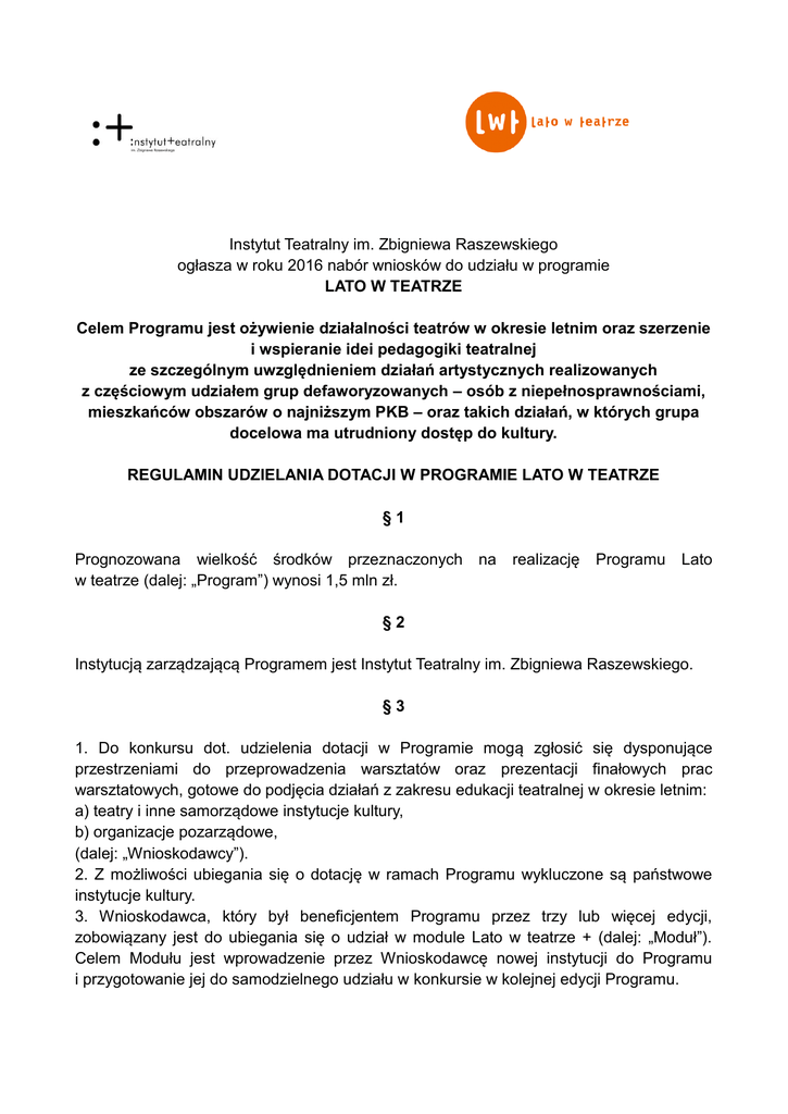 Instytut Teatralny im. Zbigniewa Raszewskiego ogłasza w roku 2016 nabór wniosków do udziału w programie LATO W TEATRZE Celem Programu jest ożywienie działalności teatrów w okresie letnim oraz szerzenie i wspieranie idei pedagogiki teatralnej ze szczególnym uwzględnieniem działań artystycznych realizowanych z częściowym udziałem grup defaworyzowanych – osób z niepełnosprawnościami, mieszkańców obszarów o najniższym PKB – oraz takich działań, w których grupa docelowa ma utrudniony dostęp do kultury. REGULAMIN UDZIELANIA DOTACJI W PROGRAMIE LATO W TEATRZE §1 Prognozowana wielkość środków przeznaczonych w teatrze (dalej: „Program”) wynosi 1,5 mln zł. na realizację Programu Lato §2 Instytucją zarządzającą Programem jest Instytut Teatralny im. Zbigniewa Raszewskiego. §3 1. Do konkursu dot. udzielenia dotacji w Programie mogą zgłosić się dysponujące przestrzeniami do przeprowadzenia warsztatów oraz prezentacji finałowych prac warsztatowych, gotowe do podjęcia działań z zakresu edukacji teatralnej w okresie letnim: a) teatry i inne samorządowe instytucje kultury, b) organizacje pozarządowe, (dalej: „Wnioskodawcy”). 2. Z możliwości ubiegania się o dotację w ramach Programu wykluczone są państwowe instytucje kultury. 3. Wnioskodawca, który był beneficjentem Programu przez trzy lub więcej edycji, zobowiązany jest do ubiegania się o udział w module Lato w teatrze + (dalej: „Moduł”). Celem Modułu jest wprowadzenie przez Wnioskodawcę nowej instytucji do Programu i przygotowanie jej do samodzielnego udziału w konkursie w kolejnej edycji Programu. §4 1. Aby wziąć udział w konkursie na dotację w ramach Programu Wnioskodawca składa wniosek – autorski projekt dwutygodniowych teatralnych warsztatów, półkolonii lub kolonii, którego realizacja planowana jest w okresie letnich wakacji szkolnych w 2016 r., tj. między 27 czerwca a 31 sierpnia 2016 r. (dalej: „Projekt”). 2. Jeden Wnioskodawca może złożyć jeden wniosek w programie. §5 1. Projekt ubiegający się o dotację w ramach Programu Lato w teatrze, jak również w ramach Modułu Lato w teatrze +, musi być zgodny z następującymi kryteriami: a) uczestnikami Projektu są dzieci ze szkoły podstawowej, młodzież z gimnazjum lub szkoły ponadgimnazjalnej w ustalonym przez Wnioskodawcę przedziale wiekowym. Wnioskodawca określa liczbę uczestników (podczas realizacji projektu dopuszcza się jej zmianę nie przekraczającą 10% deklarowanej liczby), b) Projekt nie jest częścią innego projektu, ale stanowi autorską, samodzielną propozycję edukacyjną, c) Projekt polega na prowadzeniu warsztatów twórczych. Praca może odbywać się w grupach (np. grupa aktorska i/lub taneczna, kostiumowo-scenograficzna, muzyczna, promocyjno-dziennikarska, techniczna itp.). Zasady formowania się grup i zasady pracy w grupach ustala Wnioskodawca, d) Projekt kończy co najmniej dwukrotna prezentacja efektów pracy uczestników, e) Dodatkowo w przypadku ubiegania się o udział w Module Lato w teatrze + Projekt przygotowany jest w partnerstwie merytorycznym z instytucją lub organizacją, która do tej pory nie była beneficjentem Programu. Wnioskodawca i jego partner wspólnie przygotowują koncepcję Projektu polegającą na współpracy na wszystkich etapach jego realizacji (rekrutacja uczestników, koordynacja Projektu, współprowadzenie warsztatów artystycznych, przygotowanie budżetu Projektu, nawiązywanie partnerstw z innymi podmiotami). Zasady współpracy ustalają Wnioskodawca wraz z partnerem. 2. W przypadku, gdy Wnioskodawca wybierze formę warsztatów: warsztaty realizowane w ramach Projektu powinny trwać przez 14 dni z ewentualnym wyłączeniem niedziel i świąt. Każdy z uczestników bierze udział w 6 godzinach zegarowych zajęć dziennie. Dokładny wymiar i rozkład czasowy pracy z uczestnikami ustala Wnioskodawca. 3. W przypadku, gdy Wnioskodawca wybierze formę półkolonii lub kolonii teatralnych: a) powinny trwać przez 14 dni z ewentualnym wyłączeniem niedziel i świąt. Każdy z uczestników dziennie bierze udział w 6 godzinach zegarowych zajęć. b) Projektowi powinna towarzyszyć opieka pedagogiczna i medyczna wymagana prawnie przez przepisy prawa powszechnie obowiązującego oraz przepisy wykonawcze, w szczególności rozporządzenia wykonawcze wydane przez MEN. c) Wnioskodawca oświadcza, że zapoznał się z przepisami dotyczącymi organizacji wypoczynku dla dzieci i młodzieży. 4. Projekt może być realizowany w kooperacji z lokalnymi władzami samorządowymi lub kuratorium oświaty. 5. Realizacja Projektu odbywa się w roku, na który została przyznana dotacja. 6. Realizacja Projektu odbywa się na terytorium Rzeczpospolitej Polskiej. 7. Dopuszcza się wprowadzenie oddzielnej opłaty za udział w Projekcie ze strony uczestników w wysokości nie wyższej niż 50 zł za jednego uczestnika, przy założeniu że wprowadzony zostanie także system zwolnień z tych opłat dla osób zagrożonych wykluczeniem społecznym i ekonomicznym. 8. Wskazane w powyższym ustępie wpływy od uczestników zostaną przeznaczone na pokrycie kosztów Projektu. 9. Odpowiedzialność za ubezpieczenie uczestników Projektu oraz ewentualne koszty z nim związane pokrywa Wnioskodawca. §6 1. Dla prawidłowego złożenia wniosku obowiązkowe jest posiadanie konta w Elektronicznym Biurze Obsługi Interesanta (EBOI), dostępnym pod adresem https://esp.mkidn.gov.pl/. 2. Wnioskodawcy używający bezpiecznego podpisu elektronicznego zweryfikowanego przy pomocy kwalifikowanego certyfikatu wypełniają wniosek, a następnie przesyłają go przez system EBOI w terminie do 14 marca 2016 roku. 3. Wnioskodawcy nieużywający bezpiecznego podpisu elektronicznego zweryfikowanego przy pomocy kwalifikowanego certyfikatu: a) wypełniają wniosek i przesyłają go przez system EBOI w terminie określonym w ust. 2; b) drukują automatycznie wypełniony formularz Potwierdze