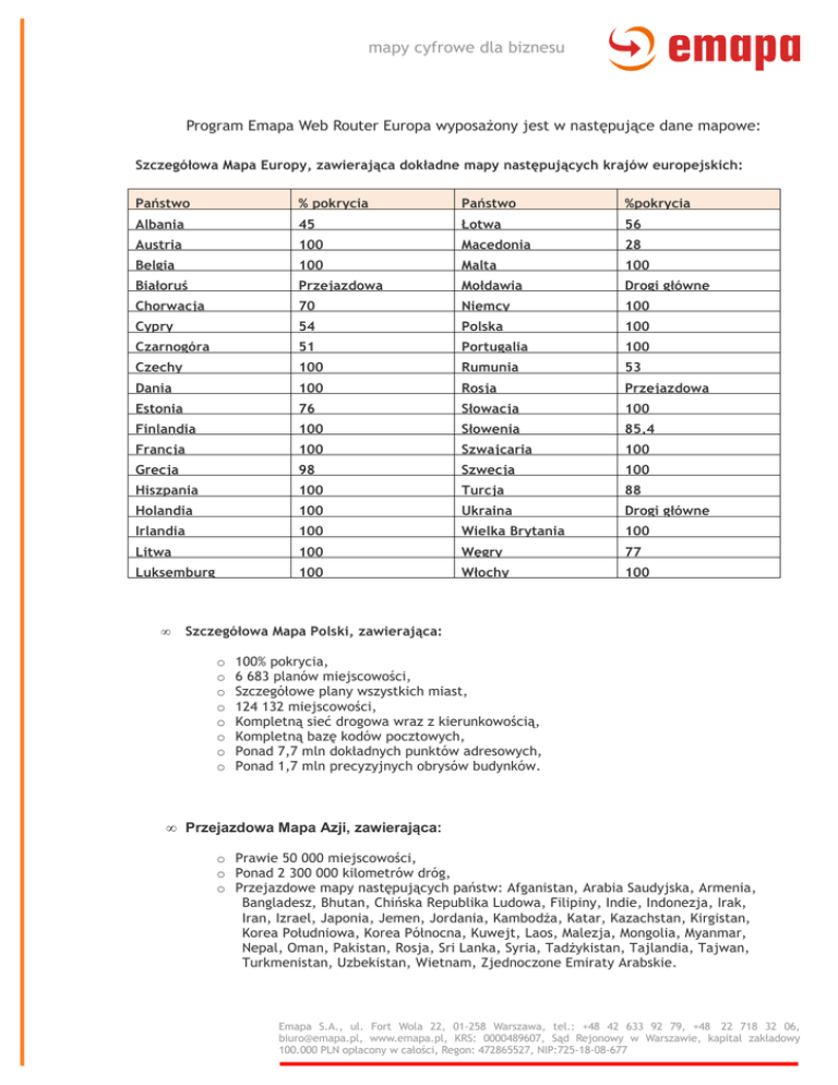 mapy cyfrowe dla biznesu Program Emapa Web Router Europa wyposażony jest w następujące dane mapowe: Szczegółowa Mapa Europy, zawierająca dokładne mapy następujących krajów europejskich: Państwo % pokrycia Państwo %pokrycia Albania 45 Łotwa 56 Austria 100 Macedonia 28 Belgia 100 Malta 100 Białoruś Przejazdowa Mołdawia Drogi główne Chorwacja 70 Niemcy 100 Cypry 54 Polska 100 Czarnogóra 51 Portugalia 100 Czechy 100 Rumunia 53 Dania 100 Rosja Przejazdowa Estonia 76 Słowacja 100 Finlandia 100 Słowenia 85,4 Francja 100 Szwajcaria 100 Grecja 98 Szwecja 100 Hiszpania 100 Turcja 88 Holandia 100 Ukraina Drogi główne Irlandia 100 Wielka Brytania 100 Litwa 100 Węgry 77 Luksemburg 100 Włochy 100 • Szczegółowa Mapa Polski, zawierająca: o o o o o o o o 100% pokrycia, 6 683 planów miejscowości, Szczegółowe plany wszystkich miast, 124 132 miejscowości, Kompletną sieć drogowa wraz z kierunkowością, Kompletną bazę kodów pocztowych, Ponad 7,7 mln dokładnych punktów adresowych, Ponad 1,7 mln precyzyjnych obrysów budynków. • Przejazdowa Mapa Azji, zawierająca: o Prawie 50 000 miejscowości, o Ponad 2 300 000 kilometrów dróg, o Przejazdowe mapy następujących państw: Afganistan, Arabia Saudyjska, Armenia, Bangladesz, Bhutan, Chińska Republika Ludowa, Filipiny, Indie, Indonezja, Irak, Iran, Izrael, Japonia, Jemen, Jordania, Kambodża, Katar, Kazachstan, Kirgistan, Korea Południowa, Korea Północna, Kuwejt, Laos, Malezja, Mongolia, Myanmar, Nepal, Oman, Pakistan, Rosja, Sri Lanka, Syria, Tadżykistan, Tajlandia, Tajwan, Turkmenistan, Uzbekistan, Wietnam, Zjednoczone Emiraty Arabskie. Emapa S.A., ul. Fort Wola 22, 01-258 Warszawa, tel.: +48 42 633 92 79, +48 22 718 32 06, [email protected], www.emapa.pl, KRS: 0000489607, Sąd Rejonowy w Warszawie, kapitał zakładowy 100.000 PLN opłacony w całości, Regon: 472865527, NIP:725-18-08-677