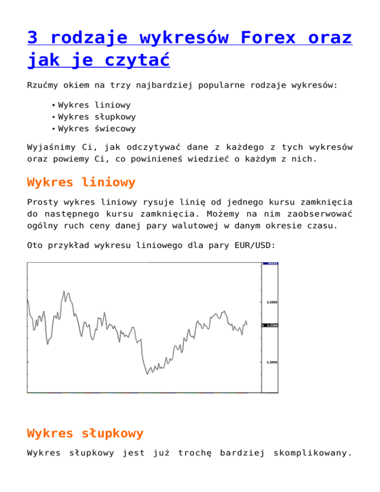 3 rodzaje wykresów Forex oraz jak je czytać Rzućmy okiem na trzy najbardziej popularne rodzaje wykresów: Wykres liniowy Wykres słupkowy Wykres świecowy Wyjaśnimy Ci, jak odczytywać dane z każdego z tych wykresów oraz powiemy Ci, co powinieneś wiedzieć o każdym z nich. Wykres liniowy Prosty wykres liniowy rysuje linię od jednego kursu zamknięcia do następnego kursu zamknięcia. Możemy na nim zaobserwować ogólny ruch ceny danej pary walutowej w danym okresie czasu. Oto przykład wykresu liniowego dla pary EUR/USD: Wykres słupkowy Wykres słupkowy jest już trochę bardziej skomplikowany. Pokazuje on ceny otwarcia i zamknięcia, a także wzloty i upadki ceny. Pionowy pasek pokazuje najniższą cenę w danym czasie, podczas gdy górna część słupka przedstawia cenę najwyższą. Sam pionowy pasek wskazuje zakres obrotu pary walutowej jako całości. Pozioma linia po lewej stronie paska to cena otwarcia, a po prawej stronie to cena zamknięcia. Oto przykład wykresu słupkowego dla pary EUR/USD: „Słupkiem” nazywa się często odniesienie do pojedynczego elementu danych na wykresie. Słupek jest odcinkiem czasu. Nieważne, czy jest to jeden dzień, czy też jeden miesiąc. Zawsze słysząc słowo „słupek” musisz wiedzieć do czego się on odwołuje. Wykresy słupkowe są także nazywane wykresami „OHLC” (ang. Open-High-Low-Close) ponieważ przedstawiają otwarcie, zamknięcie, cenę najwyższą i najniższą. Oto przykład słupka ceny: Open: Mała pozioma linia po lewej stronie – przedstawia cenę otwarcia High: Najwyższa część pionowej linii – przedstawia najwyższą cenę w danym czasie Low: Najniższa część pionowej linii – przedstawia najniższą cenę w danym czasie Close: Pozioma linia po prawej stronie – przedstawia cenę zamknięcia Wykresy świecowe Wykres świecowy przedstawia te same informacje na temat cen co wykres słupkowy, lecz w bardziej klarowny i bardziej przystępny graficznie sposób. Cena najwyższa i najniższa, tak samo jak w wykresie słupkowym, przedstawiana jest za pomocą pionowej linii. Blok (tzw. „świeca”) pomiędzy poziomymi kreskami przedstawia zakres pomiędzy cenami otwarcia i zamknięcia. Ustalone jest, że jeśli bloczek ten jest wypełniony lub kolorowy, wtedy para została zamknięta po niższej cenie, niżeli została otworzona. W poniższym przykładzie wypełnienie jest czarne. Dla naszych słupków góra bloku to cena otwarcia, a dół to cena zamknięcia. Jeżeli cena zamknięcia jest wyższa niż cena otwarcia to blok będzie pusty lub po prostu niezamalowany. My, w naszej szkółce nie przepadamy za wykresami czarno-białymi. Są one po prostu nieprzyjemne dla oka. Skoro spędzamy tak wiele czasu patrząc na wykresy, to wolelibyśmy patrzeć na wykres, który jest kolorowy. Kolorowy telewizor jest przecież znacznie lepszy niż czarno-biały, więc czemu nie używać dla wygody kolorowych wykresów? Zamieńmy więc kolory – zielony zamiast białego (pustego) oraz czerwony zamiast czarnego. Teraz więc, gdy cena zamknięcia będzie wyższa niż cena otwarcia, nasza świeca będzie zielona. Jeżeli cena zamknięcia będzie niższa niż cena otwarcia, to świeca będzie czerwona. Oto przykład wykresu świecowego dla pary EUR/USD. Czy nie wygląda ładniej? Celem wykresów świecowych jest pomoc w wizualizacji, ponieważ jeśli chodzi o informacje, to przedstawiają one te same dane co wykresy OHLC. Oto zalety wykresów świecowych: Wykresy świecowe są łatwiejsze do interpretacji, oraz stanowią dobrą podstawę do analizowania rynku Forex przez początkujących przedsiębiorców. Świece są łatwe w użyciu. Twoje oczy prawie natychmiast przystosowują się do informacji przedstawionych na wykresie. Poza tym, udowodniono, że lepsza wizualizacja pomaga w nauce, a przecież właśnie jesteś w jej trakcie. Świece oraz wzory wykresów świecowych często posiadają własne nazwy jak np. „spadająca gwiazda”. Dzięki nim łatwiej zapamiętać, co oznacza wzór. Świece są dobre do identyfikacji punktów zwrotnych rynku – odwrócenia się trendu wzrostowego na spadkowy lub trendu spadkowego do wzrostowego. Źródło:http://www.babypips.com/school/kindergarten/types-of-ch arts/types-of-charts.html