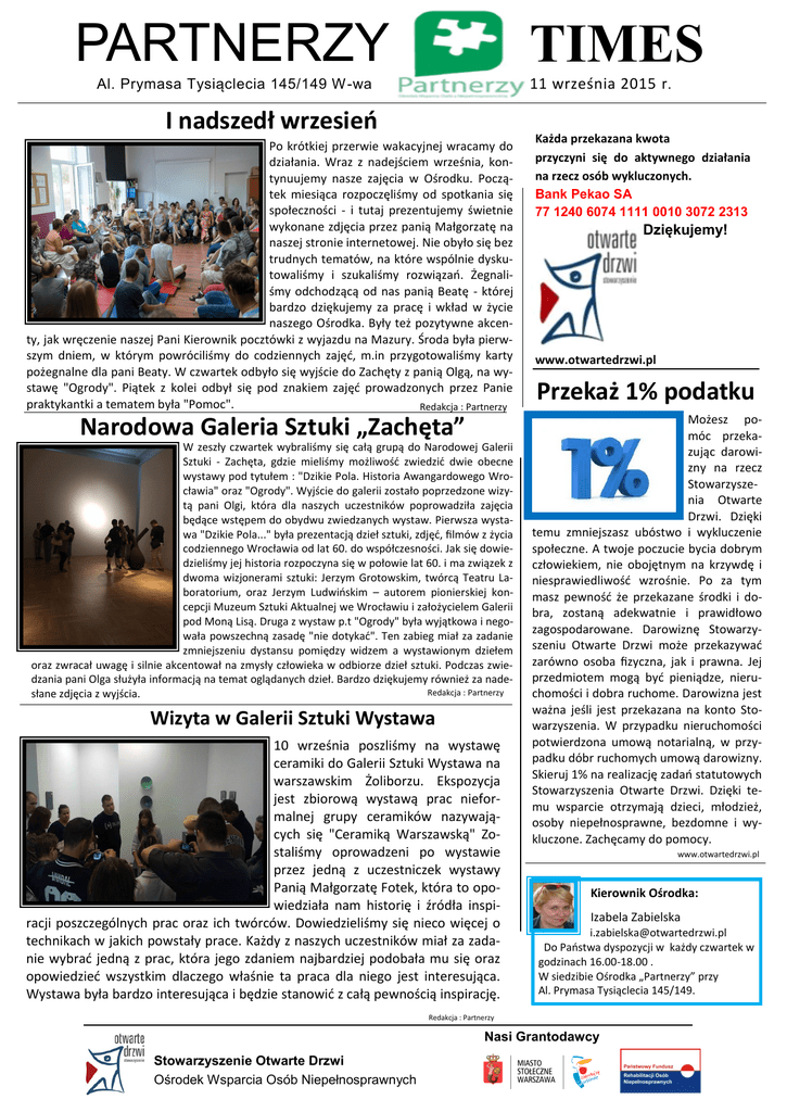 TIMES PARTNERZY Al. Prymasa Tysiąclecia 145/149 W -wa 11 września 2015 r. I nadszedł wrzesień Po krótkiej przerwie wakacyjnej wracamy do działania. Wraz z nadejściem września, kontynuujemy nasze zajęcia w Ośrodku. Początek miesiąca rozpoczęliśmy od spotkania się społeczności - i tutaj prezentujemy świetnie wykonane zdjęcia przez panią Małgorzatę na naszej stronie internetowej. Nie obyło się bez trudnych tematów, na które wspólnie dyskutowaliśmy i szukaliśmy rozwiązań. Żegnaliśmy odchodzącą od nas panią Beatę - której bardzo dziękujemy za pracę i wkład w życie naszego Ośrodka. Były też pozytywne akcenty, jak wręczenie naszej Pani Kierownik pocztówki z wyjazdu na Mazury. Środa była pierwszym dniem, w którym powróciliśmy do codziennych zajęć, m.in przygotowaliśmy karty pożegnalne dla pani Beaty. W czwartek odbyło się wyjście do Zachęty z panią Olgą, na wystawę "Ogrody". Piątek z kolei odbył się pod znakiem zajęć prowadzonych przez Panie praktykantki a tematem była "Pomoc". Redakcja : Partnerzy Narodowa Galeria Sztuki „Zachęta” W zeszły czwartek wybraliśmy się całą grupą do Narodowej Galerii Sztuki - Zachęta, gdzie mieliśmy możliwość zwiedzić dwie obecne wystawy pod tytułem : "Dzikie Pola. Historia Awangardowego Wrocławia" oraz "Ogrody". Wyjście do galerii zostało poprzedzone wizytą pani Olgi, która dla naszych uczestników poprowadziła zajęcia będące wstępem do obydwu zwiedzanych wystaw. Pierwsza wystawa "Dzikie Pola..." była prezentacją dzieł sztuki, zdjęć, filmów z życia codziennego Wrocławia od lat 60. do współczesności. Jak się dowiedzieliśmy jej historia rozpoczyna się w połowie lat 60. i ma związek z dwoma wizjonerami sztuki: Jerzym Grotowskim, twórcą Teatru Laboratorium, oraz Jerzym Ludwińskim – autorem pionierskiej koncepcji Muzeum Sztuki Aktualnej we Wrocławiu i założycielem Galerii pod Moną Lisą. Druga z wystaw p.t "Ogrody" była wyjątkowa i negowała powszechną zasadę "nie dotykać". Ten zabieg miał za zadanie zmniejszeniu dystansu pomiędzy widzem a wystawionym dziełem oraz zwracał uwagę i silnie akcentował na zmysły człowieka w odbiorze dzieł sztuki. Podczas zwiedzania pani Olga służyła informacją na temat oglądanych dzieł. Bardzo dziękujemy również za nadeRedakcja : Partnerzy słane zdjęcia z wyjścia. Wizyta w Galerii Sztuki Wystawa 10 września poszliśmy na wystawę ceramiki do Galerii Sztuki Wystawa na warszawskim Żoliborzu. Ekspozycja jest zbiorową wystawą prac nieformalnej grupy ceramików nazywających się "Ceramiką Warszawską" Zostaliśmy oprowadzeni po wystawie przez jedną z uczestniczek wystawy Panią Małgorzatę Fotek, która to opowiedziała nam historię i źródła inspiracji poszczególnych prac oraz ich twórców. Dowiedzieliśmy się nieco więcej o technikach w jakich powstały prace. Każdy z naszych uczestników miał za zadanie wybrać jedną z prac, która jego zdaniem najbardziej podobała mu się oraz opowiedzieć wszystkim dlaczego właśnie ta praca dla niego jest interesująca. Wystawa była bardzo interesująca i będzie stanowić z całą pewnością inspirację. Każda przekazana kwota przyczyni się do aktywnego działania na rzecz osób wykluczonych. Bank Pekao SA 77 1240 6074 1111 0010 3072 2313 Dziękujemy! www.otwartedrzwi.pl Przekaż 1% podatku Możesz pomóc przekazując darowizny na rzecz Stowarzyszenia Otwarte Drzwi. Dzięki temu zmniejszasz ubóstwo i wykluczenie społeczne. A twoje poczucie bycia dobrym człowiekiem, nie obojętnym na krzywdę i niesprawiedliwość wzrośnie. Po za tym masz pewność że przekazane środki i dobra, zostaną adekwatnie i prawidłowo zagospodarowane. Darowiznę Stowarzyszeniu Otwarte Drzwi może przekazywać zarówno osoba fizyczna, jak i prawna. Jej przedmiotem mogą być pieniądze, nieruchomości i dobra ruchome. Darowizna jest ważna jeśli jest przekazana na konto Stowarzyszenia. W przypadku nieruchomości potwierdzona umową notarialną, w przypadku dóbr ruchomych umową darowizny. Skieruj 1% na realizację zadań statutowych Stowarzyszenia Otwarte Drzwi. Dzięki temu wsparcie otrzymają dzieci, młodzież, osoby niepełnosprawne, bezdomne i wykluczone. Zachęcamy do pomocy. www.otwartedrzwi.pl Kierownik Ośrodka: Izabela Zabielska [email protected] Do Państwa dyspozycji w każdy czwartek w godzinach 16.00-18.00 . W siedzibie Ośrodka „Partnerzy” przy Al. Prymasa Tysiąclecia 145/149. Redakcja : Partnerzy Nasi Grantodawcy Stowarzyszenie Otwarte Drzwi Ośrodek Wsparcia Osób Niepełnosprawnych Ruszyła grupa fotograficzna Tym razem grupa fotograficzna szukała w plenerowych portretach czegoś, co nosi angielską nazwę: bokeh (polskiej nazwy nie ma). To te rozświetlone światłem kółka. Występują tylko wtedy, gdy używamy " długich" obiektywów i otwieramy przysłonę do końca. Trzeba też zadbać o to, by świecące punkty (dziury w listowiu drzew) były wystarczająco daleko. Jak widać, bokeh nie przeszkadza portretom, wręcz przeciwnie, dodaje im głębi. A potem postanowiliśmy poprzyglądać się światu przez dziurkę. Zajęcia w pracowni Ostatnio w pracowni komputerowej pomimo niezachęcającej pogody aż kipiało od energii i chęci do pracy. Z powodu zbliżającego się Wielkiego Turnieju Piłki Nożnej, uczestnicy pracowni zabrali się za tworzenie własnych projektów graficznych przyszłego plakatu turniejowego. Najpierw pojawiały się wstępne propozycje na papierze, a następnie pojawiły się początkowe projekty graficzne. Kulminacyjnym momentem stał się koniec zajęć, podczas którego nie wytrzymał sprzęt ! Ostatecznie powstał bardzo ciekawy projekt, który już wkrótce z przyjemnością zaprezentujemy. m Redakcja : partnerzy Redakcja : Partnerzy Przepis na weekend : Pieczone piersi kurczaka z pesto, pomidorami i mozzarellą Na ten weekend proponujemy wspaniałą pieczoną pierś z kurczaka z pesto, pomidorami or