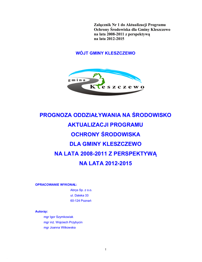 Załącznik Nr 1 do Aktualizacji Programu Ochrony Środowiska dla Gminy Kleszczewo na lata 2008-2011 z perspektywą na lata 2012-2015 WÓJT GMINY KLESZCZEWO PROGNOZA ODDZIAŁYWANIA NA ŚRODOWISKO AKTUALIZACJI PROGRAMU OCHRONY ŚRODOWISKA DLA GMINY KLESZCZEWO NA LATA 2008-2011 Z PERSPEKTYWĄ NA LATA 2012-2015 OPRACOWANIE WYKONAŁ: Abrys Sp. z o.o. ul. Daleka 33 60-124 Poznań Autorzy: mgr Igor Szymkowiak mgr inż. Wojciech Przybycin mgr Joanna Witkowska 1 Lipiec 2010 r. 2 1. PROGNOZA ODDZIAŁYWANIA PROGRAMU NA ŚRODOWISKO................................ ............ 5 1.1. 1.2. 1.3. 1.4. PODSTAWA PRAWNA I CEL OPRACOWANIA PROGNOZY ................................................................ 5 INFORMACJE O ZAWARTOŚCI PROGNOZY ................................ ................................ ................... 6 POWIĄZANIE AKTUALIZACJI PROGRAMU Z INNYMI DOKUMENTAMI .................................................. 7 OCENA ZGODNOŚCI PROJEKTU AKTUALIZACJI PROGRAMU Z CELAMI OCHRONY ŚRODOWISKA USTANOWIONYMI NA SZCZEBLU WSPÓLNOTOWYM, KRAJOWYM I REGIONALNYM......................................... 7 1.4.1. Polityka Unii Europejskiej ................................ .............................................................. 7 1.4.2. Polityka Ekologiczna Państwa ....................................................................................... 9 1.4.3. Dokumenty regionalne ................................................................................................. 10 1.4.4. Priorytety wyznaczone w programach szczebla wyższego ........................................... 10 1.5. METODY ZASTOSOWANE PRZY SPORZĄDZANIU PROGNOZY ................................ ........................ 11 1.6. PRZEWIDYWANE METODY ANALIZY SKUTKÓW REALIZACJI POSTANOWIEŃ PROJEKTOWANEGO DOKUMENTU ORAZ CZĘSTOTLIWOŚĆ JEJ PRZEPROWADZANIA ................................ ............................... 11 2. ISTNIEJĄCY STAN ŚRODOWISKA W GMINIE........................................................................ 12 2.1. 2.2. 2.3. 2.4. 2.5. OGÓLNA CHARAKTERYSTYKA GMINY ....................................................................................... 12 INFRASTRUKTURA INŻYNIERYJNO-TECHNICZNA ......................................................................... 15 W ALORY PRZYRODNICZE W GMINIE ......................................................................................... 17 GLEBY................................................................................................................................. 17 Z ASOBY NATURALNE WYSTĘPUJĄCE NA TERENIE GMINY ............................................................ 18 3. POTENCJALNE ZMIANY STANU ŚRODOWISKA W PRZYPADKU BRAKU REALIZACJI PROJEKTU AKTUALIZACJI PROGRAMU OCHRONY ŚRODOWISKA DLA GMINY KLESZCZEWO 19 4. ANALIZA STANU ŚRODOWISKA NA OBSZARACH OBJĘTYCH PRZEWIDYWANYM ZNACZĄCYM ODDZIAŁYWANIEM ................................................................................................. 19 4.1. 4.2. 4.3. 4.4. 4.5. STAN GLEB .......................................................................................................................... 19 JAKOŚĆ WÓD ....................................................................................................................... 21 Z ANIECZYSZCZENIE POWIETRZA ............................................................................................. 22 ODDZIAŁYWANIE HAŁASU ....................................................................................................... 25 ODDZIAŁYWANIE PÓL ELEKTROMAGNETYCZNYCH ..................................................................... 28 5. ANALIZA I OCENA ISTNIEJĄCYCH PROBLEMÓW OCHRONY ŚRODOWISKA ISTOTNYCH Z PUNKTU WIDZENIA PROJEKTU AKTUALIZACJI PROGRAMU OCHRONY ŚRODOWISKA DLA GMINY KLESZCZEWO................................................................ ................................ .................... 29 5.1. 5.2. 5.3. 5.4. 5.5. 5.6. 5.7. Z ASOBY PRZYRODNICZE ........................................................................................................ 29 POWIERZCHNIA ZIEMI ............................................................................................................ 30 W ODY PODZIEMNE I POWIERZCHNIOWE ................................................................................... 30 Z AGROŻENIE POWODZIOWE I PRZED SKUTKAMI SUSZY .............................................................. 31 Z ANIECZYSZCZENIE POWIETRZA ATMOSFERYCZNEGO ................................ ............................... 31 HAŁAS ................................................................................................................................. 32 POLA ELEKTROMAGNETYCZNE ................................ ................................ ............................... 33 6. CELE OCHRONY ŚRODOWISKA USTANOWIONE NA SZCZEBLU MIĘDZYNARODOWYM, WSPÓLNOTOWYM I KRAJOWYM, ISTOTNE Z PUNKTU WIDZENIA AKTUALIZACJI PROGRAMU ORAZ SPOSOBY W JAKICH TE CELE I INNE PROBLEMY ŚRODOWISKA ZOSTAŁY UWZGLĘDNIONE PODCZAS OPRACOWYWANIA AKTUALIZACJA PROGRAMU ....................... 33 7. IDENTYFIKACJA I OCENA PRZEWIDYWANYCH ZNACZĄCYCH ODDZIAŁYWAŃ NA ŚRODOWISKO, W TYM ODDZIAŁYWANIA BEZPOŚREDNIE, POŚREDNIE, WTÓRNE, SKUMULOWANE, KRÓTKOTERMINOWE, ŚREDNIOTERMINOWE I DŁUGOTERMINOWE, STAŁE I CHWILOWE ORAZ POZYTYWNE I NEGATYWNE ....................................................................... 36 8. ROZWIĄZANIA MAJĄCE NA CELU ZAPOBIEGANIE, OGRANICZANIE LUB KOMPENSACJĘ PRZYRODNICZĄ NEGATYWNYCH ODDZIAŁYWAŃ NA ŚRODOWISKO................................ ...... 56 OPTYMALIZACJA GOSPODARKI WODNO-ŚCIEKOWEJ ................................................................ .. 56 RACJONALIZACJA SYSTEMU GOSPODARKI ODPADAMI ................................................................ 57 OCHRONA POWIETRZA I OBNIŻENIE POZIOMU HAŁASU ................................ ........................