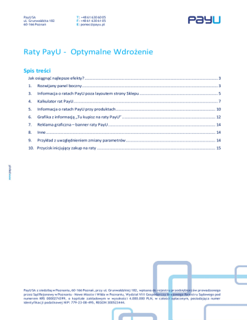 PayU SA ul. Grunwaldzka 182 60-166 Poznań T: +48 61 630 60 05 F: +48 61 630 61 05 E: [email protected] Raty PayU - Optymalne Wdrożenie Spis treści Jak osiągnąd najlepsze efekty? ........................................................................................................... 3 1. Rozwijany panel boczny ............................................................................................................. 3 3. Informacja o ratach PayU poza layoutem strony Sklepu ............................................................... 5 4. Kalkulator rat PayU .................................................................................................................... 7 5. Informacja o ratach PayU przy produktach ................................................................................ 10 6. Grafika z informacją „Tu kupisz na raty PayU” ........................................................................... 12 7. Reklama graficzna – banner raty PayU ...................................................................................... 14 8. Inne ........................................................................................................................................ 14 9. Przykład z uwzględnieniem zmiany parametrów ........................................................................ 14 10. Przycisk inicjujący zakup na raty ............................................................................................... 15 PayU SA z siedzibą w Poznaniu, 60-166 Poznań, przy ul. Grunwaldzkiej 182, wpisana do rejestru przedsiębiorców prowadzonego przez Sąd Rejonowy w Poznaniu – Nowe Miasto i Wilda w Poznaniu, Wydział VIII Gospodarczy Krajowego Rejestru Sądowego pod numerem KRS 0000274399, o kapitale zakładowym w wysokości 4.000.000 PLN, w całości opłaconym, posiadająca numer identyfikacji podatkowej NIP: 779-23-08-495, REGON 300523444. PayU SA ul. Grunwaldzka 182 60-166 Poznań T: +48 61 630 60 05 F: +48 61 630 61 05 E: [email protected] Informacje ogólne Wśród najczęściej podawanych przez przedsiębiorców powodów, dla których warto uruchamiad i promowad raty w sklepach są m.in.: wzrost sprzedaży (sięgający nawet 10%), budowanie wizerunku sklepu, poprzez dostarczenie e-Klientowi kompleksowej i innowacyjnej oferty. Celem każdego e-biznesu jest budowanie kompleksowej i innowacyjnej oferty dla swoich klientów. Aby to jednak osiągnąd każdy e-Sklep musi spełnid 2 założenia: zaoferowad potencjalnemu e-Konsumentowi jak najszerszą gamę rozwiązao do realizowania płatności online (w tym płatności na raty), w prosty i nieinwazyjny sposób poinformowad o udostępnianej usłudze. Stosowanie się do zaleceo poniższego dokumentu niesie ze sobą szereg korzyści: zapewnia pełny profesjonalizm w kontaktach z Klientami Sklepu; gwarantuje umieszczenie odpowiedniej ilości informacji dla Klienta o możliwości zapłacenia na raty; sprzyja utrzymaniu zainteresowania Klienta, co oddziałuje korzystnie na liczbę transakcji zakooczonych pomyślnie; ułatwia Klientowi szybkie dokonanie płatności; sprawi, że zadowoleni Klienci powrócą do Sklepu. Niestosowanie rozwiązao prezentowanych w dokumencie: może mied wpływ na wydłużenie czasu pomiędzy podjęciem decyzji o zakupie a płatnością; może skutkowad zwiększoną liczbą niedokooczonych transakcji i spadkiem sprzedaży. Mając na uwadze powyższe wskazówki, przygotowaliśmy poradnik opisujący najlepsze sposoby na zaprezentowanie e-Klientowi informacji dotyczących możliwości kupowania produktów w Twoim sklepie na raty. PayU SA z siedzibą w Poznaniu, 60-166 Poznań, przy ul. Grunwaldzkiej 182, wpisana do rejestru przedsiębiorców prowadzonego przez Sąd Rejonowy w Poznaniu – Nowe Miasto i Wilda w Poznaniu, Wydział VIII Gospodarczy Krajowego Rejestru Sądowego pod numerem KRS 0000274399, o kapitale zakładowym w wysokości 4.000.000 PLN, w całości opłaconym, posiadająca numer identyfikacji podatkowej NIP: 779-23-08-495, REGON 300523444. PayU SA ul. Grunwaldzka 182 60-166 Poznań T: +48 61 630 60 05 F: +48 61 630 61 05 E: [email protected] Wdrożenie rat PayU podzieliliśmy na 2 etapy: Etap 1. Wdrożenie systemowe (implementacja mechanizmów do realizowania płatności ratalnej) . Raty PayU włączane są automatycznie. Uruchomienie rat PayU odbywa się bezpłatnie. Etap 2. Działania na stronie www Sklepu informujące Klientów o dostępności usługi raty PayU. Poniższy dokument, umożliwia proste i szybkie wdrożenie gotowych rozwiązao na stronie Twojego e-Sklepu z zachowaniem profesjonalnego podejścia do Klienta. Jak osiągnąd najlepsze efekty? W celu wypromowania rat PayU jako metody płatności oraz zachowania najlepszej płynności przebiegu transakcji ulepsz stronę Sklepu (punkty 1-7). W każdym punkcie znajdziesz krótki opis z przedstawieniem graficznym rozwiązania oraz kroki, które pokazują jak je wdrożyd. 1. Rozwijany panel boczny Panel z informacjami o ratach PayU w formie zakładki umożliwiający umieszczenie oferty oraz powiązanych treści na stronie Sklepu bez wykorzystywania dużego obszaru strony Sklepu. Wszystkie niezbędne oraz dodatkowe informacje są dostępne w okienku, które w intuicyjny sposób rozwija się po kliknięciu zakładki zakotwiczonej na krawędzi okna przeglądarki. PayU SA z siedzibą w Poznaniu, 60-166 Poznań, przy ul. Grunwaldzkiej 182, wpisana do rejestru przedsiębiorców prowadzonego przez Sąd Rejonowy w Poznaniu – Nowe Miasto i Wilda w Poznaniu, Wydział VIII Gospodarczy Krajowego Rejestru Sądowego pod numerem KRS 0000274399, o kapitale zakładowym w wysokości 4.000.000 PLN, w całości opłaconym, posiadająca numer identyfikacji podatkowej NIP: 779-23-08-495, REGON 300523444. PayU SA ul. Grunwaldzka 182 60-166 Poznań T: +48 61 630 60 05 F: +48 61 630 61 05 E: [email protected] Przedstawienie graficzne: a) Dla lepszej widoczności panelu na stronach o jasnym tle sugerujemy wersję ni
