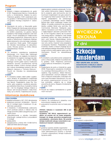 Program 1 DZIEŃ Wyjazd z miejsca zamieszkania ok. godz. 01.00. Przejazd przez Niemcy i Holandię do portu w Amsterdamie. Wejście na prom. Odprawa godzina 15.00 wypłynięcie promu godzina 17.00 Przeprawa do Newcastle (16 godzin). Nocleg w kajutach 4 - osobowych. 2 DZIEŃ Zawinięcie do portu w Newcastle godz. 09.00. Przejazd do Edynburga przez słynący z widoków Northumberland National Park. Po krótkim przystanku na granicy Szkocji będziemy mieli okazję podziwiać uroki Jedburgh i innych przepięknych miejscowości szkockiego pogranicza. Zatrzymamy się na postój w historycznym miasteczku Melrose, gdzie zobaczymy ruiny słynnego cysterskiego opactwa. Około godz. 15.00 przyjazd do Ośrodka harcerskiego na zakwaterowanie. Pierwszy spacer po stolicy Szkocji. Obiadokolacja. Nocleg 3 DZIEŃ Po śniadaniu całodzienne zwiedzanie Edynburga, m,in. Royal Mile, Edinburgh Castle z którego, ze względu na doskonałe położenie na wzgórzu rozciąga się piękny widok na miasto, The Scotch Whisky Heritage Centre gdzie oprócz możliwości śledzenia procesu powstawania słynnej szkockiej whiskey można również pokusić się o zakup niewielkiego prezentu dla najbliższych, zabawa w Camera Obscura… Powrót do Ośrodka na obiadokolację i nocleg. 4 DZIEŃ Po śniadaniu kolejny dzień pełen wyjątkowych atrakcji. W przepięknym krajobrazie polodowcowym zobaczymy urok prawdziwej Szkocji. Przejedziemy przez the Trossachs, góry związane z postacią szkockiego rozbójnika Roba Roya. Zwiedzimy Dolinę Łez – nie ma drugiego takiego miejsca w Szkocji – jest ona jej symbolem, małą miniaturką, są tu strome, majestatyczne szczyty, piękne jeziora i połacie wrzosowisk. To również ważne historycznie miejsce. Niejedna łza tu popłynie, gdy zachwycimy się malowniczym krajobrazem lub gdy posłuchamy tragicznej historii sprzed trzystu lat. Następnie przejedziemy do położonego u podnóża najwyższego szczytu Wielkiej Brytanii Ben Nevis urokliwego miasta Fort William. W pobliżu postaramy się poszukać śladów polskiej historii przy pomniku the Commando Memorial. Następnie pojedziemy nad jezioro Loch Ness na spotkanie z najsłynniejszym szkockim potworem Nessie. W Fort Augustus udamy się na spacer nad brzeg jeziora i będziemy mieli okazję podziwiać system śluz, które obniżają poziom wód Kanału Kaledońskiego zwany Schodami Neptuna. Zobaczymy malownicze ruiny zamku Urquhart oraz przepiękne wodospady Morriston. Przejedziemy przez Inverness, miasto w którym znajduje się zamek szekspirowskiego Macbetha. Do Edynburga wrócimy przez piękne doliny gór the Grampians. Powrót na obiadokolację i nocleg. 5 DZIEŃ Po śniadaniu wykwaterowanie i przejazd do portu w Newcastle. Wejście na pokład około godziny 15.00. Przeprawa promowa z Newcastle do Amsterdamu (16 godzin). 6 DZIEŃ Przypłynięcie do portu w Holandii ok. godz. 09.00. Proponujemy zwiedzanie Amsterdamu, zwanego Wenecją północy m.in.: Plac Lejdena, targ kwiatowy, Wieża Mennicy, ulica Kalvestraat z licznymi sklepami, Plac Dam z Pałacem Królewskim, Kościołem Nowym oraz Pomnikiem Narodowym. Po czasie wolnym, przeznaczonym na lunch i zakup pamiątek, udajemy się w drogę powrotną do domu. Wyjazd z Amsterdamu ok. godz. 15.00 WYCIECZKA SZKOLNA 7 dni Szkocja Amsterdam PRZY GRUPIE MIN. 40 OSÓB, DODATKOWO 4 MIEJSCA GRATIS DLA NAUCZYCIELI-OPIEKUNÓW! 7 DZIEŃ Powrót do miejsca zamieszkania w godzinach nocnych. Informacje dodatkowe CENA ZAWIERA CENA NIE ZAWIERA przejazd autokarem z WC, DVD, klimatyzacją przeprawa promem Amsterdam - Newcastle (2 noclegi) kajuty 4-osobowe (16 godzin) bez wyżywienia 3 śniadania, 3 obiadokolacje, pakowany lunch podczas pobytu w Szkocji oraz na drogę powrotną dzieci przygotowują z prowiantu biura zakwaterowanie w ośrodku harcerskim (Edynburgh – pokoje 4,6,8 os. z umywalkami 3 noclegi) opiekę pilota ubezpieczenie w firmie AXA 10 000 EUR KL 2000 EUR NNW 200 EUR bagaż Cena wycieczki Ośrodek Harcerski 1155 PLN biletów do zwiedzanych obiektów oraz komunikacji miejskiej ok.35f wyżywienia na promie oraz na trasie przejazdu UWAGA: Zaliczka w wysokości 300 zł jest bezzwrotna. Uczestnicy NIE MAJĄ zapewnionych posiłków na promie ani na trasie przejazdu. Kanapki na drogę powrotną przygotowują samodzielnie z prowiantu Biura. Na promie istnieje możliwość zakupu wyżywienia w pokładowych barach i restauracjach. WAŻNE godzinę wyjazdu określa organizator w przypadku mniejszej grupy (mniej niż 40 osób pełnopłatnych) prosimy o kontakt z biurem organizatora. Istnieje możliwość łączenia szkół. DOPŁATY za wyjazd z województw pomorskiego, kujawsko-pomorskiego, wielkopolskie 40 PLN/os. mazowieckiego 60 PLN/os. zachodniopomorskiego, lubuskiego bez dopłaty www.voyage.pila.pl 11