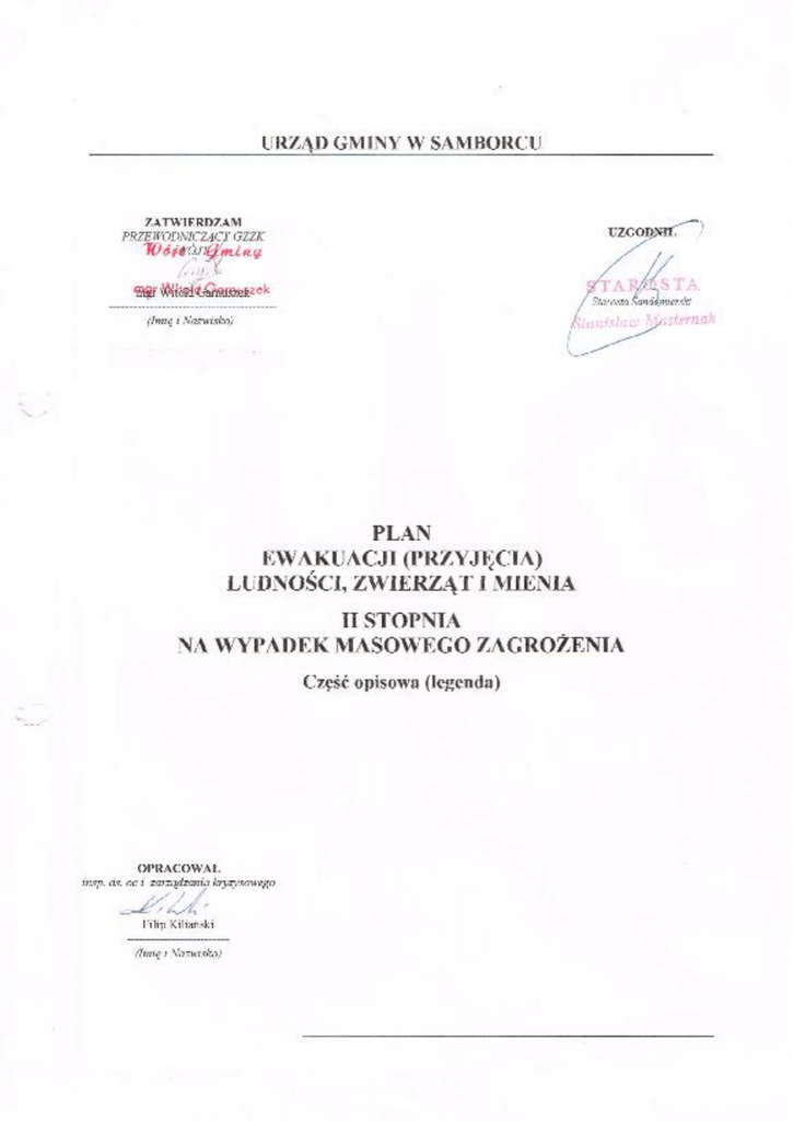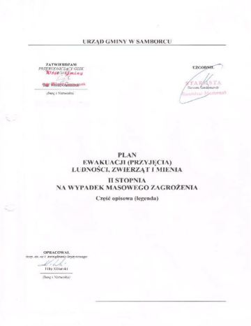 2 STRONA UZGODNIEŃ Lp. Osoba Funkcyjna 1. Powiatowy Inspektor Sanitarny w Sandomierzu 2. Powiatowy Lekarz Weterynarii w Sandomierzu 3. Komendant Gminny OSP w Samborcu 4. Kierownik Gminnego Ośrodka Pomocy Społecznej w Samborcu 5. Kierownik Samodzielnego Publicznego Zakładu Opieki Zdrowotnej w Samborcu 6. Kierownik Posterunku Policji w Samborcu 7. Dyrektor Zespołu Placówek Oświatowych w Samborcu 8. Dyrektor Szkoły Podstawowej w Złotej Data i Podpis Uwagi 3 SPIS TREŚCI Lp. Nazwa dokumentu Strona CZĘŚĆ OPISOWA Wstęp -5 I. Cel i zamiar ewakuacji (przyjęcia) ludności ………………………….……... - 19 II. Wykaz osób kierujących procesem ewakuacji (przyjęcia ) ludności i plan ich powiadamiania …………………………………………………..... - 22 III. Sposób powiadamiania ludności o zarządzonej ewakuacji ……………..…. - 24 IV. Organizacja powiadamiania sołectw o ewakuacji (przyjęciu) ludności oraz łączności kierowania i współdziałania ……………………………………. - 27 V. Zestawienie elementów organizacyjnych ewakuacji (przyjęcia) i czas ich rozwinięcia …………………………………………………………………. - 29 Zestawienie ludności planowanej do ewakuacji (przyjęcia) i zagrożonej zniszczeniem infrastruktury z podziałem na poszczególne sołectwa ……….. - 30 VII. Zestawienie planowanych, niezbędnych środków transportowych do zabezpieczenia ewakuacji (przyjęcia) ludności ……………………….…….. - 32 VIII. Organizacja zabezpieczenia porządkowo – ochronnego i regulacji ruchu ….. - 33 IX. Organizacja zabezpieczenia medyczno – sanitarnego i technicznego …..…... - 34 X. Zadania i podział odpowiedzialności członków Gminnego Zespołu Zarządzania Kryzysowego w procesie ewakuacji …………………………... - 36 VI. Załącznik: 1. 2. 3. 4. 5. 6. 7. 8. 9. Sygnały alarmowe i komunikaty ostrzegawcze Normy żywieniowo-bytowe ludzi i zwierząt Zabezpieczenie potrzeb żywnościowych osób ewakuowanych Karta ewakuacji Karta ewidencji osób ewakuowanych Karta ewidencji ewakuowanych grup osób Karta ewidencji ewakuowanych zwierząt Karta ewidencji ewakuowanego mienia Porozumienia CZĘŚĆ GRAFICZNA Mapa w skali 1:25 000 4 ARKUSZ ZMIAN Lp. Opis zmiany Data wprowadzenia Podpis 5 WSTĘP Plan ewakuacji (przyjęcia) ludności, zwierząt i mienia II stopnia na wypadek masowego zagrożenia ma umożliwić wypełnienie obowiązku, jaki nakłada na Wójta art. 5 ust. 2 pkt 3 lit. e ustawy z dnia 26 kwietnia 2007 roku o zrządzaniu kryzysowym (Dz. U. z 2013 roku, poz. 1166 z pózn. zm.). Ewakuacja jest jednym z podstawowych działań mających na celu ochronę życia i zdrowia ludzi, zwierząt oraz ratowanie mienia, w przypadku wystąpienia wszelkiego rodzaju zagrożeń. Jej prowadzenie może mieć miejsce w różnych stadiach zdarzeń niebezpiecznych. W praktyce najczęściej przeprowadza się ewakuację osób poszkodowanych lub bezpośrednio zagrożonych (także zagrożonego mienia) po wystąpieniu zdarzenia niebezpiecznego (np.pożaru, wybuchu lub innego miejscowego zagrożenia) w obiektach lub na terenach. Ewakuacja może mieć również charakter prewencyjny, tzn. może być prowadzona z terenów i obiektów, w przypadku zbliżającego się zagrożenia, np. związanego z rozprzestrzenianiem się zaistniałych zdarzeń niebezpiecznych (powódź, katastrofa chemiczna itp.) lub groźbą prowadzenia działań militarnych, w przypadku zagrożeń wojennych. Ewakuacja polega na przemieszczeniu się ludności i transporcie mienia z rejonów, w których występują zagrożenia do miejsc bezpiecznych. Z uwagi na uwarunkowania związane z rodzajem niebezpieczeństwa możemy wyróżnić ewakuację I i II stopnia. Ewakuacja I stopnia polega na niezwłocznym przemieszczeniu ludności (mienia) z rejonów, w których wystąpiło nieprzewidziane bezpośrednie zagrożenie dla życia lub zdrowia ludzkiego do rejonów bezpiecznych. Realizuje się ją natychmiast po zaistnieniu zagrożenia dla życia, zdrowia, mienia. Organizuje się ją na polecenie szefów zespołów zarządzania kryzysowego. Ponadto może ją także zarządzić osoba kierująca akcją ratunkową na terenie objętym tą akcją. Kierujący akcją ratowniczą jest zobowiązany każdorazowo powiadomić właściwy organ o podjętej takiej decyzji, podając w szczególności: 1) rejon, teren, obiekty lub zespół budynków dla którego zarządził ewakuację, 2) rodzaj zagrożenia, który był czynnikiem determinującym ogłoszenie ewakuacji, 3) szacunkową liczbę ewakuowanych. 6 Ewakuację I stopnia można realizować w oparciu o dokumentację przygotowaną dla ewakuacji II stopnia. Cechą charakterystyczną ewakuacji I stopnia jest sytuacja, w której dostępne na co dzień siły i środki są wystarczające. Ponieważ ewakuacja I stopnia dotyczy obszarów o zagrożeniu potencjalnym, do jej prowadzenia mogą być wykorzystywane podmioty realizujące zadania w zakresie ochrony ludności nie dysponujące specjalistycznym sprzętem ochronnym oraz wiedzą niezbędną do wykonywania działań w strefie bezpośredniego zagrożenia życia i zdrowia. Ewakuacja II stopnia polega na uprzednio przygotowanym przemieszczeniu ludności (mienia) z rejonów przyległych do zakładów, obiektów hydrotechnicznych, ze stref zalewowych oraz innych rejonów w których wystąpiło nieprzewidziane bezpośrednie zagrożenie dla życia lub zdrowia ludzkiego oraz rejonów przyległych do innych obiektów stanowiących potencjalne zagrożenie dla ludności (mienia) w przypadku ich uszkodzenia lub awarii. Realizuje się ją w sytuacji wystąpienia symptomów takiego zagrożenia. W ramach ewakuacji I i II stopnia należy przewidzieć zarówno ewakuację zorganizowaną, jak i samoewakuację. Samoewakuacja polega na przemieszczeniu się ludności z rejonów w których może wystąpić lub wystąpiło bezpośrednie zagrożenie dla życia i zdrowia do 