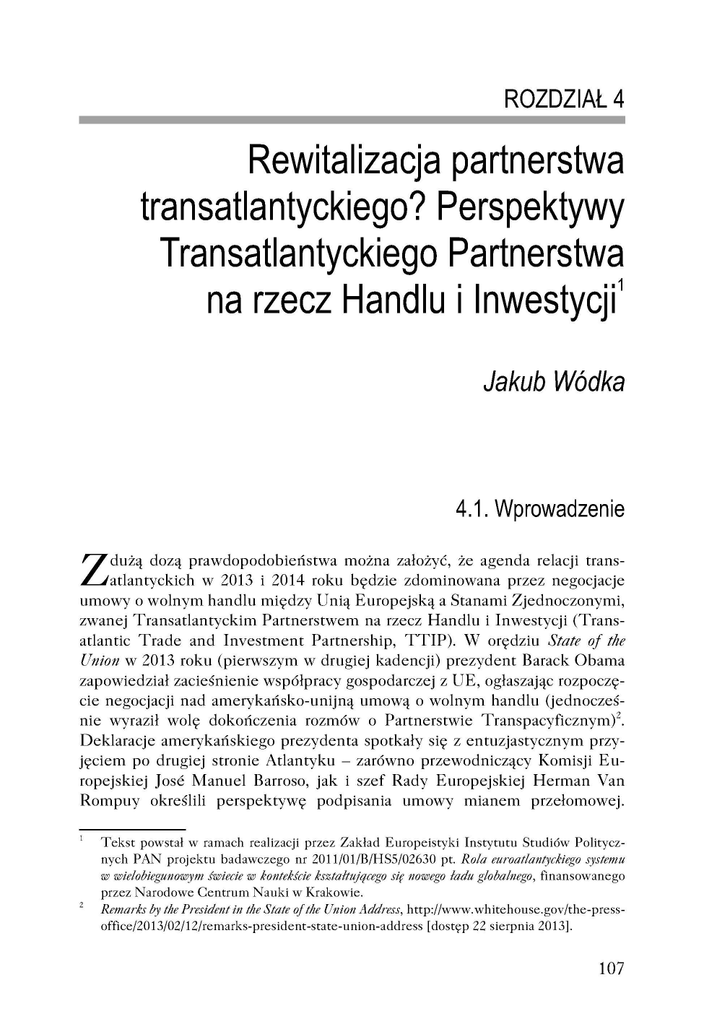 ROZDZIAŁ 4 Rewitalizacja partnerstwa transatlantyckiego? Perspektywy Transatlantyckiego Partnerstwa na rzecz Handlu i Inwestycji 1 Jakub Wódka 4.1. Wprowadzenie Z dużą dozą prawdopodobieństwa można założyć, że agenda relacji trans atlantyckich w 2013 i 2014 roku będzie zdominowana przez negocjacje umowy o wolnym handlu między Unią Europejską a Stanami Zjednoczonymi, zwanej Transatlantyckim Partnerstwem na rzecz Handlu i Inwestycji (Transatlantic Trade and Investment Partnership, T T I P ) . W orędziu State of the Union w 2013 roku (pierwszym w drugiej kadencji) prezydent Barack Obama zapowiedział zacieśnienie współpracy gospodarczej z UE, ogłaszając rozpoczę cie negocjacji nad amerykańsko-unijną umową o wolnym handlu (jednocześ¬ nie wyraził wolę dokończenia rozmów o Partnerstwie Transpacyficznym) . Deklaracje amerykańskiego prezydenta spotkały się z entuzjastycznym przy¬ jęciem po drugiej stronie Atlantyku - zarówno przewodniczący Komisji Eu ropejskiej Jose Manuel Barroso, jak i szef Rady Europejskiej Herman Van Rompuy określili perspektywę podpisania umowy mianem przełomowej. 2 1 2 Tekst powstał w ramach realizacji przez Zakład Europeistyki Instytutu Studiów Politycz nych P A N projektu badawczego nr 2011/01/B/HS5/02630 pt. Rola euroatlantyckiego systemu w wielobiegunowym świecie w kontekście kształtującego się nowego ładu globalnego, finansowanego przez Narodowe Centrum Nauki w Krakowie. Remarks by the President in the State of the Union Address, http://www.whitehouse.gov/the-pressoffice/2013/02/12/remarks-president-state-union-address [dostęp 22 sierpnia 2013]. 107 13 lutego 2013 roku, dzień po amerykańskim orędziu o stanie państwa, pre¬ zydent USA i unijni liderzy wydali wspólne oświadczenie, w którym wyrazili przekonanie, że umacnianie wzajemnych relacji gospodarczych przyczyni się do jeszcze większego dobrobytu po obu stronach Atlantyku . Zainicjowanie rozmów o strefie wolnego handlu między Unią Europejską a USA ma nie tylko wymiar gospodarczy i handlowy, ale, co równie istotne, także znaczenie geopolityczne; stwarza szansę na odbudowę i wzmocnienie fundamentów strategicznego sojuszu transatlantyckiego . Amerykanie bowiem w ostatnich latach zarzekali się, że nie chcą już być „globalnym żandarmem", deklarowali stopniowe „równoważenie" (rebalancing) swojego zaangażowa¬ nia międzynarodowego. Oznaczało to de facto ograniczenie zainteresowania Europą w ramach „zwrotu ku Azji" (pivot) - mot-cle amerykańskiej polityki ostatnich kilku lat . Zapowiadano między innymi redukcję amerykańskich sił stacjonujących w Europie. W tym kontekście pamiętna była wypowiedź sekretarza obrony Roberta Gatesa, który, odchodząc ze stanowiska, stwier¬ dził: „Przyszłe pokolenie przywódców Stanów Zjednoczonych, dla którego zimna wojna nie będzie tak kształtującym doświadczeniem życiowym jak dla mnie, może uznać, że korzyści z N A T O nie są warte kosztów ponoszonych przez USA". Dodatkowo nieufnie patrzono w Europie na amerykańskie pró¬ by ocieplania relacji z Rosją Putina. USA nie wsparły finansowo pogrążonej w kryzysie Europy. Generalnie, od wyboru na urząd prezydenta, dominowała „narracja", wedle której prezydent Obama nie interesuje się Europą, a kapitał polityczny chce inwestować głównie w Azji, szczególnie w Chinach. Dlatego też deklaracje Obamy w sprawie T T I P stanowią obiecującą zapowiedź rewita¬ lizacji „więdnącego" partnerstwa transatlantyckiego i jeśli zostaną zrealizowa¬ ne, mogą się znaleźć wśród najważniejszych sukcesów drugiej kadencji ame¬ rykańskiego prezydenta. O większej wadze przykładanej przez USA do relacji z Europą świadczy chociażby fakt, że nowy sekretarz stanu John Kerry pierw¬ szą wizytę zagraniczną złożył w Europie. Hillary Clinton zaś, rozpoczynając w 2009 roku urzędowanie, udała się najpierw do Azji, stając się następnie jed nym z ideologów amerykańskiego pivota. 3 4 5 Z kolei Unia Europejska, w dobie kryzysu, od kilku lat w coraz większym stopniu postrzegana jest jako organizacja „introwertyczna", „skupiająca się na T r e ś ć oświadczenia zob. Statement from United States President Barack Obama, European Council President Herman Van Rompuy and European Commission President Jose Manuel Barroso, 13 lutego 2013, http://europa.eu/rapid/press-release_MEMO-13-94_en.htm [dostęp 22 sierp¬ nia 2013]. Szerzej na temat relacji transatlantyckich zob. M . Larivć, Transatlantic Relations in the 21st Century: Europe, America and the Rise of the Rest, Routledge, New York 2012. Szerzej na temat amerykańskiego pivota: W. Ling, Rebalancing or de-Balancing: U.S. Pivot and EastAsian Order, „American Foreign Policy Interests" 2013, t. 35, nr 3, s. 148-154; R.S. Ross, The Problem with the Pivot, „Foreign Affairs" 2012, t. 91, nr 6, s. 70-82, S. Brimley, E. Ratner, SmartShift, „Foreign Affairs" 2013, t. 92, nr 1, s. 177-181. 108 sobie", na własnych problemach wewnętrznych, na krótkoterminowym zarzଠdzaniu kryzysem. Zarzuca się Unii (uosabianej zarówno przez instytucje bruk¬ selskie, jak i państwa członkowskie), że kiedy inne podmioty pozazachodnie w coraz większym stopniu współkształtują światową politykę, nie myśli ona w kategoriach strategicznych. Dlatego deklaracja o gotowości zawarcia Trans¬ atlantyckiego Partnerstwa na rzecz Handlu i Inwestycji jest doskonałą okazją dla Unii, aby odeszła od tej „kryzysowej" narracji i szukała rzeczywistych re¬ cept na wzrost gospodarczy. Co więcej, umowa o wolnym handlu z USA po¬ mogłaby wzmocnić legitymację Unii w takich państwach jak Wielka Brytania, Czechy czy Dania, skupiających się przede wszystkim na aspektach gospo¬ darczych członkostwa. Oczywiście, również z perspektywy U E T T I P byłoby strategiczną szansą na trwałą odbudowę partnerstwa transatlantyckiego . Warto podkreślić, że umowa o wolnym handlu po