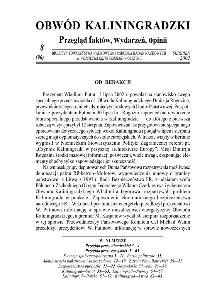 OBWÓD KALININGRADZKI 8 (96) Przegląd faktów, wydarzeń, opinii BIULETYN TOWARZYSTWA NAUKOWEGO i OŚRODKA BADAŃ NAUKOWYCH im. WOJCIECHA KĘTRZYŃSKIEGO w OLSZTNIE SIERPIEŃ 2002 OD REDAKCJI Prezydent Władimir Putin 13 lipca 2002 r. powołał na stanowisko swego specjalnego przedstawiciela ds. Obwodu Kaliningradzkiego Dmitrija Rogozina, przewodniczącego komitetu ds. międzynarodowych Dumy Państwowej. Po spotkaniu z prezydentem Putinem 30 lipca br. Rogozin zapowiedział utworzenie biura specjalnego przedstawiciela w Kaliningradzie — do którego z pierwszą roboczą wizytą przybył 12 sierpnia. Zapowiedział też przygotowanie specjalnego opracowania dotyczącego sytuacji wokół Kaliningradu i podjął w lipcu i sierpniu szereg misji dyplomatycznych do stolic europejskich. W trakcie wizyty w Berlinie wygłosił w Niemieckim Stowarzyszeniu Polityki Zagranicznej referat pt. „Czynnik Kaliningradu w przyszłej architekturze Europy”. Misji Dmitrija Rogozina środki masowej informacji poświęcają wiele uwagi, eksponując elementy choćby tylko zapowiadające jej skuteczność. Na wniosek grupy deputowanych Duma Państwowa rozpatrywała możliwość denonsacji paktu Ribbetrop–Mołotow, wypowiedzenia umowy o granicy państwowej z Litwą z 1997 r. Rada Bezpieczeństwa FR, z udziałem szefa Północno-Zachodniego Okręgu Federalnego Wiktora Czerkiesowa i gubernatora Obwodu Kaliningradzkiego Władimira Jegorowa, rozpatrywała problem Kaliningradu w punkcie „Zapewnienie ekonomicznego bezpieczeństwa narodowego FR”. W końcu lipca minister energetyki przedłożył prezydentowi W. Putinowi informację w sprawie niezależności energetycznej Obwodu Kaliningradzkiego, a premier M. Kasjanow wydał 30 sierpnia rozporządzenie w tej sprawie. Przewodniczący Państwowego Komitetu Ceł Michaił Wanin przedłożył prezydentowi W. Putinowi informację w sprawie nowoczesnych W NUMERZE Przegląd prasy niemieckiej 3—4. Przegląd prasy rosyjskiej 5—65: Sytuacja społeczna-polityczna 5—11, Partie polityczne 11, Administracja państwowa i samorządowa 12—19, Z życia Floty Bałtyckiej 19—21, Bezpieczeństwo publiczne 21—22 Gospodarka Obwodu 23—30, Kaliningrad—Świat 31—53, Kaliningrad—Niemcy 54—57, Kaliningrad—Polska 57—62, Kaliningrad—Litwa 62—65. 1 procedur celnych, które winny wesprzeć gospodarkę Kaliningradu. W końcu sierpnia D. Rogozin przedłożył prezydentowi W. Putinowi 50-stronicowe opracowanie grupy ekspertów zapowiadające możliwość zmiany stanowiska Rosji w rokowaniach z Unią Europejską. W tej sprawie także udzielił wywiadu „Prawdzie” Michaił Margiełow, przewodniczący komitetu ds. międzynarodowych Rady Federacji. Prezydent W. Putin zwołał 31 sierpnia naradę w sprawie Kaliningradu, w której uczestniczyli: premier Michaił Kasjanow, sekretarz Rady Bezpieczeństwa Władimir Ruszajło, minister spraw zagranicznych Igor Iwanow, minister obrony Siergiej Iwanow, minister spraw wewnętrznych Borys Gryzłow, dyrektor FSB Nikołaj Patruszew, zastępca szefa administracji prezydenta, naczelnik urzędu ds. polityki zagranicznej Siergiej Prichodźko i specjalny przedstawiciel Dimitrij Rogozin. Do Kaliningradu przybyła 7 września delegacja Rady Federacji, z przewodniczącym Siergiejem Mironowem, by odbyć swe posiedzenie i zapoznać się na miejscu z sytuacją wokół Kaliningradu. Był to także okres wielu wystąpień ministra Igora Iwanowa w związku ze stanowiskiem UE w sprawie Kaliningradu, raportem Komisji Europejskiej „o możliwościach elastycznego rozwiązania problemu tranzytu między Kaliningradem i całą Rosją”, konferencją państw bałtyckich w Rydze i zapowiedzią nieformalnego posiedzenia Rady Ministrów Spraw Zagranicznych Unii Europejskiej w tejże sprawie. Sytuacja wokół Kaliningradu była przedmiotem wielu opinii specjalistów wypowiadanych na łamach prasy: 1) Ksenii Kiryłłowej i Dmitrija Siergiejewa z Ośrodka Informacyjno-Analitycznego „Terytorium Ryzyka” (17 czerwiec), 2) Maksima A. Dianowa, dyrektora generalnego Instytutu Problemów Regionalnych (24 lipiec), 3) Leonida Smiriagina, członka Rady ds. Strategii Narodowej, docenta w katedrze geografii gospodarczej Moskiewskiego Uniwersytetu Państwowego (24 lipiec), 4) Aleksieja Makarkina, dyrektora departamentu analiz Ośrodka Technologii Politycznych (24 lipiec), 5) Andrieja Fiodorowa z Fundacji Studiów Politycznych i Doradztwa (29 lipiec), 6) Gleba Pawłowskiego z Fundacji Efektywnej Polityki (29 lipiec), 7) Walerija Fiodorowa z Ośrodka Koniunktury Politycznej (29 lipiec), 8) Siergieja Markowa z Instytutu Studiów Politycznych (29 lipiec), 9) Jurija Borko, kierownika Ośrodka Studiów Integracji Europejskiej w Instytucie Europy RAN (3 sierpnia), 10) Timofieja Bordaczewa z Moskiewskiego Ośrodka Carnegie (12 sierpień), 11) Pawła Kandela z Instytutu Europy RAN (28 sierpień), 12) Aleksieja Bogaturowa, eksperta ds. międzynarodowych (28 sierpień), 13) Nikołaja Kawiesznikowa z Instytutu Europy RAN (29 sierpień). Wizyty w Polsce Dmitrija Rogozina i Siergieja Mironowa, przewodniczącego Rady Federacji, zeszły na plan dalszy, podobnie jak spotkanie ministrów Marka Pola i Siergieja Franka w Kaliningradzie oraz wyniki posiedzenia PolskoRosyjskiej Komisji Międzyrządowej. 2 Przegląd prasy niemieckiej „Nowy próg dla „königsberskiego korytarza” Problem korytarza (tranzytowego) z Kaliningradu do Rosji skomplikował się po odmowie Aleksandra Łukaszenki zaakceptowania propozycji W. Putina „szybkiego zjednoczenia Rosji i Białorusi”. Das Ostpreusseblatt, 2002, nr 36 z 7 IX. „Bűsingen jako precedens?” Ziomkostwo Wschodniopruskie zdecydowało się na kontynuację swych działań jako organizacja pozarządowa w Parlamencie Europejskim. Przedstawicielowi Ziomkostwa zwrócono uwagę, że również Niemcy posiadają w regionie Schaffhausen gminę Bűsingen, która jest eksklawą znajdującą się poza granicami schengeńskimi. Bűsingen nad górny