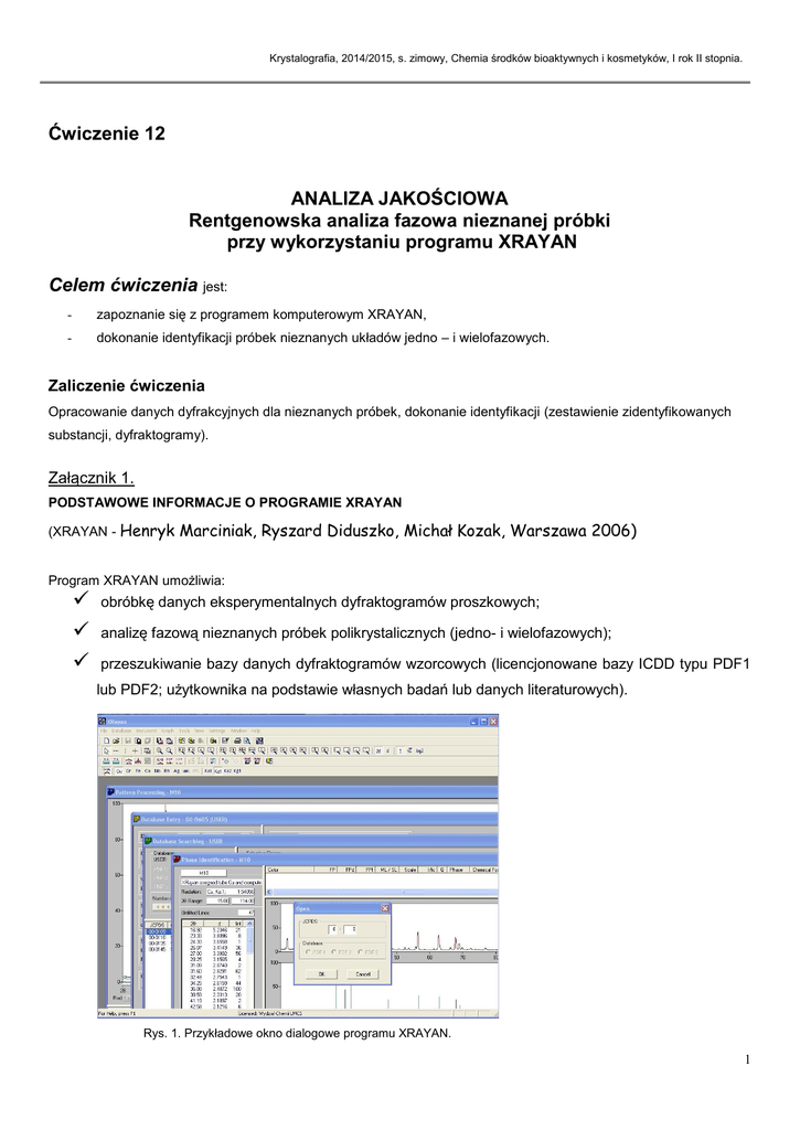 Krystalografia, 2014/2015, s. zimowy, Chemia środków bioaktywnych i kosmetyków, I rok II stopnia. Ćwiczenie 12 ANALIZA JAKOŚCIOWA Rentgenowska analiza fazowa nieznanej próbki przy wykorzystaniu programu XRAYAN Celem ćwiczenia jest: - zapoznanie się z programem komputerowym XRAYAN, - dokonanie identyfikacji próbek nieznanych układów jedno – i wielofazowych. Zaliczenie ćwiczenia Opracowanie danych dyfrakcyjnych dla nieznanych próbek, dokonanie identyfikacji (zestawienie zidentyfikowanych substancji, dyfraktogramy). Załącznik 1. PODSTAWOWE INFORMACJE O PROGRAMIE XRAYAN (XRAYAN - Henryk Marciniak, Ryszard Diduszko, Michał Kozak, Warszawa 2006) Program XRAYAN umożliwia: obróbkę danych eksperymentalnych dyfraktogramów proszkowych; analizę fazową nieznanych próbek polikrystalicznych (jedno- i wielofazowych); przeszukiwanie bazy danych dyfraktogramów wzorcowych (licencjonowane bazy ICDD typu PDF1 lub PDF2; użytkownika na podstawie własnych badań lub danych literaturowych). Rys. 1. Przykładowe okno dialogowe programu XRAYAN. 1 Krystalografia, 2014/2015, s. zimowy, Chemia środków bioaktywnych i kosmetyków, I rok II stopnia. Program udostępnia 4 paski narzędzi, które mogą być włączane niezależnie. Są to: Main Toolbar – podst. pasek narzędzi powiązany z funkcjami menu File, Database i Document. Tools Toolbar – pasek narzędzi funkcyjnych programu dostępnych również poprzez menu Tools. Graph Toolbar – pasek narzędzi zawierający przyciski do obsługi i nawigacji po rysunku/wykresie. Tube Toolbar – pasek narzędzi do wyboru typu lampy i linii charakterystycznej promieniowania. Tryby pracy programu Program pracuje w dwóch podstawowych trybach. Są to: Pattern Treatment – PT – udostępnia wszystkie funkcje związane z obróbką dyfraktogramów. Phase Analysis – PA – udostępnia wszystkie funkcje związane z analizą fazową. Dodatkowo program pozwala również na przeszukiwanie bazy danych (Database Search - DS) jak i prezentację danych zawartych w bazie (Database Entry – DE) Pattern Treatment - PT Przejście do trybu pracy obróbki dyfraktogramów Pattern Treatment (PT) odbywa się automatycznie poprzez wczytanie pliku danych doświadczalnych poleceniem File→Open, Funkcje PT Funkcja Smoothing (F5) – umożliwia wygładzanie dyfraktogramu. Odbywa się przez procedurę uśredniania punktów krzywej doświadczalnej z określoną wagą, w danym przedziale uśredniania określanym jako smoothing factor. Smoothing factor jest wybierany po uruchomieniu tej funkcji w przedziale 1 - 9. Czynnik ten odpowiada przedziałowi uśredniania. Im większa wartość czynnika, tym większe wygładzanie. Wygładzony dyfraktogram jest zapisywany w pamięci jako nowy dokument i wyświetlany na ekranie. Dokument ten otrzymuje tę samą nazwę, co dokument (plik) danych doświadczalnych, z rozszerzeniem SM$ i może być zapisany na dysku (File→Save). Funkcja K2 Stripping (F6) – umożliwia usunięcie z profilu dyfraktogramu składowej związanej z linią K2 promieniowania charakterystycznego lampy rentgenowskiej. Oczyszczony dyfraktogram jest zapisywany w pamięci jako nowy dokument i wyświetlany na ekranie. Dokument ten otrzymuje tę samą nazwę, co dokument (plik) danych doświadczalnych, z rozszerzeniem A1$ i może być zapisany na dysku (File→Save ). Uwaga! Procedura ta może być uruchomiona tylko wówczas, gdy standardową długością fali danych wejściowych jest K0 (uśredniona długość fali dubletu K). Po zakończeniu działania tej procedury wartość ta zmienia się na K1. Można ją zmienić za pomocą ikon w pasku typu fali Rtg (Tube Toolbar). 2 Krystalografia, 2014/2015, s. zimowy, Chemia środków bioaktywnych i kosmetyków, I rok II stopnia. Funkcja Peak Finding (F7) – umożliwia znajdowanie położeń refleksów (maksimów) na analizowanym dyfraktogramie. Parameters→Pattern Treatment→Peaks’ Searching są eliminowane. Wyznaczone w powyższy sposób położenia i intensywności linii dyfrakcyjnych są przechowywane w nowym dokumencie typu DSP, który jest wyświetlany na rysunku pionowymi liniami o wysokości odpowiedniej do intensywności linii. Liczba linii zależy od profilu dyfraktogramu, lecz również od przyjętych parametrów: czynnika wygładzania drugiej pochodnej i progu odcięcia słabych linii. Można edytować uzyskany obraz położeń linii dyfrakcyjnych za pomocą przycisków . Edycja jest przeprowadzana na aktywnym (podświetlonym) dokumencie typu DSP. Przycisk Delete Peaks Below (Alt+D) – powoduje usuwanie refleksów, poniżej poziomu natężeń wyznaczonego przez ślad poziomy kursora. Refleksy, które będą usunięte przy aktualnej pozycji kursora są zaznaczone na czerwono. Akceptacja usunięcia następuje po naciśnięciu lewego przycisku myszy Przycisk Delete One Peak (Del) – powoduje usuwanie pojedynczych refleksów. Należy kursorem pionowym najechać na pozycję usuwanego refleksu (podświetli się wtedy na czerwono) i nacisnąć lewy przycisk myszy. Przycisk Insert (Ins) – powoduje wstawianie pojedynczych refleksów. Należy kursorem pionowym ustalić położenie kątowe wprowadzanego refleksu, kursorem poziomym jego natężenie (określa je ciągła linia, poniżej pozycji kursora) i nacisnąć lewy przycisk myszy. Po zakończeniu analizy linii dyfrakcyjnych i uznaniu, że położenia linii zostały wyznaczone właściwie należy je zapisać w pliku typu DSP na dysku poleceniem Save (Ctr+S). Program udostępnia dwie procedury analizy fazowej: analizę standardowa (S.A.) i analizę śladową (T.A.) Uruchomienie konkretnej analizy dokonuje się przyciskami 3 Krystalografia, 2014/2015, s. zimowy, Chemia środków bioaktywnych i kosmetyków, I rok II stopnia. Analiza standardowa (Standard Analysis) Standardowa analiza fazowa jest to procedura znajdowania wzorców faz dopasowanych do listy położeń pików wyznaczonych z doświadczalnego dyfraktogramu. Po wybraniu tej funkcji pokazuje się okno