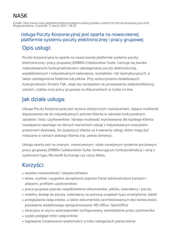 NASK Źródło: http://www.nask.pl/pl/oferta/oferta-telekomunikacyjn/data-center/141,Poczta-Korporacyjna.html Wygenerowano: Czwartek, 2 marca 2017, 09:35 Usługa Poczty Korporacyjnej jest oparta na nowoczesnej platformie systemu poczty elektronicznej i pracy grupowej Opis usługi: Poczta Korporacyjna to oparte na nowoczesnej platformie systemu poczty elektronicznej i pracy grupowej ZIMBRA Collaboration Suite. Cechuje się bardzo rozbudowanymi funkcjonalnościami udostępniania poczty elektronicznej, współdzielonych i indywidualnych kalendarzy, kontaktów i list dystrybucyjnych, a także udostępniania folderów lub plików. Przy wykorzystaniu dodatkowych funkcjonalności Zimbra Talk, staje się narzędziem do prowadzenia wideokonferencji, szkoleń, czatów oraz pracy grupowej na dokumentach w trybie on-line. Jak działa usługa: Usługa Poczty Korporacyjnej jest wysoce elastycznym rozwiązaniem, dająca możliwość dopasowania się do indywidualnych potrzeb Klienta w zakresie funkcjonalnym, zasobów i ilości użytkowników. Istnieje możliwość wykreowania dla każdego Klienta rozwiązania opartego na różnych wariantach usługi z indywidulanym koszykiem przestrzeni dyskowej. Do dyspozycji klienta są 4 warianty usługi, które mogą być mieszane w ramach jednego Klienta (np. jednej domeny). Usługa oparta jest na znanym, nowoczesnym i stale rozwijanym systemie pocztowym pracy grupowej ZIMBRA Collaboration Suite, konkurującym funkcjonalnością i ceną z systemami typu Microsoft Exchange czy Lotus Notes. Korzyści: ● wysoka niezawodność i bezpieczeństwo ● łatwe, szybkie i wygodne zarządzanie poprzez Panel Administratora kontami i aliasami, profilami użytkowników ● praca grupowa poprzez współdzielenie dokumentów, plików, kalendarzy i poczty ● mobilny dostęp do poczty, kalendarzy za pomocą urządzeń typu smartphone, tablet ● przeglądanie załączników, a także dokumentów zarchiwizowanych bez konieczności posiadania dodatkowego oprogramowania: MS Office, OpenOffice ● intuicyjny w użyciu autoresponder konfigurowany samodzielnie przez użytkownika ● szybki podgląd treści załączników ● tagowanie (znakowanie wiadomości) w kilku kategoriach jednocześnie ● zaawansowana wyszukiwarka pozwalająca na szybkie i dokładne wyfiltrowanie poszukiwanych treści ● wybór przez użytkownika terminu wysłania korespondencji, sposobu prezentacji ● łatwe tworzenie list dystrybucyjnych ● narzędzie do zarządzania zadaniami ● czytelne zasady przechowywania i odzyskiwania skasowanej uprzednio korespondencji ● możliwość korzystania z różnego typu Klientów pocztowych m.in. Klienta Webowego, dedykowanego Klienta pocztowego Zimbra Desktop a także możliwość skorzystania z programów Microsoft Outlook lub Apple ● możliwość integracji z ActiveDirectory czy LDAP jako centralne zarządzanie tożsamością ● możliwość szyfrowania poczty za pomocą systemu Kluczy publicznych/prywatnych ● w ramach dodatkowego systemu Zimbra Talk – dostęp do: ❍ wideokonferencji ❍ czata ❍ współdzielenie „okien” np. pokaz prezentacji ❍ praca on-line na dokumentach typu Word