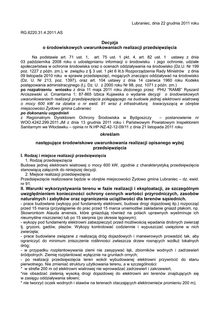 Lubraniec, dnia 22 grudnia 2011 roku RG.6220.31.4.2011.AS Decyzja o środowiskowych uwarunkowaniach realizacji przedsięwzięcia Na podstawie art. 71 ust. 1, art. 75 ust. 1 pkt. 4, art. 82 ust. 1 ustawy z dnia 03 października 2008 roku o udostępnianiu informacji o środowisku i jego ochronie, udziale społeczeństwa w ochronie środowiska oraz o ocenach oddziaływania na środowisko (Dz.U. Nr 199 poz. 1227 z późn. zm.), w związku z § 3 ust. 1 pkt 6 lit.b Rozporządzenia Rady Ministrów z dnia 09 listopada 2010 roku w sprawie przedsięwzięć, mogących znacząco oddziaływać na środowisko (Dz. U. Nr 213, poz. 1397), oraz art. 104 ustawy z dnia 14 czerwca 1960 roku Kodeks postępowania administracyjnego (t.j. Dz. U. z 2000 roku Nr 98, poz. 1071 z późn. zm.) po rozpatrzeniu wniosku z dnia 11 maja 2011 roku złożonego przez PHU “RAMB” Ryszard Arciszewski ul. Cmantarna 1; 87-865 Izbica Kujawska o wydanie decyzji o środowiskowych uwarunkowaniach realizacji przedsięwzięcia polegającego na budowie jednej elektrowni wiatrowej o mocy 600 kW na działce o nr ewid. 91 wraz z infrastrukturą towarzyszącą w obrębie miejscowości Żydowo gmina Lubraniec po dokonaniu uzgodnień z Regionalnym Dyrektorem Ochrony Środowiska w Bydgoszczy – postanowienie nr WOO.4242.299.2011.JM z dnia 13 grudnia 2011 roku i Państwowym Powiatowym Inspektorem Sanitarnym we Włocławku – opinia nr N.HP-NZ-42-12-09/11 z dnia 21 listopada 2011 roku określam następujące środowiskowe uwarunkowania realizacji opisanego wyżej przedsięwzięcia I. Rodzaj i miejsce realizacji przedsięwzięcia 1. Rodzaj przedsięwzięcia Budowa jednej elektrowni wiatrowej o mocy 600 kW, zgodnie z charakterystyką przedsięwzięcia stanowiącą załącznik do niniejszej decyzji. 2. Miejsce realizacji przedsięwzięcia Przedsięwzięcie realizowane będzie w obrębie miejscowości Żydowo gmina Lubraniec – dz. ewid. nr 91. II. Warunki wykorzystywania terenu w fazie realizacji i eksploatacji, ze szczególnym uwzględnieniem konieczności ochrony cennych wartości przyrodniczych, zasobów naturalnych i zabytków oraz ograniczenia uciążliwości dla terenów sąsiednich. - prace budowlane (wykopy pod fundamenty elektrowni, budowa drogi dojazdowej itp.) rozpocząć przed 15 marca (przystąpienie do prac przed 15 marca uniemożliwi zakładanie gniazd ptakom, np. Skowronkom Alauda arvensis, które gniazdują również na polach uprawnych wyeliminuje ich nieumyślne niszczenie) lub po 15 sierpnia (po okresie lęgowym); - wykopy pod fundamenty elektrowni zabezpieczyć przed możliwością wpadania drobnych zwierząt tj. gryzoni, gadów, płazów. Wykopy kontrolować codziennie i wypuszczać uwięzione w nich zwierzęta; - prace budowlane związane z realizacją dróg dojazdowych i manewrowych prowadzić tak, aby ograniczyć do minimum zniszczenie roślinności zwłaszcza drzew rosnących wzdłuż lokalnych dróg; - w przypadku rozplantowywania ziemi nie zasypywać łąk, zbiorników wodnych i zadrzewień śródpolnych. Ziemię rozplantować wyłącznie na gruntach ornych; - po realizacji przedsięwzięcia teren wokół wybudowanej elektrowni przywrócić do stanu pierwotnego. Nie zmieniać struktury użytkowania terenu, a w szczególności: * w strefie 200 m od elektrowni wiatrowej nie wprowadzać zadrzewień i zakrzewień; *nie obsadzać zielenią wysoką drogi dojazdowej do elektrowni ani terenów znajdujących się w zasięgu oddziaływania siłowni; * nie tworzyć oczek wodnych i stawów na terenach otaczających elektrownie(w promieniu 200 m); - na bieżąco wykaszać roślinność zieloną rosnącą wzdłuż drogi technologicznej, na placu manewrowym oraz bezpośrednio pod elektrownią wiatrową(d0 50 m od wieży), w celu zminimalizowania przyciągania przez analizowany teren owadów, które stanowić mogą bazę pokarmową ptaków i nietoperzy; - na etapie budowy I eksploatacji wszelkie prace organizować w taki sposób, aby powodować jak najmniejszą uciążliwość dla klimatu akustycznego tj.: * zaplanować odpowiedni dobór maszyn budowlanych (emitujących możliwie niski poziom hałasu), * stosować sprzęt w dobrym stanie technicznym zgodnie z wymaganiami określonymi w Rozporządzeniu Ministra Gospodarki z dnia 21 grudnia 2005 roku w sprawie zasadniczych wymagań dla urządzeń używanych na zewnątrz pomieszczeń w zakresie emisji hałasu do środowiska (Dz.U. z 2005 r. Nr 263, poz. 2202), * przestrzegać zasady wyłączania silników w czasie przerw w pracy, * maksymalnie ograniczyć czas budowy poszczególnych etapów poprzez odpowiednie zaplanowanie procesu budowlanego,, * ograniczyć liczbę przejazdów ciężkiego sprzętu w rejonach szczególnie wrażliwych, a przede wszystkim nie dopuszczać do prowadzenia prac realizacyjnych w porze nocy w rejonie zabudowy mieszkaniowej, * dokonywać systematycznej kontroli siłowni pod kątem wzrostu hałasu, a w razie przekroczeń przeprowadzać naprawy oraz dodatkowe adaptacje akustyczne, III. Wymagania dotyczące ochrony środowiska konieczne do uwzględnienia w dokumentacji wymaganej do wydania decyzji, o których mowa w art. 72 ust. 1, w szczególności w projekcie budowlanym, w przypadku decyzji, o których mowa w art. 72 ust. 1 pkt 1, 10, 14 i 18, zaprojektować turbinę wyposażona w system uszczelnień oleju, zabezpieczający wody powierzchniowe i podziemne przed ewentualnym wyciekiem tych substancji do gruntu; zastosować nocne oznaczenie elektrowni w postaci migającego światła koloru czerwonego na szczycie gondoli. Nie stosować światła białego do oświetlenia elektrowni; elektrownię pomalować matowymi farbami w celu eliminacji powstawania refleksów świetlnych; zastosować dzienne oznaczenia przeszkodowe elektrowni, tj. pomalować końcówki łopat śmigieł na kolor czerwony oraz wyposażyć turbinę w obrysowe światła pulsacyjne w kolorze czerwonym; - zastosować turbinę wiatrową o równoważnym maksymalnym poziomie mocy akustycznej 101 dB. 