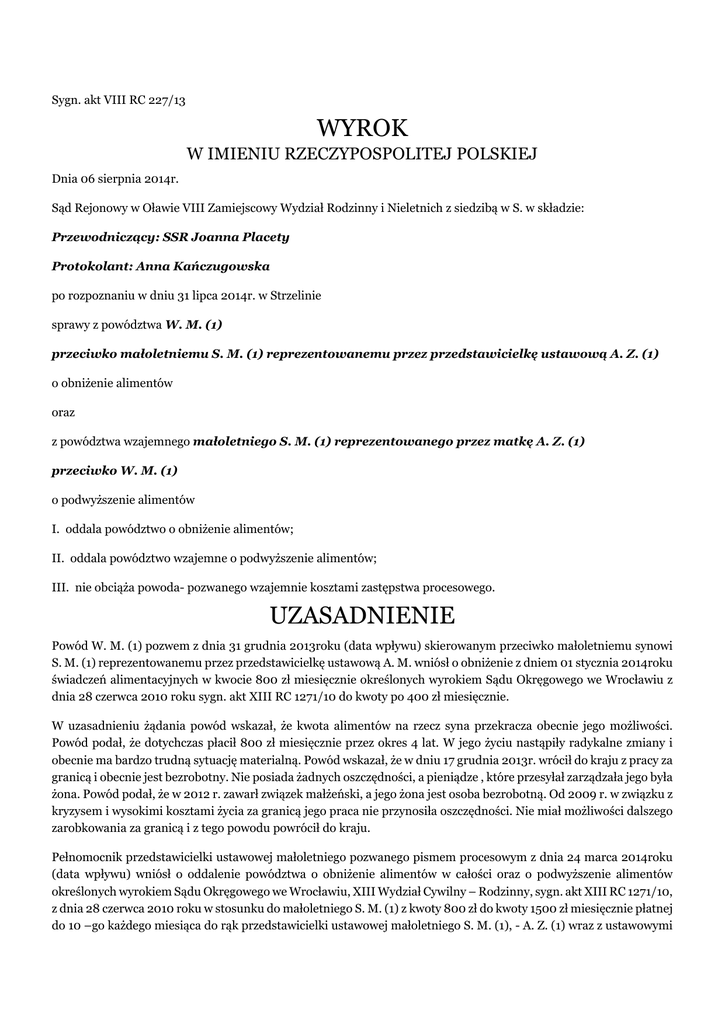 Sygn. akt VIII RC 227/13 WYROK W IMIENIU RZECZYPOSPOLITEJ POLSKIEJ Dnia 06 sierpnia 2014r. Sąd Rejonowy w Oławie VIII Zamiejscowy Wydział Rodzinny i Nieletnich z siedzibą w S. w składzie: Przewodniczący: SSR Joanna Placety Protokolant: Anna Kańczugowska po rozpoznaniu w dniu 31 lipca 2014r. w Strzelinie sprawy z powództwa W. M. (1) przeciwko małoletniemu S. M. (1) reprezentowanemu przez przedstawicielkę ustawową A. Z. (1) o obniżenie alimentów oraz z powództwa wzajemnego małoletniego S. M. (1) reprezentowanego przez matkę A. Z. (1) przeciwko W. M. (1) o podwyższenie alimentów I. oddala powództwo o obniżenie alimentów; II. oddala powództwo wzajemne o podwyższenie alimentów; III. nie obciąża powoda- pozwanego wzajemnie kosztami zastępstwa procesowego. UZASADNIENIE Powód W. M. (1) pozwem z dnia 31 grudnia 2013roku (data wpływu) skierowanym przeciwko małoletniemu synowi S. M. (1) reprezentowanemu przez przedstawicielkę ustawową A. M. wniósł o obniżenie z dniem 01 stycznia 2014roku świadczeń alimentacyjnych w kwocie 800 zł miesięcznie określonych wyrokiem Sądu Okręgowego we Wrocławiu z dnia 28 czerwca 2010 roku sygn. akt XIII RC 1271/10 do kwoty po 400 zł miesięcznie. W uzasadnieniu żądania powód wskazał, że kwota alimentów na rzecz syna przekracza obecnie jego możliwości. Powód podał, że dotychczas płacił 800 zł miesięcznie przez okres 4 lat. W jego życiu nastąpiły radykalne zmiany i obecnie ma bardzo trudną sytuację materialną. Powód wskazał, że w dniu 17 grudnia 2013r. wrócił do kraju z pracy za granicą i obecnie jest bezrobotny. Nie posiada żadnych oszczędności, a pieniądze , które przesyłał zarządzała jego była żona. Powód podał, że w 2012 r. zawarł związek małżeński, a jego żona jest osoba bezrobotną. Od 2009 r. w związku z kryzysem i wysokimi kosztami życia za granicą jego praca nie przynosiła oszczędności. Nie miał możliwości dalszego zarobkowania za granicą i z tego powodu powrócił do kraju. Pełnomocnik przedstawicielki ustawowej małoletniego pozwanego pismem procesowym z dnia 24 marca 2014roku (data wpływu) wniósł o oddalenie powództwa o obniżenie alimentów w całości oraz o podwyższenie alimentów określonych wyrokiem Sądu Okręgowego we Wrocławiu, XIII Wydział Cywilny – Rodzinny, sygn. akt XIII RC 1271/10, z dnia 28 czerwca 2010 roku w stosunku do małoletniego S. M. (1) z kwoty 800 zł do kwoty 1500 zł miesięcznie płatnej do 10 –go każdego miesiąca do rąk przedstawicielki ustawowej małoletniego S. M. (1), - A. Z. (1) wraz z ustawowymi odsetkami w razie zwłoki w płatności którejkolwiek z rat miesięcznych począwszy od daty wytoczenia powództwa wzajemnego. W uzasadnieniu pełnomocnik przedstawicielki ustawowej małoletniego pozwanego –powoda wzajemnego wskazał, że przedstawicielka ustawowa małoletniego pozwanego –powoda wzajemnego po orzeczeniu rozwodu powróciła do nazwiska panieńskiego a to nazwiska (...). Pełnomocnik przedstawicielki ustawowej małoletniego pozwanego – powoda wzajemnego podniósł, że w związku z istotną zmianą stosunków w zakresie kosztów utrzymania małoletniego od ostatniego orzeczenia w przedmiocie orzeczenia o wysokości zobowiązania alimentacyjnego małoletniego, powódka w odpowiedzi na pozew wnosi powództwo wzajemne o podwyższenie alimentów określonych wyrokiem Sądu Okręgowego we Wrocławiu, Wydział XIII Cywilny Rodzinny, sygn. akt XIII RC 1271/10, z dnia 28 czerwca 2010 roku w stosunku do małoletniego S. M. (1) z kwoty 800 zł do kwoty 1500 zł miesięcznie. Pełnomocnik przedstawicielki ustawowej małoletniego pozwanego –powoda wzajemnego wskazał, że przedstawicielka ustawowa małoletniego S. M. (1) w chwili obecnej zatrudniona jest na umowę o pracę w (...) sp. z o.o. z wynagrodzeniem miesięcznym w wysokości 1746,83 zł brutto (netto 1288,66 zł). Od czasu wydania orzeczenia w zakresie alimentów koszty utrzymania małoletniego pozwanego –powoda wzajemnego znacznie wzrosły co uzasadnia żądanie powództwa. Koszty wyżywienia małoletniego obecnie kształtują się na poziomie ok 600 zł tj. ok 20 zł dziennie. W dacie ostatniego orzekania owe koszty kształtowały się na poziomie ok 500 zł miesięcznie. Małoletni obecnie wymaga specjalnej diety żywieniowej, której wcześniej nie wymagał, przy czym fakt ten wiąże się z wizytami u dietetyka, gdzie koszt jednej wizyty wynosi 120 zł miesięcznie. Ponadto, na koszt utrzymania małoletniego składa się udział w kosztach utrzymania mieszkania, który na jedną osobę miesięcznie wynosi 383 zł. Koszt zakupu odzieży i obuwia dla małoletniego przedstawicielka ustawowa szacuje miesięcznie na kwotę ok 215 zł. Do kosztów utrzymania małoletniego należy także doliczyć, koszt zakupu środków czystości oraz higieny osobistej w wysokości 100 zł miesięcznie, koszty leczenia – ok 400 zł rocznie. Pełnomocnik przedstawicielki ustawowej małoletniego S. M. (1) ponadto podniósł, iż małoletni pozwany-powód raz w tygodniu uczęszcza na korepetycje z języka angielskiego gdzie koszt jednej korepetycji wynosi 40 zł, łącznie korepetycje miesięcznie wynoszą 160 zł. Na zakup wyprawki szkolnej do V klasy matka małoletniego przeznaczyła kwotę ok 840 zł. Na kwotę ta składa się zakup plecaka -140 zł, podręczników -500 zł, strój na w-f wraz z obuwiem 200 zł oraz przedmioty biurowe -200 zł. Matka małoletniego pozwanego – powoda poniosła także koszty związane z ubezpieczeniem syna w szkole -50 zł, koszt zielonej szkoły -270 zł oraz koszty wycieczek kasowych – ok 37 zł wycieczka, koszty dojazdów do szkoły – 33 zł miesięcznie. Matka małoletniego pozwanego-powoda wzajemnego ponosi także koszty wyjazdów wakacyjnych oraz w trakcie ferii zimowych syna. Wraz z synem spędziła 2 tygodnie w Ł., gdzie koszt pobytu wynosił ok 1850 zł od osoby. W trakcie ferii zimowych matka małoletniego wyjeżdż