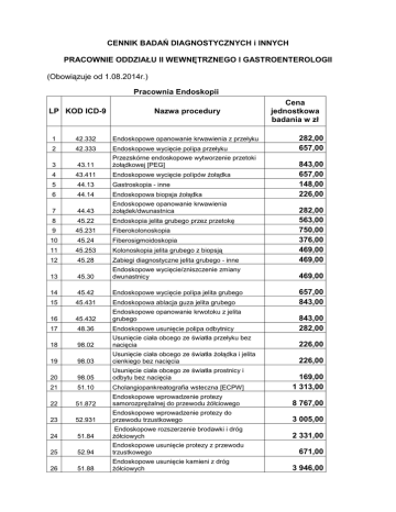 CENNIK BADAŃ DIAGNOSTYCZNYCH i INNYCH PRACOWNIE ODDZIAŁU II WEWNĘTRZNEGO I GASTROENTEROLOGII (Obowiązuje od 1.08.2014r.) Pracownia Endoskopii LP KOD ICD-9 Nazwa procedury Endoskopowe opanowanie krwawienia z przełyku Cena jednostkowa badania w zł 282,00 657,00 1 42.332 2 42.333 Endoskopowe wycięcie polipa przełyku 3 43.11 Przezskórne endoskopowe wytworzenie przetoki żołądkowej [PEG] 4 43.411 Endoskopowe wycięcie polipów żołądka 5 44.13 Gastroskopia - inne 6 44.14 Endoskopowa biopsja żołądka 7 44.43 Endoskopowe opanowanie krwawienia żołądek/dwunastnica 8 45.22 Endoskopia jelita grubego przez przetokę 9 45.231 Fiberokolonoskopia 10 45.24 Fiberosigmoidoskopia 11 45.253 Kolonoskopia jelita grubego z biopsją 12 45.28 Zabiegi diagnostyczne jelita grubego - inne 282,00 563,00 750,00 376,00 469,00 469,00 13 45.30 Endoskopowe wycięcie/zniszczenie zmiany dwunastnicy 469,00 14 45.42 Endoskopowe wycięcie polipa jelita grubego 15 45.431 Endoskopowa ablacja guza jelita grubego 16 45.432 Endoskopowe opanowanie krwotoku z jelita grubego 17 48.36 Endoskopowe usunięcie polipa odbytnicy 843,00 282,00 18 98.02 Usunięcie ciała obcego ze światła przełyku bez nacięcia 226,00 19 98.03 Usunięcie ciała obcego ze światła żołądka i jelita cienkiego bez nacięcia 226,00 20 98.05 Usunięcie ciała obcego ze światła prostnicy i odbytu bez nacięcia 21 51.10 Cholangiopankreatografia wsteczna [ECPW] 169,00 1 313,00 22 51.872 Endoskopowe wprowadzenie protezy samorozprężalnej do przewodu żółciowego 8 767,00 23 52.931 Endoskopowe wprowadzenie protezy do przewodu trzustkowego 3 005,00 24 51.84 Endoskopowe rozszerzenie brodawki i dróg żółciowych 2 331,00 25 52.94 Endoskopowe usunięcie protezy z przewodu trzustkowego 671,00 26 51.88 Endoskopowe usunięcie kamieni z dróg żółciowych 843,00 657,00 148,00 226,00 657,00 843,00 3 946,00 671,00 27 51.95 Usunięcie protezy przewodu żółciowego 28 51.85 Endoskopowe nacięcie zwieracza i brodawki 2 289,00 29 51.871 Endoskopowe wprowadzenie protezy do przewodu żółciowego 3 005,00 30 52.98 Endoskopowe rozszerzenie przewodu trzustkowego 2 331,00 ceny nie zawierają kosztów badania histopatologicznego oraz znieczulenia do badania bez wskazań medycznych
