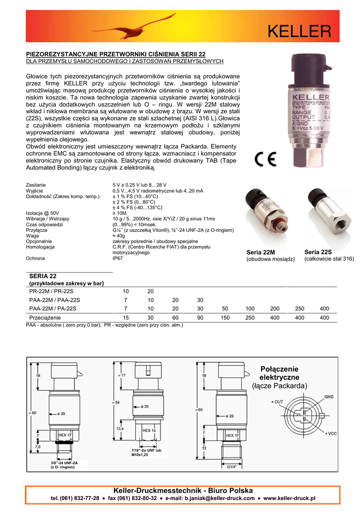 PIEZOREZYSTANCYJNE PRZETWORNIKI CIŚNIENIA SERII 22 DLA PRZEMYSŁU SAMOCHODOWEGO I ZASTOSOWAŃ PRZEMYSŁOWYCH Głowice tych piezorezystancyjnych przetworników ciśnienia są produkowane przez firmę KELLER przy użyciu technologii tzw. „twardego lutowania” umożliwiając masową produkcję przetworników ciśnienia o wysokiej jakości i niskim koszcie. Ta nowa technologia zapewnia uzyskanie zwartej konstrukcji bez użycia dodatkowych uszczelnień lub O – ringu. W wersji 22M stalowy wkład i niklowa membrana są wlutowane w obudowę z brązu. W wersji ze stali (22S), wszystkie części są wykonane ze stali szlachetnej (AISI 316 L).Głowica z czujnikiem ciśnienia montowanym na krzemowym podłożu i szklanymi wyprowadzeniami wlutowana jest wewnątrz stalowej obudowy, poniżej wypełnienia olejowego. Obwód elektroniczny jest umieszczony wewnątrz łącza Packarda. Elementy ochronne EMC są zamontowane od strony łącza, wzmacniacz i kompensator elektroniczny po stronie czujnika. Elastyczny obwód drukowany TAB (Tape Automated Bonding) łączy czujnik z elektroniką. Zasilanie Wyjście Dokładność (Zakres komp. temp.) Izolacja @ 50V Wibracje / Wstrząsy Czas odpowiedzi Przyłącza Waga Opcjonalnie Homologacja Ochrona 5 V ± 0,25 V lub 8…28 V 0,5 V...4,5 V radiometryczne lub 4..20 mA ± 1 % FS (10...40°C) ± 2 % FS (0...80°C) ± 4 % FS (-40...135°C) ≥ 10M 10 g / 5...2000Hz, osie X/Y/Z / 20 g sinus 11ms (0...99%) < 10msek. G¼’’ (z uszczelką Viton®), ⅜’’-24 UNF-2A (z O-ringiem) ≈ 40g zakresy pośrednie / obudowy specjalne C.R.F. (Centro Ricerche FIAT) dla przemysłu motoryzacyjnego IP67 Seria 22M Seria 22S (obudowa mosiądz) (całkowicie stal 316) SERIA 22 (przykładowe zakresy w bar) PR-22M / PR-22S 10 20 PAA-22M / PAA-22S 7 10 20 30 PAA-22M / PA-22S 7 10 20 30 50 100 200 250 400 Przeciążenie 15 30 60 90 150 250 400 400 400 PAA - absolutne ( zero przy 0 bar); PR - względne (zero przy ciśn. atm.) Połączenie elektryczne (łącze Packarda) 7/16”-2o UNF lub M10x1,25 3/8”-24 UNF-2A (z O- ringiem) Keller-Druckmesstechnik - Biuro Polska tel. (061) 832-77-28 • fax (061) 832-80-32 • e-mail: [email protected] • www.keller-druck.pl