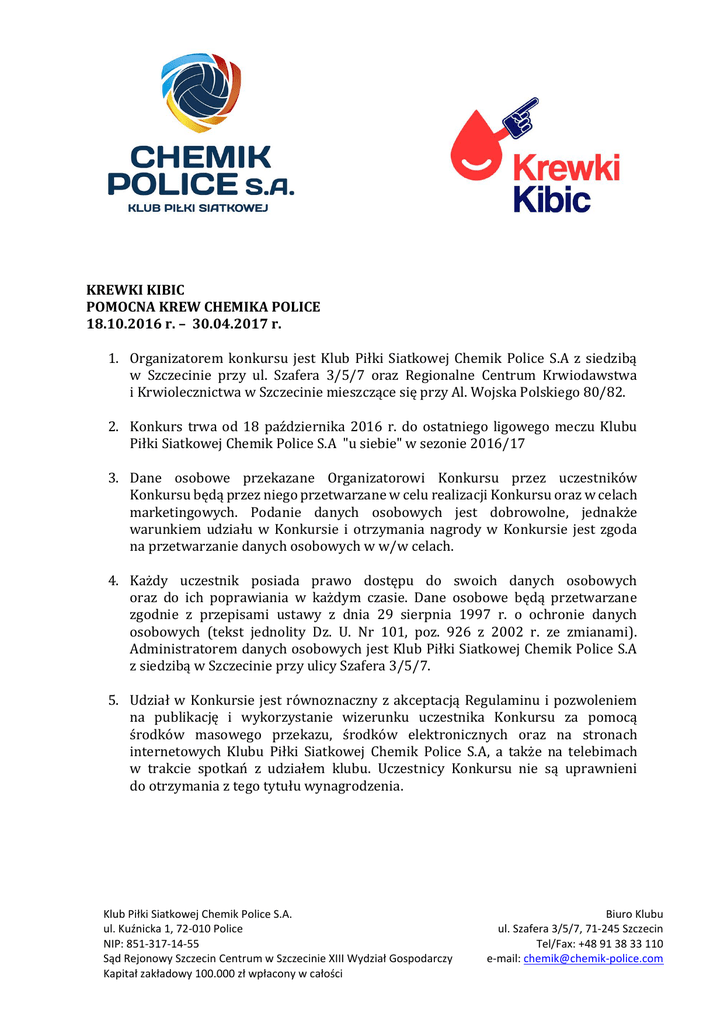 KREWKI KIBIC POMOCNA KREW CHEMIKA POLICE 18.10.2016 r. – 30.04.2017 r. 1. Organizatorem konkursu jest Klub Piłki Siatkowej Chemik Police S.A z siedzibą w Szczecinie przy ul. Szafera 3/5/7 oraz Regionalne Centrum Krwiodawstwa i Krwiolecznictwa w Szczecinie mieszczące się przy Al. Wojska Polskiego 80/82. 2. Konkurs trwa od 18 października 2016 r. do ostatniego ligowego meczu Klubu Piłki Siatkowej Chemik Police S.A "u siebie" w sezonie 2016/17 3. Dane osobowe przekazane Organizatorowi Konkursu przez uczestników Konkursu będą przez niego przetwarzane w celu realizacji Konkursu oraz w celach marketingowych. Podanie danych osobowych jest dobrowolne, jednakże warunkiem udziału w Konkursie i otrzymania nagrody w Konkursie jest zgoda na przetwarzanie danych osobowych w w/w celach. 4. Każdy uczestnik posiada prawo dostępu do swoich danych osobowych oraz do ich poprawiania w każdym czasie. Dane osobowe będą przetwarzane zgodnie z przepisami ustawy z dnia 29 sierpnia 1997 r. o ochronie danych osobowych (tekst jednolity Dz. U. Nr 101, poz. 926 z 2002 r. ze zmianami). Administratorem danych osobowych jest Klub Piłki Siatkowej Chemik Police S.A z siedzibą w Szczecinie przy ulicy Szafera 3/5/7. 5. Udział w Konkursie jest równoznaczny z akceptacją Regulaminu i pozwoleniem na publikację i wykorzystanie wizerunku uczestnika Konkursu za pomocą środków masowego przekazu, środków elektronicznych oraz na stronach internetowych Klubu Piłki Siatkowej Chemik Police S.A, a także na telebimach w trakcie spotkań z udziałem klubu. Uczestnicy Konkursu nie są uprawnieni do otrzymania z tego tytułu wynagrodzenia. Klub Piłki Siatkowej Chemik Police S.A. ul. Kuźnicka 1, 72-010 Police NIP: 851-317-14-55 Sąd Rejonowy Szczecin Centrum w Szczecinie XIII Wydział Gospodarczy Kapitał zakładowy 100.000 zł wpłacony w całości Biuro Klubu ul. Szafera 3/5/7, 71-245 Szczecin Tel/Fax: +48 91 38 33 110 e-mail: [email protected] 6. Uczestnikiem Konkursu, na warunkach określonych może być każda osoba fizyczna, która ukończyła 18 rok życia. w Regulaminie, 7. Z udziału w Konkursie wyłączeni są pracownicy Organizatora Konkursu oraz członkowie ich najbliższych rodzin (wstępni, zstępni, rodzeństwo, małżonkowie, osoby pozostające w faktycznym pożyciu) i osoby pozostające w stosunku przysposobienia z osobami będącymi pracownikami Organizatora. 8. Przystąpienie do Konkursu jest równoznaczne z akceptacją przez uczestnika Regulaminu Konkursu w całości. Uczestnik Konkursu zobowiązuje się do przestrzegania określonych w nim zasad, jak również potwierdza, iż spełnia wszystkie warunki, które uprawniają go do udziału w Konkursie. 9. Aby przystąpić do konkursu, Uczestnik Konkursy powinien zgłosić się w godzinach otwarcia Regionalnego Centrum Krwiodawstwa i Krwiolecznictwa w Szczecinie i oddać krew lub składniki krwi. 10. Przy rejestracji należy podać hasło „Chemik Police”. 11. Po oddaniu krwi Uczestnik Konkursu otrzyma od RCKiK imienne zaświadczenie, które upoważnia do otrzymania biletu na wybrany mecz Orlen Ligi sezonu zasadniczego 2016/2017. Na zaświadczeniu pracownik RCKiK powinien wyraźnie zaznaczyć, jaka ilość krwi albo jej składników została oddana. W przypadku braku takiej adnotacji, organizator będzie uznawał wartość minimalną – 450 ml. Zaświadczenie będzie miało również specjalną pieczątkę z hasłem "Krewki Kibic", logo akcji i herbem klubu. Zaświadczenie można odebrać wyłącznie niezwłocznie po oddaniu krwi. 12. Jedno zaświadczenie będzie można wymienić na jeden pojedynczy darmowy bilet na mecz Klubu Piłki Siatkowej Chemik Police S.A sezonu 2016/2017, rozgrywany w hali Azoty Arena w Szczecinie. Klub Piłki Siatkowej Chemik Police S.A. ul. Kuźnicka 1, 72-010 Police NIP: 851-317-14-55 Sąd Rejonowy Szczecin Centrum w Szczecinie XIII Wydział Gospodarczy Kapitał zakładowy 100.000 zł wpłacony w całości Biuro Klubu ul. Szafera 3/5/7, 71-245 Szczecin Tel/Fax: +48 91 38 33 110 e-mail: [email protected] 13. W konkursie honorowane będą wyłącznie zaświadczenia wydane w terminie od dnia 18 października 2016 roku do dnia ostatniego meczu ligowego Klubu Piłki Siatkowej Chemik Police S.A rozgrywanego "u siebie" w sezonie 2016/17. Zaświadczenia będzie można zrealizować do ostatniego meczu sezonu 2016/17 rozgrywanego w Szczecinie. 14. Zaświadczenia wymieniane będą na bilety dla Uczestników Konkursu w siedzibie klubu w Azoty Arenie w godzinach otwarcia biura 15. Zaświadczenia można wymienić na bilety od momentu rozpoczęcia przedsprzedaży przed wybranym meczem ligowym, lecz nie później niż w ostatnim dniu roboczym poprzedzającym rozegranie danego spotkania rozgrywanego w Azoty Arenie. 16. Trzech Uczestników Konkursu (mężczyźni) oraz Trzy Uczestniczki Konkursu (kobiety), którzy w ramach Konkursu oddadzą największą ilość krwi lub składników krwi otrzymają nagrodę niespodziankę, karnet wstępu na mecze rundy jesiennej sezonu 2017/2018 rozgrywane w Azoty Arenie w Szczecinie w ramach Orlen Ligi z udziałem Klubu Piłki Siatkowej Chemik Police S.A oraz komplet upominków od RCKIK. Organizator konkursu będzie prowadził osobną klasyfikację dla kobiet oraz mężczyzn. 17. W ramach ogólnej klasyfikacji podliczane są jedynie zaświadczenia, które zostały wymienione na bilety, bądź pozostawione w kasie klubu, czyli przekazane do ewidencji. Zaświadczenia, które nie zostały zostawione w kasie Klubu Piłki Siatkowej Chemik Police S.A, bądź nie zostały wymienione na bilet, nie będą wliczane do ogólnej klasyfikacji. 18. Uczestnikowi Konkursu nie przysługuje prawo do zastrzeżenia szczególnych właściwości nagrody. 19. Uczestnik Konkursu nie może ubiegać się o zamianę nagrody na ekwiwalent pieniężny lub zamianę na inną nagrodę rzeczową. Klub Piłki Siatkowej Chemik Police S.A. ul. Kuźnicka 1, 72-010 Police NIP: 851-317-14-55 Sąd Rejonowy Szczecin Centrum w Szczecinie X