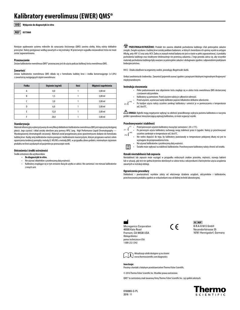 Kalibratory ewerolimusu (EWER) QMS® Wyłącznie do diagnostyki in vitro 0373860 Niniejsze opakowanie systemu mikrosfer do oznaczania ilościowego (QMS) zawiera ulotkę, którą należy dokładnie przeczytać. Należy postępować według zawartych w niej instrukcji. W przeciwnym wypadku niezawodność testu nie może zostać zagwarantowana. Zestaw kalibratorów ewerolimusu QMS® przeznaczony jest do użycia podczas kalibracji testu ewerolimusu QMS. PRZESTROGA/OSTRZEŻENIE: Produkt ten zawiera składniki pochodzenia ludzkiego i/lub potencjalnie zakaźne związki. Związki uzyskane z ludzkiej krwi zostały poddane badaniom, w których stwierdzono ich ujemny wynik na antygen HBsAg, anty-HIV 1/2 oraz anty-HCV. Żadna ze znanych metod badania nie jest w stanie w pełni zagwarantować, iż produkty pochodzenia ludzkiego oraz nieaktywne drobnoustroje nie przeniosą zakażenia. Z tego powodu zaleca się, aby wszystkie materiały pochodzenia ludzkiego były uważane za potencjalnie zakaźne i obsługiwane zgodnie z odpowiednimi praktykami biobezpieczeństwa. Zawartość H412 - Działa szkodliwie na organizmy wodne, powodując długotrwałe skutki. Przeznaczenie Zestaw kalibratorów ewerolimusu QMS składa się z hemolizatu ludzkiej krwi i środka konserwującego (≤1,0%) z zawartością następujących stężeń ewerolimusu: Fiolka Stężenie (ng/ml) Ilość Objętość napełnienia A 0,0 1 3,00 ml B 1,5 1 3,00 ml C 3,0 1 3,00 ml D 6,0 1 3,00 ml E 12,0 1 3,00 ml F 20,0 1 3,00 ml Standaryzacja Materiał referencyjny wykorzystywany do weryfikacji dokładności kalibratorów ewerolimusu QMS jest najwyższej dostępnej jakości. Jego czystość i skład zostały określone przy pomocy HPLC (ang. High Performance Liquid Chromatography — Wysokosprawnej chromatografii cieczowej). Materiał został przygotowany przez grawimetryczne dodanie do hemolizatu ludzkiej krwi. Każdą serię kalibratorów można powiązać z kalibratorami macierzystymi, którym przypisano wartość celem ograniczenia tendencji pomiędzy metodą LC-MS/MS a metodą QMS, w przypadku zbioru próbek z minimalnym stężeniem produktu we krwi uzyskanych od pacjentów po przeszczepie nerek. Ostrzeżenia i środki ostrożności Środki ostrożności dla użytkowników • Do diagnostyki in vitro. • Nie używać składników z przekroczoną datą ważności. • Kalibratory znajdujące się w tym zestawie służą do użytku w całości. Nie zamieniać i nie mieszać kalibratorów z innych serii. Unikać uwolnienia do środowiska. Zawartość/pojemnik usuwać zgodnie z przepisami lokalnymi/regionalnymi/krajowymi/ międzynarodowymi. Instrukcja stosowania • Pełne podsumowanie oraz objaśnienie testu znajduje się w ulotce testu ewerolimusu QMS dostarczonej z zestawem odczynników. • Kalibratory są zamrożone. Przed użyciem należy je całkowicie odmrozić. • Przed użyciem, wymieszać każdy kalibrator poprzez kilkukrotne delikatne odwrócenie. • Po każdym użyciu należy szczelnie zamknąć kalibratory i umieścić je w pomieszczeniu o temperaturze od 2 do 8°C. UWAGA: Bąbelki mogą negatywnie wpłynąć na zdolność prawidłowego wykrycia poziomu kalibratora w naczyniu próbki i spowodować niewystarczającą aspirację kalibratora, co może wypaczyć wyniki. Przechowywanie i stabilność -15°C -25°C • Przed pierwszym użyciem kalibratory muszą być zamrożone (-20 ± 5°C). • Po pierwszym użyciu kalibratory zachowują swoją stabilność przez 6 tygodni. Należy je przechowywać szczelnie zamknięte w temperaturze od 2 do 8°C. • Nie wolno dopuścić do tego, by kalibratory pozostawały w temperaturze pokojowej dłużej niż jest to wymagane do przeprowadzenia testu. • Nie używać kalibratorów z przekroczoną datą ważności. • Światło może wpływać na stabilność kalibratorów. Przechowywane kalibratory należy chronić od światła. Oznaki niestabilności lub zepsucia Niestabilność lub zepsucie może wystąpić w przypadku widocznych znaków przecieku, mętności, rozwoju bakterii lub w sytuacji, gdy test nie spełnia kryteriów określonych w ulotce testu z odczynnikami i/lub kryteriów użycia urządzenia zawartych w instrukcji obsługi. Ograniczenia procedury Dokładność i powtarzalność wyników zależy od właściwego działania urządzeń, odczynników i kalibratorów, przechowywania produktu zgodnie ze wskazówkami oraz od dobrej techniki laboratoryjnej. Microgenics Corporation 46500 Kato Road Fremont, CA 94538 USA Obsługa klienta i pomoc techniczna w USA: 1-800-232-3342 B·R·A·H·M·S GmbH Neuendorfstrasse 25 16761 Hennigsdorf, Germany Aktualizacje ulotki dostępne są na stronie: www.thermoscientific.com/diagnostics Inne kraje: Prosimy o kontakt z lokalnym przedstawicielem Thermo Fisher Scientific. © 2016 Thermo Fisher Scientific Inc. Wszelkie prawa zastrzeżone. QMS® to zastrzeżony znak towarowy firmy Thermo Fisher Scientific Inc. i jej spółek zależnych. 0160065-G-PL 2016 11