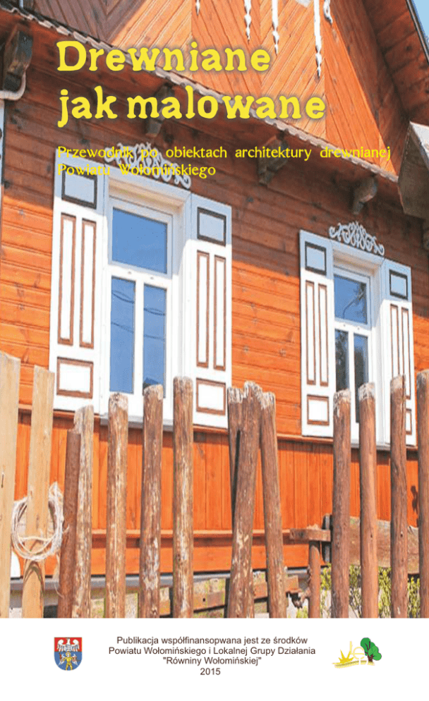Drewniane jak malowane Przewodnik po obiektach architektury drewnianej Powiatu Wołomińskiego Publikacja współfinansopwana jest ze środków Powiatu Wołomińskiego i Lokalnej Grupy Działania "Równiny Wołomińskiej" 2015 Wstęp „Drewniane jak malowane” to nazwa projektu realizowanego ze środków Powiatu Wołomińskiego i Lokalnej Grupy Działania „Równiny Wołomińskiej” w ramach zadania publicznego ogłoszonego w 2015 r. przez powiat z zakresu Turystyki. Projekt ten jest swego rodzaju odkryciem i przypomnieniem dawnych obiektów architektury drewnianej, które znajdują się na obszarze Powiatu Wołomińskiego. Jego zadaniem było zewidencjonowanie i zinwentaryzowanie istniejących obiektów drewnianych oraz zaprezentowanie ich w stworzonym dla turystów przewodniku. Jednocześnie równolegle z przewodnikiem powstała mapa w wersji elektronicznej (do pobrania na stronie www.lgdrw.pl), dzięki której turyści będą mogli poznać miejsca, w których zlokalizowane są stare drewniane domy, stodoły, spichlerze, młyny, kapliczki, krzyże oraz obiekty użyteczności publicznej takie jak biblioteki, muzea, plebanie czy też miejsca pokazujące zabudowę dawnych wsi czego przykładem może być. Skansen w Kuligowie. Wycieczka śladami starych obiektów architektury drewnianej pozwoli turystom na obcowanie z przyrodą i poznanie historycznych miejsc lokalnego dziedzictwa kulturowego oraz potencjału turystycznego obszaru Powiatu Wołomińskiego, który jednocześnie jest obszarem objętym swym działaniem przez Lokalną Grupę Działania „Równiny Wołomińskiej”. 1 Budownictwo drewniane 2 Na przełomie wieków XVI-XVII wykształciły się dwa podstawowe typy budynków mieszkalnych. Dominował typ z układem pomieszczeń ułożonych wokół centralnie usytuowanego pieca z komorowym kominem. Budynek mieszkalny był wyodrębniony względem pozostałych budynków zagrody. Drugi typ, posiadał jednotraktowy lub półtoratraktowy układ pomieszczeń, a część mieszkalna i gospodarcza znajdowały się pod wspólnym dachem. W XVI wieku w wyniku wprowadzenia pomiaru włócznej pojawiły się wsie o układzie szeregówki, w których wszystkie zagrody miały ten sam układ, a chałupy były zwrócone szczytami do ulicy. Wygląd domu zależał od zamożności gospodarza. Najmniejsze i najuboższe były chaty chłopów pańszczyźnianych. Domy budowane były na planie prostokąta, a złożone z układanych na przemian belek zazębiających się w narożach. Najniżej osadzona belka chaty, zwana podwaliną, leżała na kamieniach osadzonych pod węgłami. Chaty te nie miały komina, w całości były kryte słomą. Pokrycie to było charakterystyczne dla niemal wszystkich budynków wiejskich, niezależnie od stopnia zamożności gospodarza. Jeszcze w czasie dwudziestolecia międzywojennego do rzadkości należały dachy kryte dachówkami. Chata chłopa pańszczyźnianego składała się zazwyczaj z jednej tylko izby, komory i sieni. Wnętrze izby bielone było wapnem. Komora stanowiła rodzaj magazynu, trzymano w niej żywność. Chaty średniozamożnych i zamożnych gospodarzy również były drewniane, miały jednak więcej izb mieszkalnych. Mogło być ich trzy (trojak), rzadziej cztery (czworak), bardzo rzadko pięć. Trojaki składały się z dużej izby, alkierza, komory i sieni. Według Mariana Prokopka ten rodzaj budynku był znany co najmniej od XVI-XVII wieku. Oprócz tego występował dom podwójny (dwojak), który posiadał zdwojony układ pomieszczeń względem trojaka. Dom podwójny posiadał ganek uważany za cechę charakterystyczną dla drobnoszlacheckiego budownictwa. W XIX wieku wszystkie domy były okrywane czterospadowym dachem. Na początku XX wieku zastąpiono go dachem dwuspadowym. Po uwłaszczeniu w 1861 nastąpił wzrost zamożności, a wraz z nim zmieniły się rozmiary, jak i wygląd domu. Po I wojnie światowej pojawiła się moda na zdobienie domów. Detale zdobnicze Detale zdobnicze uzyskiwano, wycinając odpowiednie wzory w deskach, które następnie przybijano do naroży domów, nad oknami, bądź wzdłuż krawędzi dachów. Szczególną wagę przykładano do zdobienia frontowych szczytów domów. Dodawane ozdoby były malowane w kolorach kontrastujących względem ścian budynku. Wszystkie detale zdobnicze tworzyły razem harmonijną kompozycję, nadając architekturze drewnianej niepowtarzalny styl, łatwo rozpoznawalny na tle innych regionów kraju. Do wycinania ornamentów używano pił ramowych o wąskim brzeszczocie oraz angielskich świdrów z ostro zakończoną częścią roboczą (narzędzia te pojawiły się w drugiej połowie XIX wieku). Przy wycinaniu zdobień korzystano z przygotowanego wcześniej szablonu, w oparciu o który rysowano ołówkiem kontury wycinanego detalu. Stosowanie szablonów wprowadzało powtarzalność pewnych motywów zdobniczych charakterystycznych dla danego twórcy. Nieliczne motywy były powtarzane w zdobieniach budynków mieszkalnych, w których np. stosowano listwę z ząbkowanym motywem. Architektoniczne elementy zdobnicze Jedną z najwcześniej zdobionych części domu były naroża, do których przybijano pionowo ułożone deski. Początkowo zdobienie naroży polegało na profilowaniu krawędzi desek w kształcie falistej linii bądź ząbkowaniu. Na początku XX wieku naroża były już bogato zdobione. Dekoracje były stanowione przez motywy geometryczno-roślinne. Na obu deskach naroży występowały identyczne motywy zdobnicze, rozmieszczone symetrycznie. Deski naroży dzielone były na kilka, zazwyczaj cztery pola zdobnicze, oddzielone od siebie listwami. W każdym polu umieszczano jeden element zdobniczy. Okna początkowo były niewielkie i pozbawione elementów zdobniczych. Najpierw pojawiły się listwy podokienne z ząbkowanym wycięciem. Na przełomie XIX i XX wieku rozpowszechniły się okiennice. W wyglądzie okiennic zasadnicze znaczenie miał układ płycin, tj. desek o mniejszej 3 grubości od