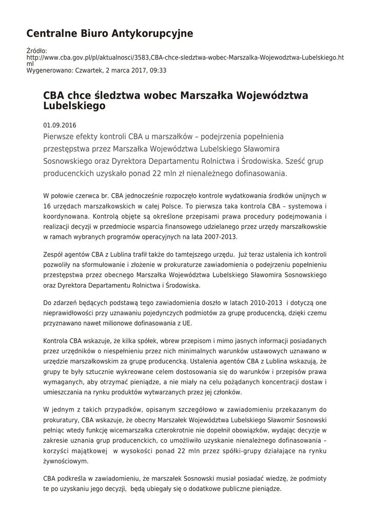 Centralne Biuro Antykorupcyjne Źródło: http://www.cba.gov.pl/pl/aktualnosci/3583,CBA-chce-sledztwa-wobec-Marszalka-Wojewodztwa-Lubelskiego.ht ml Wygenerowano: Czwartek, 2 marca 2017, 09:33 CBA chce śledztwa wobec Marszałka Województwa Lubelskiego 01.09.2016 Pierwsze efekty kontroli CBA u marszałków – podejrzenia popełnienia przestępstwa przez Marszałka Województwa Lubelskiego Sławomira Sosnowskiego oraz Dyrektora Departamentu Rolnictwa i Środowiska. Sześć grup producenckich uzyskało ponad 22 mln zł nienależnego dofinasowania. W połowie czerwca br. CBA jednocześnie rozpoczęło kontrole wydatkowania środków unijnych w 16 urzędach marszałkowskich w całej Polsce. To pierwsza taka kontrola CBA – systemowa i koordynowana. Kontrolą objęte są określone przepisami prawa procedury podejmowania i realizacji decyzji w przedmiocie wsparcia finansowego udzielanego przez urzędy marszałkowskie w ramach wybranych programów operacyjnych na lata 2007-2013. Zespół agentów CBA z Lublina trafił także do tamtejszego urzędu. Już teraz ustalenia ich kontroli pozwoliły na sformułowanie i złożenie w prokuraturze zawiadomienia o podejrzeniu popełnieniu przestępstwa przez obecnego Marszałka Województwa Lubelskiego Sławomira Sosnowskiego oraz Dyrektora Departamentu Rolnictwa i Środowiska. Do zdarzeń będących podstawą tego zawiadomienia doszło w latach 2010-2013 i dotyczą one nieprawidłowości przy uznawaniu pojedynczych podmiotów za grupę producencką, dzięki czemu przyznawano nawet milionowe dofinasowania z UE. Kontrola CBA wskazuje, że kilka spółek, wbrew przepisom i mimo jasnych informacji posiadanych przez urzędników o niespełnieniu przez nich minimalnych warunków ustawowych uznawano w urzędzie marszałkowskim za grupę producencką. Ustalenia agentów CBA z Lublina wskazują, że grupy te były sztucznie wykreowane celem dostosowania się do warunków i przepisów prawa wymaganych, aby otrzymać pieniądze, a nie miały na celu pożądanych koncentracji dostaw i umieszczania na rynku produktów wytwarzanych przez jej członków. W jednym z takich przypadków, opisanym szczegółowo w zawiadomieniu przekazanym do prokuratury, CBA wskazuje, że obecny Marszałek Województwa Lubelskiego Sławomir Sosnowski pełniąc wtedy funkcję wicemarszałka czterokrotnie nie dopełnił obowiązków, wydając decyzje w zakresie uznania grup producenckich, co umożliwiło uzyskanie nienależnego dofinasowania – korzyści majątkowej w wysokości ponad 22 mln przez spółki-grupy działające na rynku żywnościowym. CBA podkreśla w zawiadomieniu, że marszałek Sosnowski musiał posiadać wiedzę, że podmioty te po uzyskaniu jego decyzji, będą ubiegały się o dodatkowe publiczne pieniądze. Zawiadomienie dotyczy podejrzenia popełnienia przez Marszałka Województwa Lubelskiego Sławomira Sosnowskiego oraz wymienionego dyrektora przestępstwa niedopełnienia obowiązków i działania na szkodę interesu publicznego w celu osiągnięcia korzyści majątkowej przez grupy producenckie. Delegatura CBA w Lublinie, składająca zawiadomienie, wniosła do Prokuratury Regionalnej o powierzenie jej postępowania w całości. Kontrole CBA w urzędach marszałkowskich obejmują m.in. przestrzeganie prawa zamówień publicznych, zasad konkurencyjności, dotrzymywanie harmonogramu realizacji projektu, weryfikację zmian w projekcie, poprawność dokonywania płatności, osiąganie wskaźników (czyli rezultatu i produktu) zadeklarowanych we wniosku o dofinansowanie czy weryfikację przedstawianych do refundacji kosztów kwalifikujących się do objęcia wsparciem unijnym. Kompleksowe i systemowe działania kontrolne CBA obejmują także osoby odpowiedzialne za podejmowanie decyzji w instytucjach uczestniczących we wdrażaniu programu operacyjnego od etapu samego podjęcia decyzji o dofinansowaniu projektu do weryfikacji wniosku o płatność. Wydział Komunikacji Społecznej CBA CBA chce śledztwa wobec Marszałka Województwa Lubelskiego