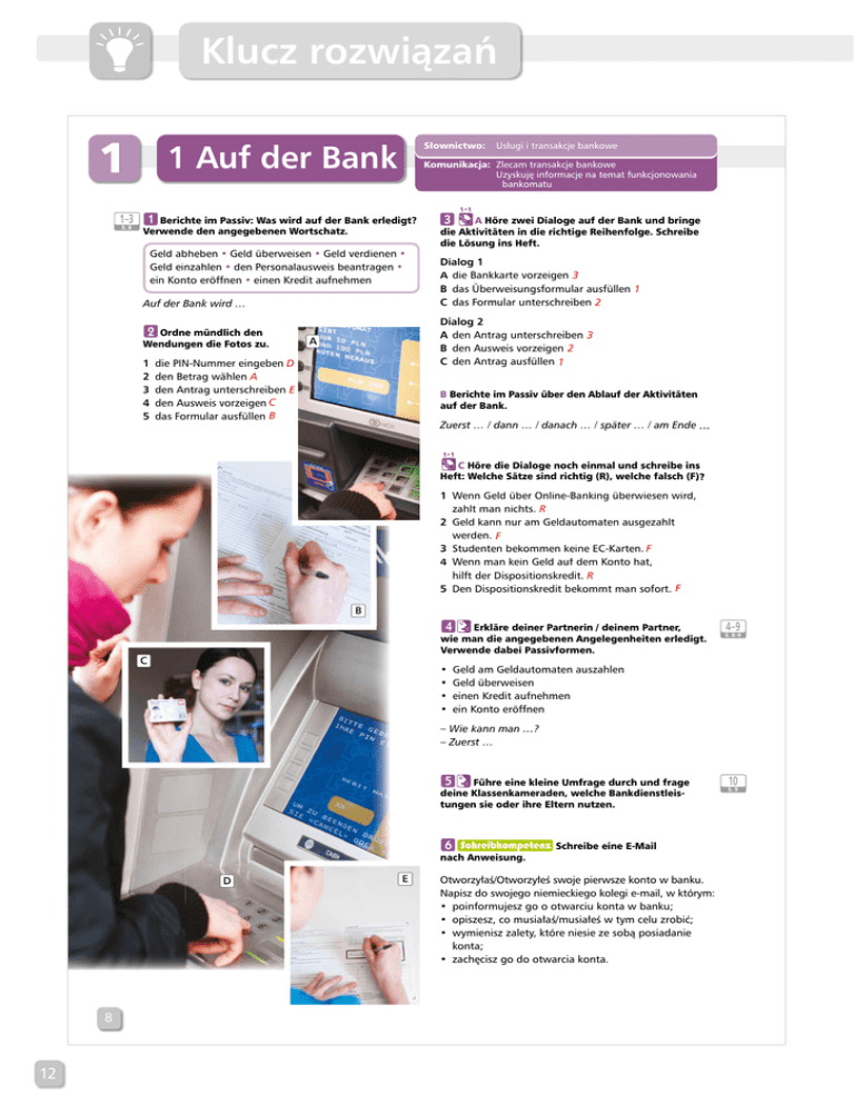 Klucz rozwiązań 1 1–3 S. 8 1 Auf der Bank 1 Berichte im Passiv: Was wird auf der Bank erledigt? Verwende den angegebenen Wortschatz. Geld abheben • Geld überweisen • Geld verdienen • Geld einzahlen • den Personalausweis beantragen • ein Konto eröffnen • einen Kredit aufnehmen Auf der Bank wird … 2 Ordne mündlich den Wendungen die Fotos zu. 1 2 3 4 5 die PIN-Nummer eingeben D den Betrag wählen A den Antrag unterschreiben E den Ausweis vorzeigen C das Formular ausfüllen B Słownictwo: Usługi i transakcje bankowe Komunikacja: Zlecam transakcje bankowe Uzyskuję informacje na temat funkcjonowania bankomatu 1•1 3 A Höre zwei Dialoge auf der Bank und bringe die Aktivitäten in die richtige Reihenfolge. Schreibe die Lösung ins Heft. Dialog 1 A die Bankkarte vorzeigen 3 B das Überweisungsformular ausfüllen 1 C das Formular unterschreiben 2 Dialog 2 A den Antrag unterschreiben 3 B den Ausweis vorzeigen 2 C den Antrag ausfüllen 1 B Berichte im Passiv über den Ablauf der Aktivitäten auf der Bank. Zuerst … / dann … / danach … / später … / am Ende … 1•1 C Höre die Dialoge noch einmal und schreibe ins Heft: Welche Sätze sind richtig (R), welche falsch (F)? 1 Wenn Geld über Online-Banking überwiesen wird, zahlt man nichts. R 2 Geld kann nur am Geldautomaten ausgezahlt werden. F 3 Studenten bekommen keine EC-Karten. F 4 Wenn man kein Geld auf dem Konto hat, hilft der Dispositionskredit. R 5 Den Dispositionskredit bekommt man sofort. F 4 Erkläre deiner Partnerin / deinem Partner, wie man die angegebenen Angelegenheiten erledigt. Verwende dabei Passivformen. • • • • 4–9 S. 8–9 Geld am Geldautomaten auszahlen Geld überweisen einen Kredit aufnehmen ein Konto eröffnen – Wie kann man …? – Zuerst … 5 Führe eine kleine Umfrage durch und frage deine Klassenkameraden, welche Bankdienstleistungen sie oder ihre Eltern nutzen. 6 Schreibkompetenz Schreibe eine E-Mail nach Anweisung. Otworzyłaś/Otworzyłeś swoje pierwsze konto w banku. Napisz do swojego niemieckiego kolegi e-mail, w którym: • poinformujesz go o otwarciu konta w banku; • opiszesz, co musiałaś/musiałeś w tym celu zrobić; • wymienisz zalety, które niesie ze sobą posiadanie konta; • zachęcisz go do otwarcia konta. 8 12 10 S. 9 Klucz rozwiązań Komunikacja: Korzystam z usług pocztowych, np. kupuję znaczki, wysyłam paczkę 1 Geplant und unerwartet 2 Ab geht die Post Słownictwo: Usługi pocztowe 1 4 Führt in Paaren Gespräche wie im Beispiel. 8–10 S. 11 Paket – München – schicken Standard / Express? 1 S. 10 kosten? 1 Sieh dir die Fotos an und beschreibe sie. Verwende die angegebenen Wörter und Wendungen. der Brief • der Briefkasten • die Briefmarke • das Paket • der Schalter • die Post einwerfen • schicken • aufkleben Dann ... bitte. Standard = bis 10 kg – 6,90 € / Express = bis 10 kg – 23,50 € Paketkarte – ausfüllen Bitte schön. 2 1•4 Höre den Dialog und schreibe ins Heft: Was will der Kunde auf der Post erledigen? 1 eine Rechnung bezahlen 2 ein Konto eröffnen 3 eine Sendung abholen 2–7 S. 10–11 3 4 ein Paket schicken 5 ein Telegramm aufgeben 6 Briefmarken kaufen 1•4 Höre den Dialog noch einmal und schreibe ins Heft: Welche Information ist richtig? 1 Auf der Paketkarte fehlt noch … A der Empfänger. B der Absender. C die Postleitzahl. 2 Für das Standardpaket nach München bezahlt der Kunde … A 17,00 Euro. B 23,50 Euro. C 6,90 Euro. 3 Die Schwester des Kunden bekommt das Paket … A noch am selben Tag. B am nächsten Tag. C in zwei Tagen. 4 Kompaktbriefe … A wiegen 20 Gramm. B sind schwerer als Standardbriefe. C sind leichter als 20 Gramm. Zakupy i usługi Absender / Empfänger / Postleitzahl – fehlen Oh, Entschuldigung. Paket – wiegen – 5,2 kg / zahlen – 6,90 € / 23,50 € 5 Führt in Paaren Gespräche auf der Post über die angegebenen Themen. Verwendet die Wendungen aus Aufgaben 1–4. 11–12 S. 11 Du willst ... • eine Briefmarke für einen Brief nach London kaufen. • ein Paket nach Australien schicken. • einen Brief abholen. 6 Schreibkompetenz Schreibe eine E-Mail nach Anweisung. Przebywasz na wymianie w Niemczech. Wyjeżdżasz na tydzień. W pociągu zauważyłaś/zauważyłeś, że nie wysłałaś/wysłałeś ważnego listu, który został na twoim biurku. Napisz do swojego współlokatora e-mail, w którym: • poprosisz o wysłanie listu; • poinformujesz, że nakleiłaś/nakleiłeś już odpowiedni znaczek; • napiszesz, że musi jedynie wrzucić list do skrzynki; • podziękujesz za pomoc. 9 13 Klucz rozwiązań 1 3 Ungewöhnliche Fälle 1 Ordne mündlich den Personen (Opfer, Krimineller, Polizist) passende Aktivitäten zu. jemanden mit der Waffe bedrohen • den Täter verfolgen • um Hilfe rufen • in die Wohnung / ins Auto einbrechen • dem Opfer helfen • Geld / Auto stehlen • die Polizei verständigen • den Täter festnehmen • jemanden / eine Bank / ein Geschäft überfallen • den Fall untersuchen • jemanden ermorden Słownictwo: Nazwy przestępstw i wykroczeń Komunikacja: Relacjonuję przebieg przestępstwa / wykroczenia 4 Wählt eine Meldung aus Aufgabe 3: A, B oder C und berichtet in Paaren über den gewählten Vorfall. Verwendet die Wendungen aus Aufgabe 1. 5 Schreibt in Paaren eine Meldung zu einem der Bilder (1–3) auf. Opfer ? Krimineller ? Polizist ? 1–5 S. 12 2 Verbinde mündlich die Synonyme. 1 ermorden C 2 stehlen B 3 festnehmen A A verhaften B klauen C töten 6–8 3 A Lies die Pressemeldungen und ordne ihnen mündlich die Bezeichnungen der Straftaten, um welche es geht, zu. Manchmal geht es in den Meldungen um mehrere Straftaten. S. 13 1 2 3 4 5 Diebstahl A, B, C Einbruch B, C Überfall A, C Mord C Drogenhandel – B Lies die Meldungen noch einmal und ordne mündlich den Texten die angegebenen Schlagzeilen zu. Zwei Schlagzeilen passen zu keinem Text. 1 2 3 4 5 C 10 14 Räuber fliehen mit gestohlenem Auto Einbrecher hat Pech B Dieb in Wohnung fe