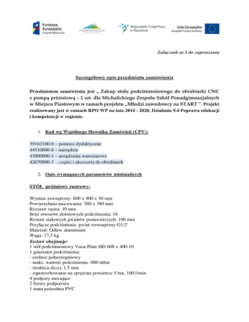 Załącznik nr 5 do zaproszenia Szczegółowy opis przedmiotu zamówienia Przedmiotem zamówienia jest ,, Zakup stołu podciśnieniowego do obrabiarki CNC z pompą próżniową – 1 szt. dla Michalickiego Zespołu Szkół Ponadgimnazjalnych w Miejscu Piastowym w ramach projektu „Młodzi zawodowcy na START ”. Projekt realizowany jest w ramach RPO WP na lata 2014 - 2020, Działanie 9.4 Poprawa edukacji i kompetencji w regionie. 1. Kod wg Wspólnego Słownika Zamówień (CPV): 39162100-6 – pomoce dydaktyczne 44510000-8 – narzędzia 43800000-1 – urządzenia warsztatowe 42670000-3 - części i akcesoria do obrabiarek 2. Opis wymaganych parametrów minimalnych STÓŁ próżniowy rastrowy: Wymiar zewnętrzny: 600 x 400 x 30 mm Powierzchnia mocowania: 580 x 380 mm Rozstaw rastra: 10 mm Ilość otworów dolotowych podciśnienia: 16 Rostaw stalowych gwintów pomocniczych: 100 mm Przyłącze podciśnienia: gwint wewnętrzny G1/2' Materiał: Odlew aluminium Waga: 17,5 kg Zestaw obejmuje: 1 stół podciśnieniowy Vacu-Plate HD 600 x 400-10 1 generator podciśnienia: - eżektor jednostopniowy - maks. wartość podciśnienia -900 mbar - średnica dyszy 1,5 mm - zapotrzebowanie na sprężone powietrze 5 bar, 100 l/min 4 podpory mocujące 2 listwy podporowe 1 mata pośrednia PVC profil uszczelniający Jeżeli do mocowania są niezbędne śruby mocujące, zestaw powinien je zawierać w odpowiedniej ilości. Centrala podciśnieniowa MVZ-10-OE-15 400V AC3 Kompletna centrala podciśnieniowa (stacja próżniowa)zapewnia profesjonalne zasilanie obwodów podciśnieniowych. Centrala podciśnieniowa jest fabrycznie wyposażona w następujące elementy: - akumulator podciśnienia (zbiornik podciśnienia) - olejową pompę próżniową - wakuometr - zawór zwrotny - filtr podciśnieniowy - separator cieczy - ręczny dwudrożny zawór odcinający Parametry techniczne: Typ generatora próżni: rotacyjna olejowa pompa łopatkowa Pompa próżniowa: MVP 10-OE 400V AC3 Maks. wartość uzyskiwanego podciśnienia: -980 mbar Wydatek podciśnienia: 10m3/h Moc: 0,37 kW Zasilanie: AC3 400V Pojemność akumulatora podciśnienia: 15 l Zawór zwrotny: tak Zawór odcinający: kulowy typu 2/2 Filtr podciśnieniowy: puszkowy 3/4" Separator cieczy: 1/2" Wakuometr: 63 mm, z zielono-czerwoną skalą Włącznik główny: tak, z zabezpieczeniem przeciw przeciążeniowym Wymiary: ok. 500x450x470 (szer.x głęb.x wys.) Waga: ok. 50 kg Tam, gdzie zostało wskazane pochodzenie (marka, znak towarowy, producent, dostawca) materiałów lub normy, aprobaty, specyfikacje i systemy, o których mowa w art. 30 ust. 1-3 Ustawy Prawo zamówień publicznych, Zamawiający dopuszcza oferowanie materiałów lub rozwiązań równoważnych pod warunkiem, że zapewnią uzyskanie parametrów technicznych nie gorszych od założonych.
