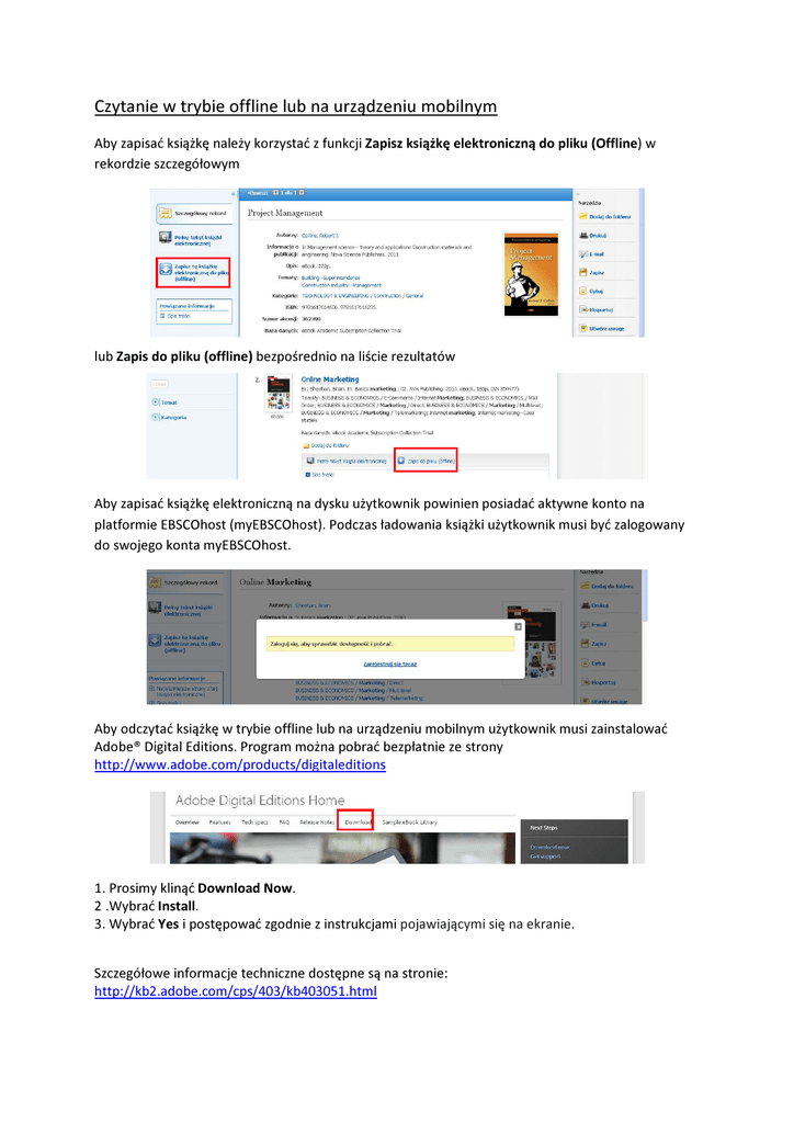 Czytanie w trybie offline lub na urządzeniu mobilnym Aby zapisać książkę należy korzystać z funkcji Zapisz książkę elektroniczną do pliku (Offline) w rekordzie szczegółowym lub Zapis do pliku (offline) bezpośrednio na liście rezultatów Aby zapisać książkę elektroniczną na dysku użytkownik powinien posiadać aktywne konto na platformie EBSCOhost (myEBSCOhost). Podczas ładowania książki użytkownik musi być zalogowany do swojego konta myEBSCOhost. Aby odczytać książkę w trybie offline lub na urządzeniu mobilnym użytkownik musi zainstalować Adobe® Digital Editions. Program można pobrać bezpłatnie ze strony http://www.adobe.com/products/digitaleditions 1. Prosimy klinąć Download Now. 2 .Wybrać Install. 3. Wybrać Yes i postępować zgodnie z instrukcjami pojawiającymi się na ekranie. Szczegółowe informacje techniczne dostępne są na stronie: http://kb2.adobe.com/cps/403/kb403051.html Użytkownik może określić na jak długo zamierza „wypożyczyć” książkę – opcja Okres eksportu (w dniach) Większość książek można zapisać w formacie PDF. Są również takie tytuły, które można wyeksportować w formacie ePub lub PDF Po pomyślnym wyeksportowaniu książki w lewym dolnym rogu ukaże się link do zapisanej książki. Po kliknięciu na link zapisana książka otworzy się automatycznie w programie Adobe Digital Edition.