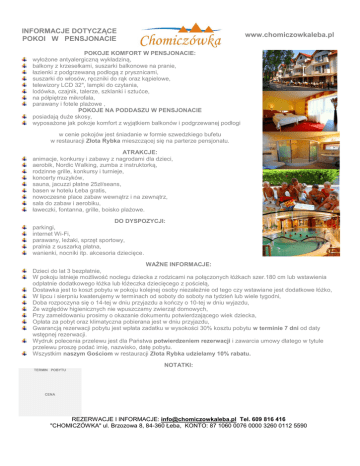 INFORMACJE DOTYCZĄCE POKOI W PENSJONACIE www.chomiczowkaleba.pl POKOJE KOMFORT W PENSJONACIE: wyłożone antyalergiczną wykładziną, balkony z krzesełkami, suszarki balkonowe na pranie, łazienki z podgrzewaną podłogą z prysznicami, suszarki do włosów, ręczniki do rąk oraz kąpielowe, telewizory LCD 32", lampki do czytania, lodówka, czajnik, talerze, szklanki i sztućce, na półpiętrze mikrofala, parawany i fotele plażowe , POKOJE NA PODDASZU W PENSJONACIE posiadają duże skosy, wyposażone jak pokoje komfort z wyjątkiem balkonów i podgrzewanej podłogi w cenie pokojów jest śniadanie w formie szwedzkiego bufetu w restauracji Złota Rybka mieszczącej się na parterze pensjonatu. ATRAKCJE: animacje, konkursy i zabawy z nagrodami dla dzieci, aerobik, Nordic Walking, zumba z instruktorką, rodzinne grille, konkursy i turnieje, koncerty muzyków, sauna, jacuzzi płatne 25zł/seans, basen w hotelu Łeba gratis, nowoczesne place zabaw wewnątrz i na zewnątrz, sala do zabaw i aerobiku, ławeczki, fontanna, grille, boisko plażowe. DO DYSPOZYCJI: parkingi, internet Wi-Fi, parawany, leżaki, sprzęt sportowy, pralnia z suszarką płatna, wanienki, nocniki itp. akcesoria dziecięce. WAŻNE INFORMACJE: Dzieci do lat 3 bezpłatnie, W pokoju istnieje możliwość noclegu dziecka z rodzicami na połączonych łóżkach szer.180 cm lub wstawienia odpłatnie dodatkowego łóżka lub łóżeczka dziecięcego z pościelą, Dostawka jest to koszt pobytu w pokoju kolejnej osoby niezależnie od tego czy wstawiane jest dodatkowe łóżko, W lipcu i sierpniu kwaterujemy w terminach od soboty do soboty na tydzień lub wiele tygodni, Doba rozpoczyna się o 14-tej w dniu przyjazdu a kończy o 10-tej w dniu wyjazdu, Ze względów higienicznych nie wpuszczamy zwierząt domowych, Przy zameldowaniu prosimy o okazanie dokumentu potwierdzającego wiek dziecka, Opłata za pobyt oraz klimatyczna pobierana jest w dniu przyjazdu, Gwarancją rezerwacji pobytu jest wpłata zadatku w wysokości 30% kosztu pobytu w terminie 7 dni od daty wstępnej rezerwacji. Wydruk polecenia przelewu jest dla Państwa potwierdzeniem rezerwacji i zawarcia umowy dlatego w tytule przelewu proszę podać imię, nazwisko, datę pobytu. Wszystkim naszym Gościom w restauracji Złota Rybka udzielamy 10% rabatu. NOTATKI: TERMIN POBYTU CENA REZERWACJE I INFORMACJE: [email protected] Tel. 609 816 416 "CHOMICZÓWKA" ul. Brzozowa 8, 84-360 Łeba, KONTO: 87 1060 0076 0000 3260 0112 5590 INFORMACJE DOTYCZĄCE DOMKÓW www.chomiczowkaleba.pl DOMKI: domki wynajmujemy wyłącznie rodzinom, odgrodzony teren zielony przed domkiem z grillem, 2 taras 7,5m ze stołami i ławkami, suszarka na pranie, 2 dwa pokoje: salon i sypialnia razem 22m , łazienka z prysznicem, w salonie kanapa 130x205cm składana, w sypialni do wyboru: kanapa 120x205cm lub dwa pojedyncze łóżka szer. 70cm lub łóżko piętrowe, telewizor 21", lampka do czytania, aneks kuchenny: zlewozmywak, lodówka, czajnik, talerze, szklanki i sztućce, parawany i fotele plażowe. ATRAKCJE: animacje, konkursy i zabawy z nagrodami dla dzieci, aerobik, Nordic Walking, zumba z instruktorką, rodzinne grille, konkursy i turnieje, koncerty muzyków, sauna, jacuzzi płatne 25zł/seans, basen w hotelu Łeba gratis, nowoczesne place zabaw wewnątrz i na zewnątrz, sala do zabaw i aerobiku, ławeczki, fontanna, grille, boisko plażowe. DO DYSPOZYCJI: kuchnia z kuchenkami, mikrofalą, garnkami, patelniami itp., parkingi, internet Wi-Fi, parawany, leżaki, sprzęt sportowy, pralnia z suszarką płatna, wanienki, nocniki itp. akcesoria dziecięce. WAŻNE INFORMACJE: Wszystkie miejsca rekreacji w pensjonacie dostępne są dla Gości z domków, W domkach istnieje możliwość wstawienia łóżeczka dziecięcego, Cena za domek nie zawiera śniadań. Jest możliwość zamówienia z 10 lub 15% rabatem śniadań w formie szwedzkiego bufetu i obiadokolacji według cennika na stronie lub wybranie dań z karty w restauracji Złota Rybka mieszczącej się na parterze pensjonatu, Wszystkim naszym Gościom w restauracji Złota Rybka udzielamy 10% rabatu, W lipcu i sierpniu kwaterujemy w terminach od soboty do soboty na tydzień lub wiele tygodni, Doba rozpoczyna się o 14-tej w dniu przyjazdu a kończy o 10-tej w dniu wyjazdu, Ze względów higienicznych nie wpuszczamy zwierząt domowych, Przy zameldowaniu prosimy o okazanie dokumentu potwierdzającego wiek dziecka, Opłata za pobyt oraz klimatyczna pobierana jest w dniu przyjazdu, Gwarancją rezerwacji pobytu jest wpłata zadatku w wysokości 30% kosztu pobytu w terminie 7 dni od daty wstępnej rezerwacji, Wydruk polecenia przelewu jest dla Państwa potwierdzeniem rezerwacji i zawarcia umowy dlatego w tytule przelewu proszę podać imię, nazwisko, datę pobytu. NOTATKI: TERMIN POBYTU CENA REZERWACJE I INFORMACJE: [email protected] Tel. 609 816 416 "CHOMICZÓWKA" ul. Brzozowa 8, 84-360 Łeba, KONTO: 87 1060 0076 0000 3260 0112 5590