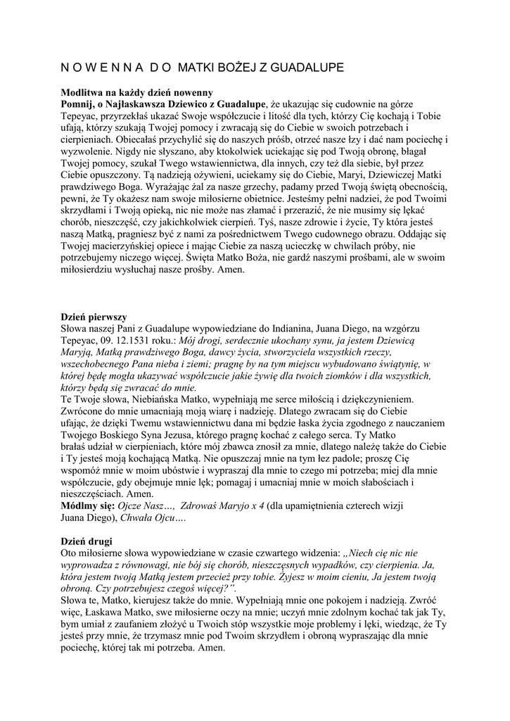 N O W E N N A D O MATKI BOŻEJ Z GUADALUPE Modlitwa na każdy dzień nowenny Pomnij, o Najłaskawsza Dziewico z Guadalupe, że ukazując się cudownie na górze Tepeyac, przyrzekłaś ukazać Swoje współczucie i litość dla tych, którzy Cię kochają i Tobie ufają, którzy szukają Twojej pomocy i zwracają się do Ciebie w swoich potrzebach i cierpieniach. Obiecałaś przychylić się do naszych próśb, otrzeć nasze łzy i dać nam pociechę i wyzwolenie. Nigdy nie słyszano, aby ktokolwiek uciekając się pod Twoją obronę, błagał Twojej pomocy, szukał Twego wstawiennictwa, dla innych, czy też dla siebie, był przez Ciebie opuszczony. Tą nadzieją ożywieni, uciekamy się do Ciebie, Maryi, Dziewiczej Matki prawdziwego Boga. Wyrażając żal za nasze grzechy, padamy przed Twoją świętą obecnością, pewni, że Ty okażesz nam swoje miłosierne obietnice. Jesteśmy pełni nadziei, że pod Twoimi skrzydłami i Twoją opieką, nic nie może nas złamać i przerazić, że nie musimy się lękać chorób, nieszczęść, czy jakichkolwiek cierpień. Tyś, nasze zdrowie i życie, Ty która jesteś naszą Matką, pragniesz być z nami za pośrednictwem Twego cudownego obrazu. Oddając się Twojej macierzyńskiej opiece i mając Ciebie za naszą ucieczkę w chwilach próby, nie potrzebujemy niczego więcej. Święta Matko Boża, nie gardź naszymi prośbami, ale w swoim miłosierdziu wysłuchaj nasze prośby. Amen. Dzień pierwszy Słowa naszej Pani z Guadalupe wypowiedziane do Indianina, Juana Diego, na wzgórzu Tepeyac, 09. 12.1531 roku.: Mój drogi, serdecznie ukochany synu, ja jestem Dziewicą Maryją, Matką prawdziwego Boga, dawcy życia, stworzyciela wszystkich rzeczy, wszechobecnego Pana nieba i ziemi; pragnę by na tym miejscu wybudowano świątynię, w której będę mogła ukazywać współczucie jakie żywię dla twoich ziomków i dla wszystkich, którzy będą się zwracać do mnie. Te Twoje słowa, Niebiańska Matko, wypełniają me serce miłością i dziękczynieniem. Zwrócone do mnie umacniają moją wiarę i nadzieję. Dlatego zwracam się do Ciebie ufając, że dzięki Twemu wstawiennictwu dana mi będzie łaska życia zgodnego z nauczaniem Twojego Boskiego Syna Jezusa, którego pragnę kochać z całego serca. Ty Matko brałaś udział w cierpieniach, które mój zbawca znosił za mnie, dlatego należę także do Ciebie i Ty jesteś moją kochającą Matką. Nie opuszczaj mnie na tym łez padole; proszę Cię wspomóż mnie w moim ubóstwie i wypraszaj dla mnie to czego mi potrzeba; miej dla mnie współczucie, gdy obejmuje mnie lęk; pomagaj i umacniaj mnie w moich słabościach i nieszczęściach. Amen. Módlmy się: Ojcze Nasz…, Zdrowaś Maryjo x 4 (dla upamiętnienia czterech wizji Juana Diego), Chwała Ojcu…. Dzień drugi Oto miłosierne słowa wypowiedziane w czasie czwartego widzenia: „Niech cię nic nie wyprowadza z równowagi, nie bój się chorób, nieszczęsnych wypadków, czy cierpienia. Ja, która jestem twoją Matką jestem przecież przy tobie. Żyjesz w moim cieniu, Ja jestem twoją obroną. Czy potrzebujesz czegoś więcej?”. Słowa te, Matko, kierujesz także do mnie. Wypełniają mnie one pokojem i nadzieją. Zwróć więc, Łaskawa Matko, swe miłosierne oczy na mnie; uczyń mnie zdolnym kochać tak jak Ty, bym umiał z zaufaniem złożyć u Twoich stóp wszystkie moje problemy i lęki, wiedząc, że Ty jesteś przy mnie, że trzymasz mnie pod Twoim skrzydłem i obroną wypraszając dla mnie pociechę, której tak mi potrzeba. Amen. Módlmy się: Dzień trzeci Kiedy odwiedziłaś i uzdrowiłaś wuja Juana Diego, Juana Bernardino, objawiając mu Twoje imię, „Niepokalana Dziewica Maryja, która skruszyła głowę węża”, wypełniłaś serca Indian wielką radością. Zrozumieli wtedy, że nie muszą już składać swoim bożkom ofiar z ludzi. Bądź pochwalona, Święta Królowo, miłosierna Matko! Bądź pochwalona, nasze życie, nasza słodyczy i nasza nadziejo! Pozwól mi włączyć się w pieśń chwały, którą do dnia dzisiejszego cały nasz naród śle przed Twój tron. Wielu pielgrzymuje z dalekich stron, by ofiarować Ci dary i modły. Módl się za nami, święta Matko Boża, usuń węża zła z naszego życia, abyśmy stali się godnymi obietnic Chrystusa Twojego Boskiego Syna. Amen. Módlmy się: Dzień czwarty Kiedy Indianie zobaczyli przecudowny obraz przedstawiający Ciebie na płaszczu Juana Diego, uznali to jako specjalne, niebiańskie przesłanie skierowane do nich. Twoja królewska figura w formie ludzkiej istoty przekonywała ich, że kiedyś nasza ziemia była miejscem Twojego pobytu. Promienie słońca, chmury otaczające Twe ciało, gwiazdy na Twej szacie i księżyc pod Twymi stopami, wreszcie Anioł, który Cię niesie, to wszystko wskazywało, że Twoje obecne mieszkanie znajduje się w niebie. Uczyłaś ich przez to, że nasze życie nie kończy się ze śmiercią, ale trwa wiecznie. O Święta Maryjo, ta nauka dana Indianom niech mnie także uczy, że mam nieśmiertelną duszę i że niebo jest celem i dziedzictwem mego życia. W pośrodku pokus i bólów tego życia, niech zawsze pamiętam o obiecanym mi miejscu pokoju, chwały i wiecznego szczęścia. Módlmy się: Dzień piąty Przez tysiąclecia meksykańscy Indianie czcili słońce i składali mu w ofierze wielu swoich synów i córek. Jednak, gdy zaczęli spoglądać na Twój obraz porzucili oni swoich fałszywych bogów i przyjęli nauczanie Twego Boskiego Syna. Od tego czasu nie przestawali dziękować Bogu za miłosierdzie, jakim w swojej wszechmocy ich obdarzył. To właśnie Bóg przysłał Ciebie byś była ich Królową, Matką i Nauczycielką. O Święta Maryjo, pomóż nam zrozumieć głębię tajemnicy wcielenia Twego ukochanego Syna, naszego Pana Jezusa Chrystusa, naszego Zbawcy. To, że właśnie On stał się naszym Bratem i dał nam Ciebie za Matkę. Amen. Módlmy się: Dzień szósty Ogień, który się palił na ołtarzach fał