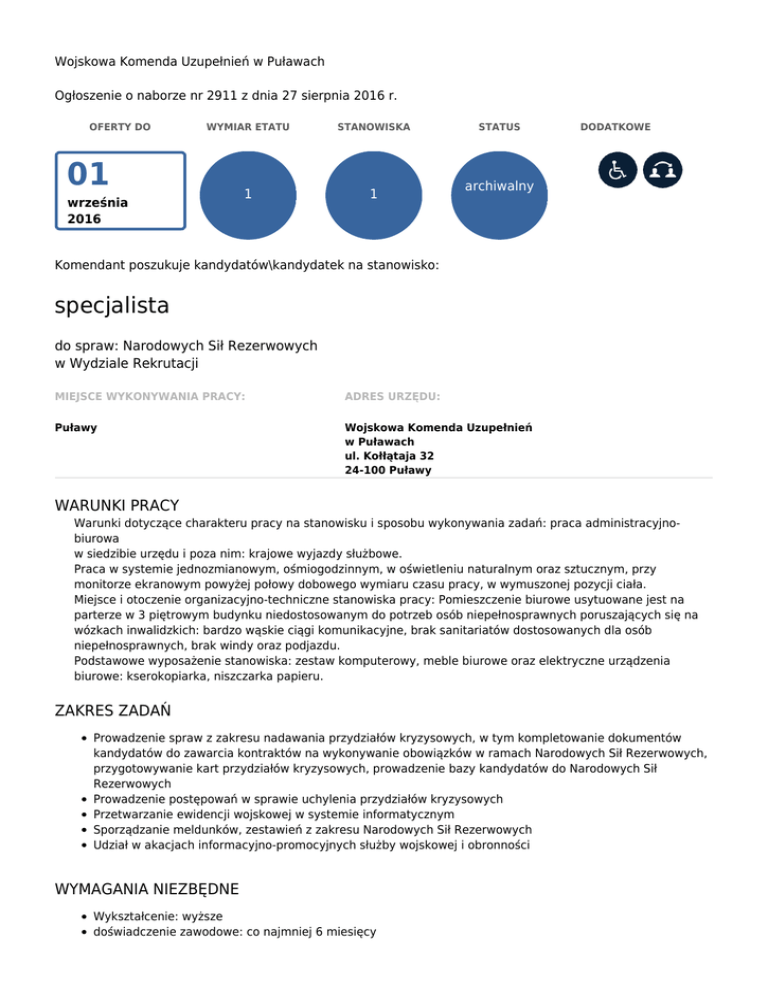 Wojskowa Komenda Uzupełnień w Puławach Ogłoszenie o naborze nr 2911 z dnia 27 sierpnia 2016 r. OFERTY DO WYMIAR ETATU STANOWISKA 1 1 01 września 2016 STATUS DODATKOWE archiwalny Komendant poszukuje kandydatów\kandydatek na stanowisko: specjalista do spraw: Narodowych Sił Rezerwowych w Wydziale Rekrutacji MIEJSCE WYKONYWANIA PRACY: ADRES URZĘDU: Puławy Wojskowa Komenda Uzupełnień w Puławach ul. Kołłątaja 32 24-100 Puławy WARUNKI PRACY Warunki dotyczące charakteru pracy na stanowisku i sposobu wykonywania zadań: praca administracyjnobiurowa w siedzibie urzędu i poza nim: krajowe wyjazdy służbowe. Praca w systemie jednozmianowym, ośmiogodzinnym, w oświetleniu naturalnym oraz sztucznym, przy monitorze ekranowym powyżej połowy dobowego wymiaru czasu pracy, w wymuszonej pozycji ciała. Miejsce i otoczenie organizacyjno-techniczne stanowiska pracy: Pomieszczenie biurowe usytuowane jest na parterze w 3 piętrowym budynku niedostosowanym do potrzeb osób niepełnosprawnych poruszających się na wózkach inwalidzkich: bardzo wąskie ciągi komunikacyjne, brak sanitariatów dostosowanych dla osób niepełnosprawnych, brak windy oraz podjazdu. Podstawowe wyposażenie stanowiska: zestaw komputerowy, meble biurowe oraz elektryczne urządzenia biurowe: kserokopiarka, niszczarka papieru. ZAKRES ZADAŃ Prowadzenie spraw z zakresu nadawania przydziałów kryzysowych, w tym kompletowanie dokumentów kandydatów do zawarcia kontraktów na wykonywanie obowiązków w ramach Narodowych Sił Rezerwowych, przygotowywanie kart przydziałów kryzysowych, prowadzenie bazy kandydatów do Narodowych Sił Rezerwowych Prowadzenie postępowań w sprawie uchylenia przydziałów kryzysowych Przetwarzanie ewidencji wojskowej w systemie informatycznym Sporządzanie meldunków, zestawień z zakresu Narodowych Sił Rezerwowych Udział w akacjach informacyjno-promocyjnych służby wojskowej i obronności WYMAGANIA NIEZBĘDNE Wykształcenie: wyższe doświadczenie zawodowe: co najmniej 6 miesięcy Poświadczenie bezpieczeństwa o klauzuli „poufne” lub zgoda na przeprowadzenie postępowania sprawdzającego umożliwiającego uzyskanie poświadczenia bezpieczeństwa o klauzuli „poufne" Znajomość przepisów ustawy o powszechnym obowiązku obrony Rzeczypospolitej Polskiej oraz przepisów rozporządzenia regulującego nadawanie przydziałów kryzysowych Znajomość przepisów kodeksu postępowania administracyjnego Biegła obsługa programów komputerowych typu: Word, Excel, Outlook oraz Internetu Umiejętności: stosowanie prawa w praktyce, pracy w warunkach stresu i pod presją czasu, pracy w zespole, umiejętność skutecznego komunikowania się w mowie i w piśmie Posiadanie obywatelstwa polskiego Korzystanie z pełni praw publicznych Nieskazanie prawomocnym wyrokiem za umyślne przestępstwo lub umyślne przestępstwo skarbowe WYMAGANIA DODATKOWE Wykształcenie: wyższe na kierunku: administracja, prawo, bezpieczeństwo narodowe lub wyższa szkoła oficerska doświadczenie zawodowe: co najmniej 6 miesięcy w administracji publicznej Posiadanie czynnego prawa jazdy Znajomość obsługi systemu teleinformatycznego Spirala-Zint DOKUMENTY I OŚWIADCZENIA NIEZBĘDNE Życiorys/CV i list motywacyjny Kopie dokumentów potwierdzających spełnienie wymagania niezbędnego w zakresie wykształcenia Kopie świadectw pracy lub kopia świadectwa służby albo zaświadczenie o zatrudnieniu lub kopie innych dokumentów potwierdzających wymagane niezbędne doświadczenie zawodowe Kopia poświadczenia bezpieczeństwa uprawniającego do dostępu do informacji niejawnych oznaczonych klauzulą „poufne” lub oświadczenie o wyrażeniu zgody na przeprowadzenie postępowania sprawdzającego zgodnie z ustawą z dnia 5 sierpnia 2010 r. o ochronie informacji niejawnych (Dz. U. Nr 182, poz. 1228 ze zm.) Oświadczenie o posiadaniu obywatelstwa polskiego albo kopia dokumentu potwierdzającego posiadanie polskiego obywatelstwa Oświadczenie o wyrażeniu zgody na przetwarzanie danych osobowych do celów naboru Oświadczenie o korzystaniu z pełni praw publicznych Oświadczenie o nieskazaniu prawomocnym wyrokiem za umyślne przestępstwo lub umyślne przestępstwo skarbowe DOKUMENTY I OŚWIADCZENIA DODATKOWE kopia dokumentu potwierdzającego niepełnosprawność - w przypadku kandydatek/kandydatów, zamierzających skorzystać z pierwszeństwa w zatrudnieniu w przypadku, gdy znajdą się w gronie najlepszych kandydatek/kandydatów Kopie dokumentów potwierdzających spełnienie wymagania dodatkowego w zakresie wykształcenia Kopie świadectw pracy lub kopia świadectwa służby lub kopie innych dokumentów, które potwierdzają co najmniej 6 miesięczne doświadczenie zawodowe w administracji publicznej Kopia prawa jazdy TERMINY I MIEJSCE SKŁADANIA DOKUMENTÓW Dokumenty należy złożyć do: 01 września 2016 r. Decyduje data: stempla pocztowego / osobistego dostarczenia oferty do urzędu Miejsce składania dokumentów: Wojskowa Komenda Uzupełnień w Puławach ul. Kołłątaja 32 24-100 Puławy INNE INFORMACJE: W miesiącu poprzedzającym datę upublicznienia ogłoszenia wskaźnik zatrudnienia osób niepełnosprawnych w urzędzie, w rozumieniu przepisów o rehabilitacji zawodowej i społecznej oraz zatrudnianiu osób niepełnosprawnych, nie wynosi co najmniej 6%. Ogłoszenie o naborze w celu zastępstwa nieobecnego członka korpusu służby cywilnej. Wynagrodzenie zasadnicze na ww. stanowisku wynosi 2599,01 zł brutto. Do udziału w naborze zachęcamy również osoby niepełnosprawne, które spełniają wymagania określone w ogłoszeniu (po uwzględnieniu informacji dotyczących oferowanych warunków pracy). Wymagane oświadczenia, życiorys/CV oraz list motywacyjny muszą być opatrzone własnoręcznym podpisem i datą. Wzory oświadczeń potwierdzających spełnienie wymagań wynikających z ustawy o służbie cywilnej można pobrać pod adresem: https://dsc.kprm.gov.pl/wzory-oswiadczen-w-naborach Oferty otrzymane po t