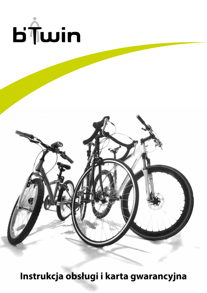 Instrukcja obsługi i karta gwarancyjna Producent rowerów Koncepcja Firma b’Twin projektuje i opracowuje pełną gamę produktów, przeznaczonych do wszelkiego rodzaju zastosowania. Pracownicy firmy posiadają wszechstronne umiejętności i z prawdziwą pasją opracowują nowe rozwiązania oraz technologie dotyczące rowerów. Produkty b’Twin są tworzone właśnie przez naszych inżynierów oraz projektantów. Innowacja Jako największy europejski producent rowerów, prowadzimy w naszym ośrodku badawczym b ’Twin innowacyjne prace badawczo-rozwojowe, aby użytkownicy naszych produktów mogli w pełni żyć swoim hobby. Projekt Nasze biuro projektowe zapewnia, że wszystkie nowe produkty b’Twin odpowiadają oczekiwaniom klientów. Szczególną uwagę zwracamy na zapewnienie, że rozwiązania technologiczne, komfort i wygląd naszych rowerów doskonale odpowiadają ich zastosowaniom. Nowoczesność, prostota i pasja to najważniejsze cechy, które kierują naszą wyobraźnią. Test zmęczeniowy Nasza firma nie ma żadnej litości dla prototypów swoich produktów, takich jak b’Twin : – z ponad 250 przetestowanych komponentów wybraliśmy zaledwie 74. – podczas prac testowych poddaliśmy kontroli ponad 50 prototypów. – w naszych zakładach przeprowadzono ponad 3000 godzin testów. 2 ZGODNOŚĆ Z WYMOGAMI BEZPIECZEŃSTWA Dziękujemy za zakup roweru marki b’Twin Dokonali Państwo zakupu roweru marki b’Twin. Aby zapewnić, że produkt ten będzie Państwu służył przez jak najdłuższy okres, prosimy o zapoznanie się z niniejszą instrukcją obsługi: zostały w niej zamieszczone wszystkie informacje niezbędne w celu zapewnienia prawidłowego użytkowania, regulacji i utrzymania roweru b’Twin. Niniejsza instrukcja obsługi powinna zostać zachowana do użycia w przyszłości. Niniejsza instrukcja ogólna oraz instrukcje dotyczące poszczególnych elementów (przerzutki, hamulce, kierownika...) są dostępne na stronie internetowej www.btwin.com SPIS TREŚCI SPIS TREŚCI............................................................................................................................................................................................................................................................. 3 Ogólne ostrzeżenie....................................................................................................................................................................................................................................... 4 Mini-słowniczek rowerowy......................................................................................................................................................................................................... 4 RÓŻNE ZASTOSOWANIA I OGRANICZENIA ROWERU............................................................................................................................................. 5 Ogólne ograniczenia użytkowania................................................................................................................................................................................................... 5 Warunki przechowywania........................................................................................................................................................................................................... 5 Rodzaje rowerów i ich zastosowanie .............................................................................................................................................................................. 5 PORADY DOTYCZĄCE BEZPIECZNEJ JAZDY NA ROWERZE.............................................................................................................................. 6 PORADY DOTYCZĄCE REGULACJI POZYCJI UŻYTKOWNIKA NA ROWERZE.................................................................................. 8 KONTROLA BEZPIECZEŃSTWA PRZED UŻYCIEM................................................................................................................................................................. 9 REGULACJE PO KILKU GODZINACH.................................................................................................................................................................................................. 10 KONSERWACJA ROWERU............................................................................................................................................................................................................................ 10 A - KONSERWACJA OKRESOWA I PRZEGLĄD............................................................................................................................................................ 11 B - POTRZEBNE NARZĘDZIA...................................................................................................................................................................................................... 12 C - CZYSZCZENIE ................................................................................................................................................................................................................................. 12 D - SMAROWANIE................................................................................................................................................................................................................................. 12 E - MOMENTY DOKRĘCANIA..................................................................................................................................................................................................... 13 F - MONTAŻ - DEMONTAŻ KOŁA........................................................................................................................................................................................... 13 G - UŻYWANIE SZYBKOZAMYKACZY...